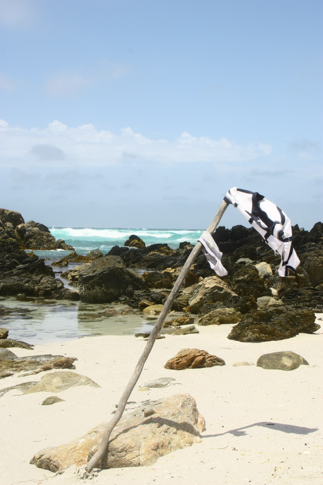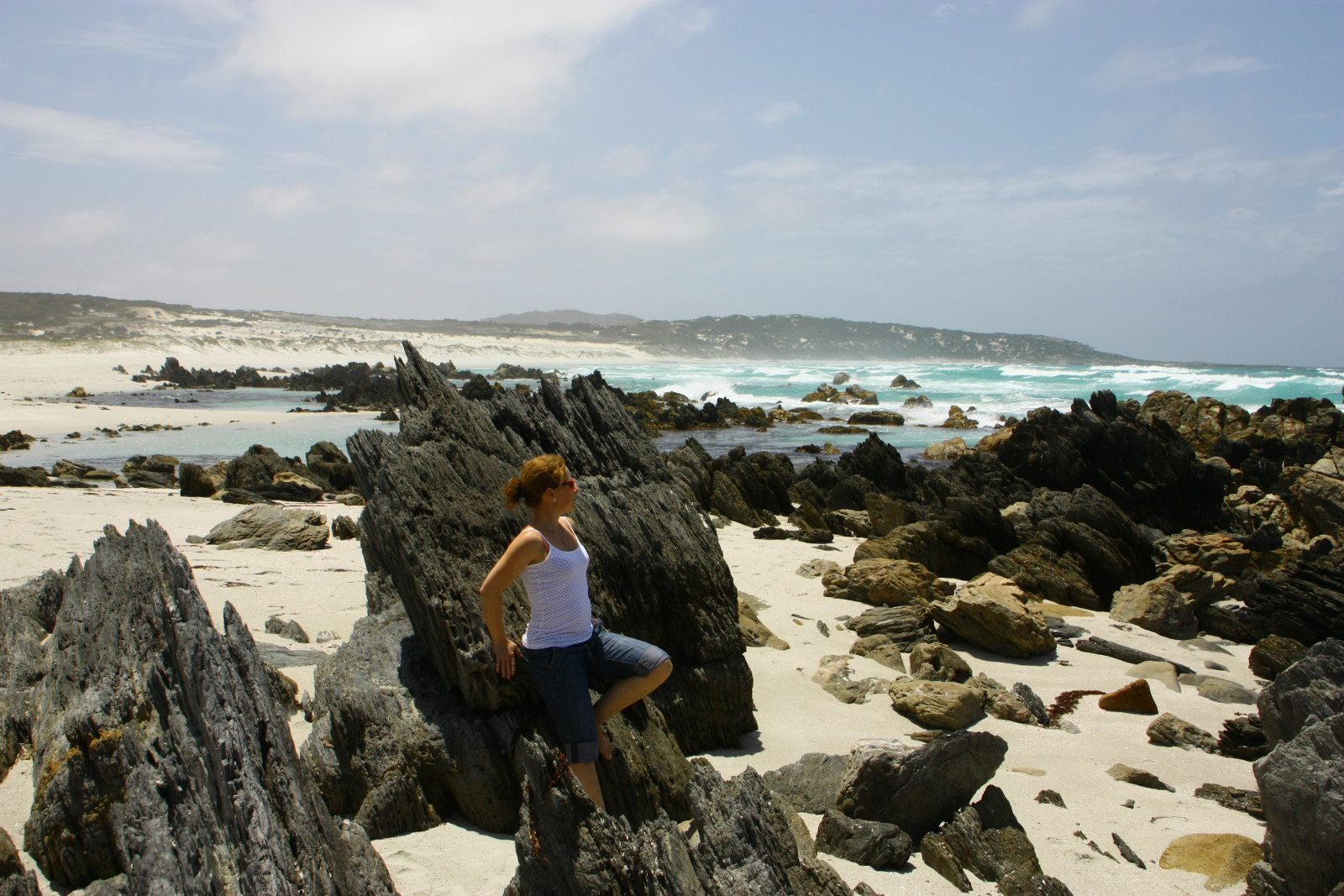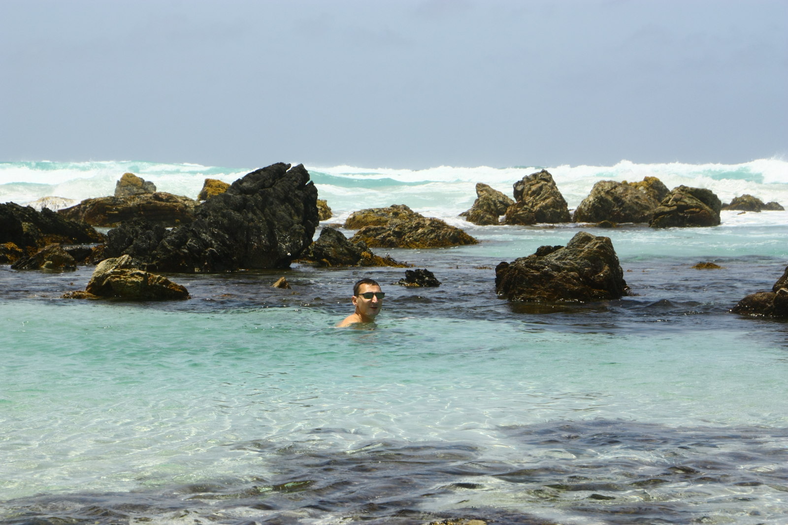 Die Küste ist wunderschön – bizarre schwarze Felsen ragen aus dem schneeweißen Sand ins Meer, hohe Wellen brechen sich daran. Hinter den Felsen haben sich kleine Lagunen mit ruhigem Wasser gebildet, die zum baden einladen. Ein Strandabschnitt besteht komplett aus leeren Muschel- Schneckenhäusern. Annabell will mit dem Sammeln gar nicht mehr aufhören. Mittags ist es trotz starkem Wind warm genug für ein Bad in einer der Lagunen.