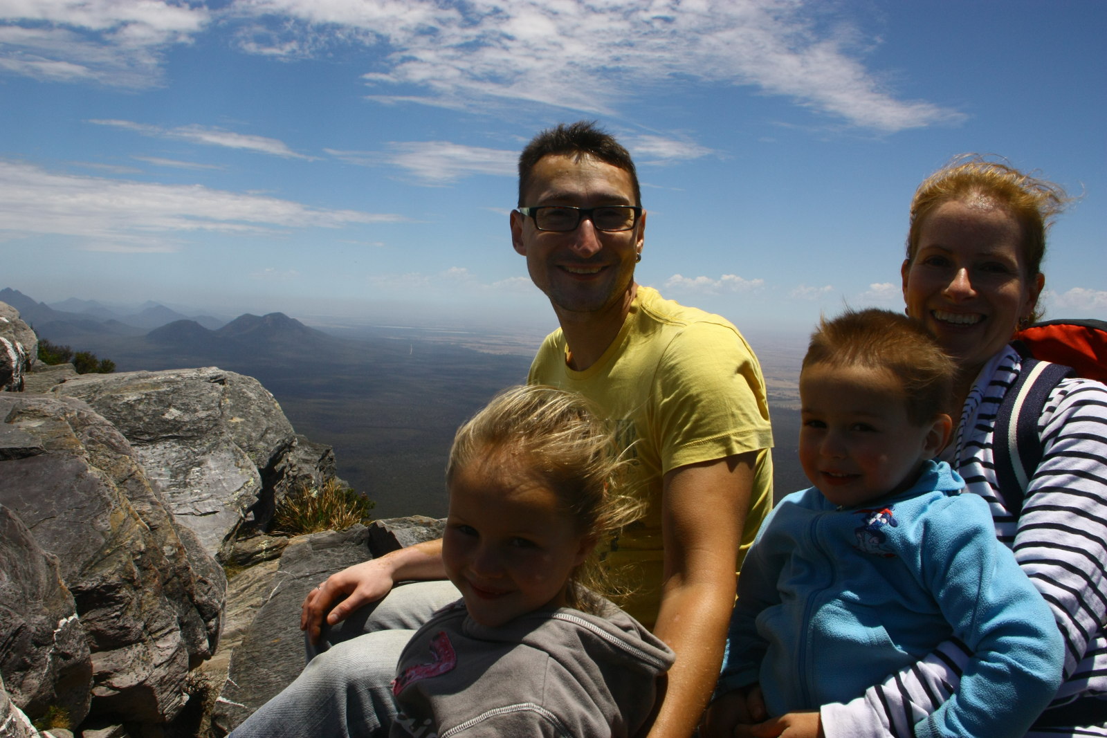 Nach 3 Stunden haben wir den Gipfel erreicht. Beide Kinder haben tapfer durchgehalten. Oben ist es stürmisch, die Aussicht ist atemberaubend.