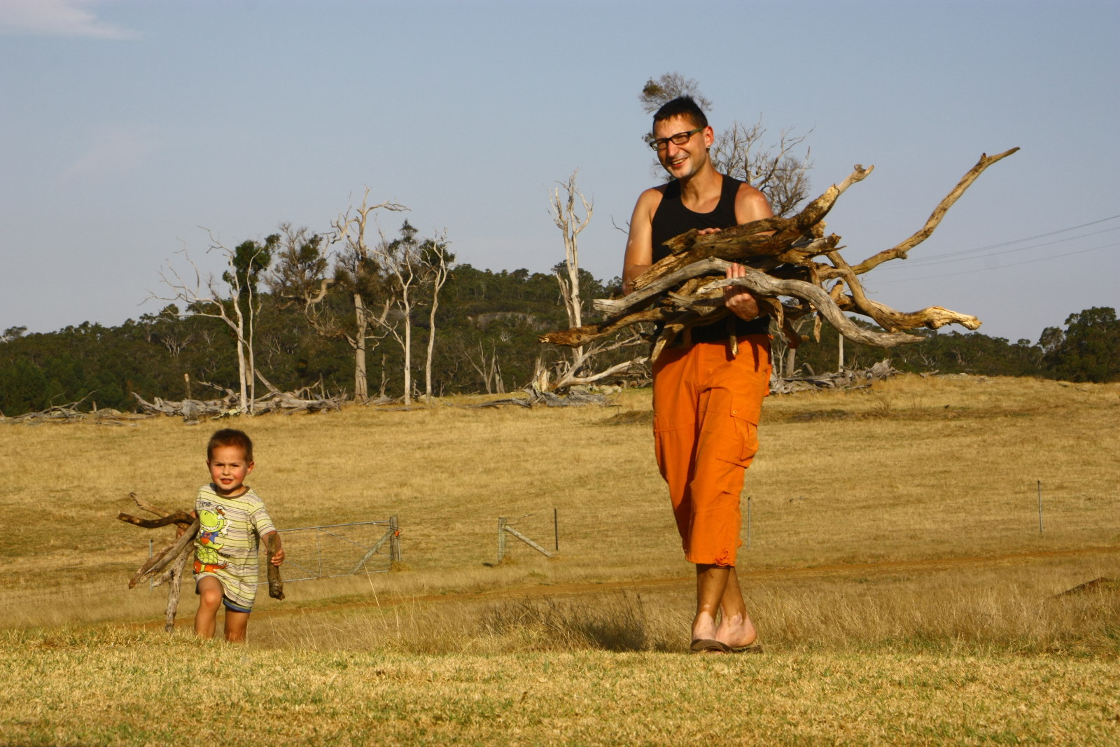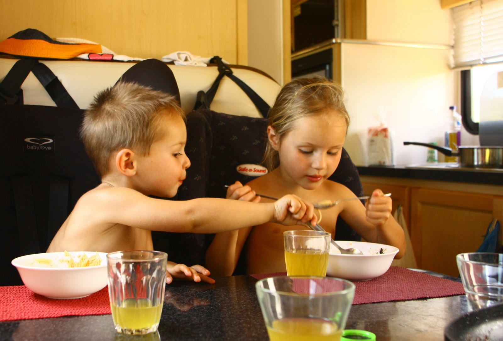 Die Kinder sammeln fleißig Feuerholz, aber am Abend fängt es an zu gewittern. Das Dachfenster vom Camper tropft.