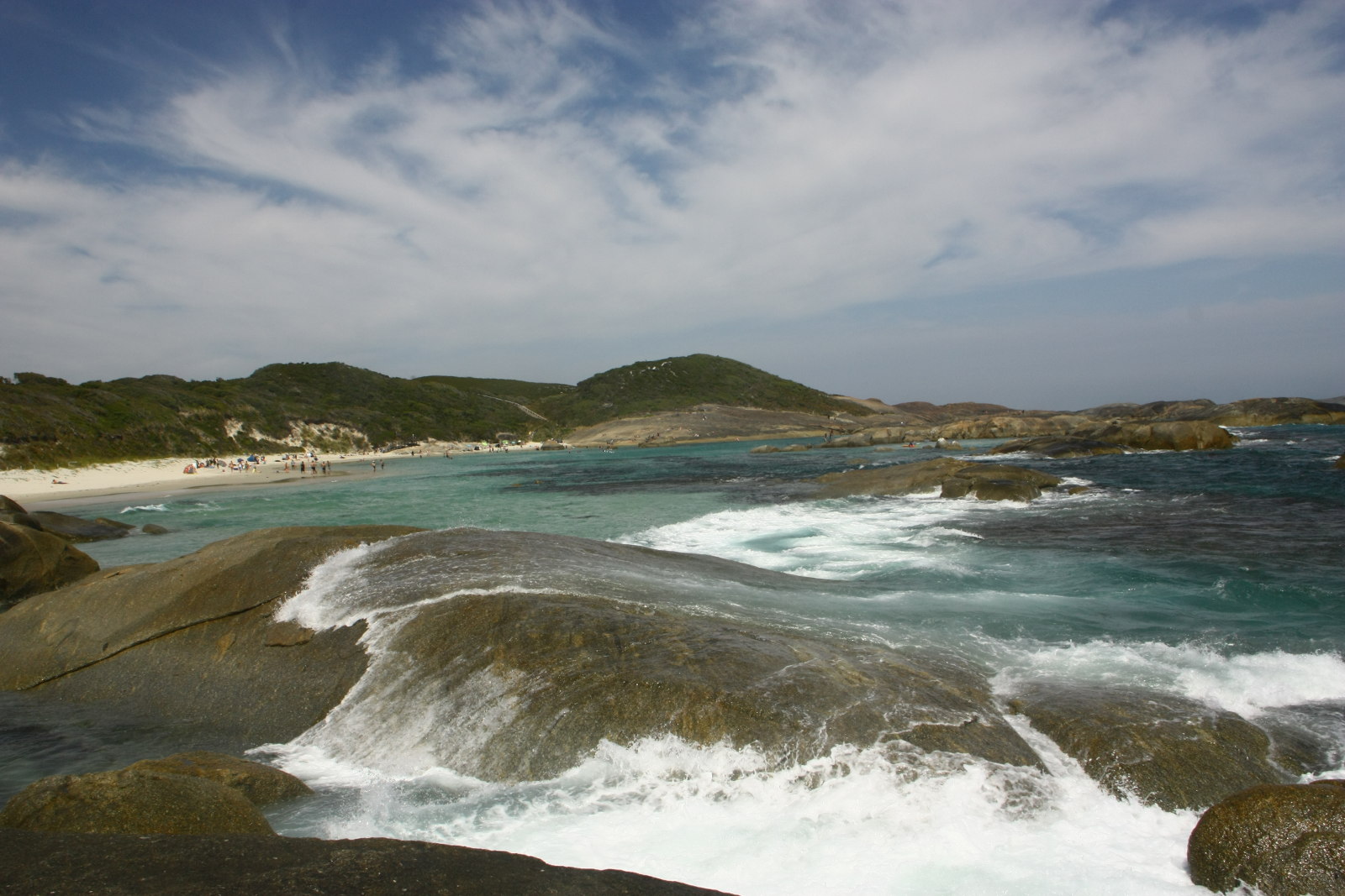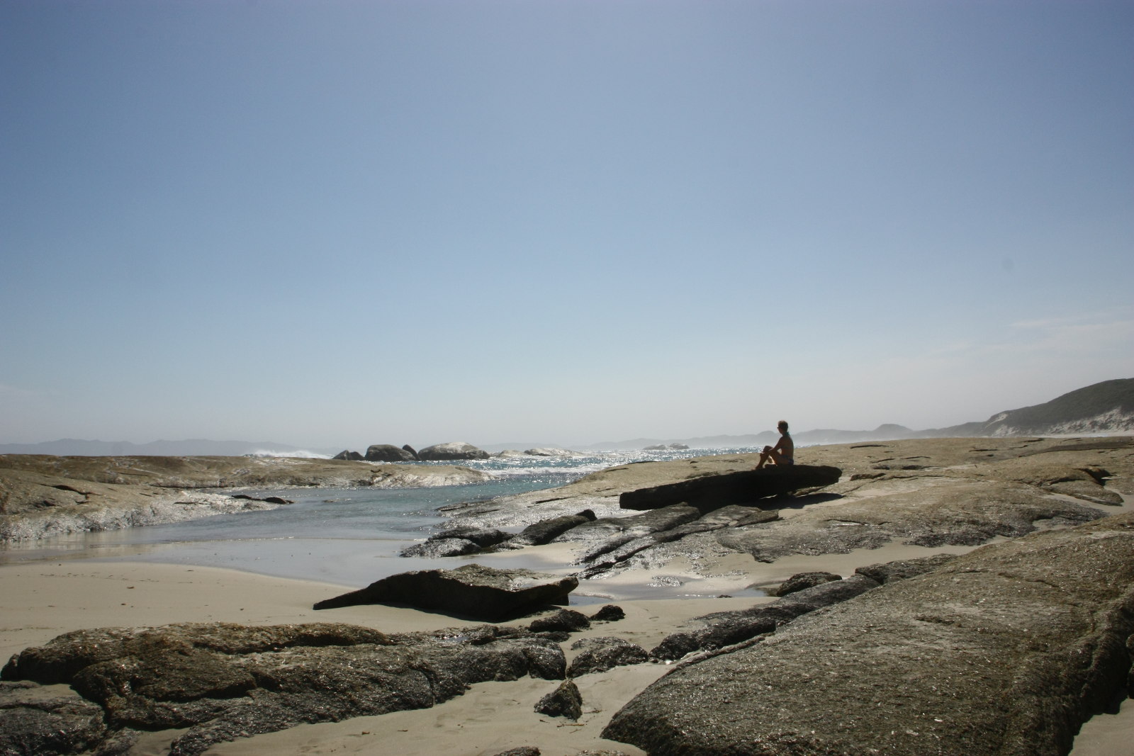 Nach dem Mittagessen gehen wir zum Nachbarstrand, dem „Greens Pool“. Dem Strand vorgelagert sind große Granitbänke, an denen sich meterhohe Wellen brechen. Dahinter sammelt sich das Wasser in großen Lagunen. Ein Stück weiter gehen die Felsen bis an den Strand, dazischen liegt weißer Sand. Wir verbringen hier einen phantastischen Strand-Tag.