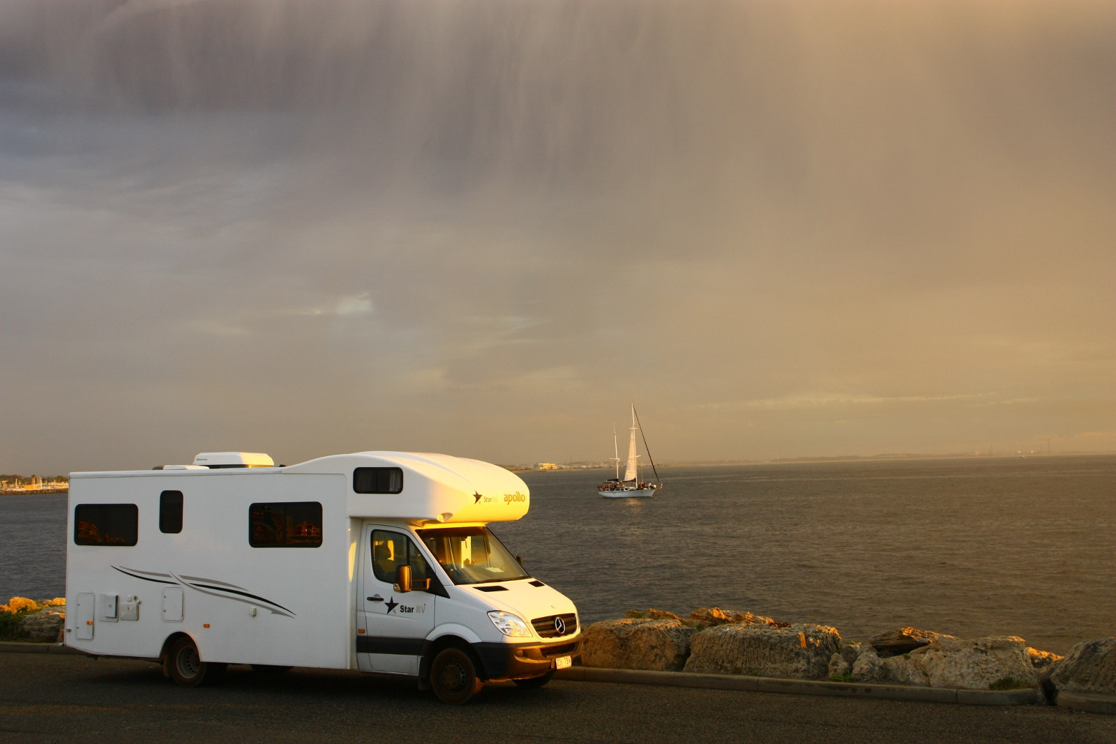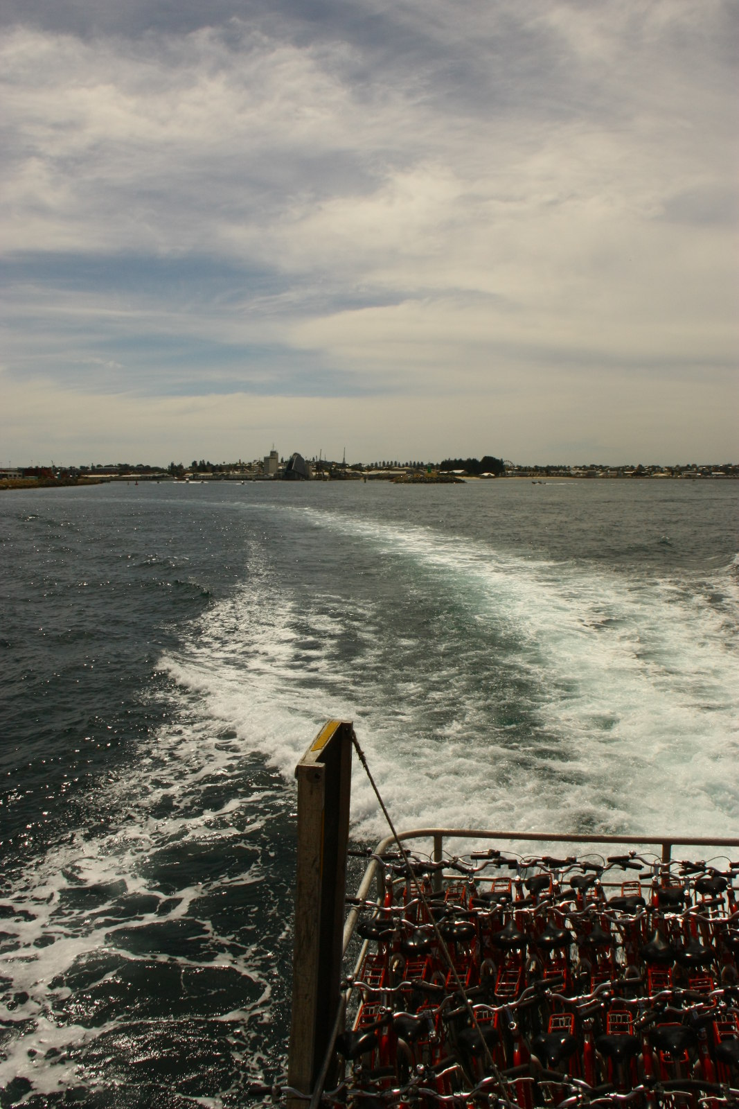 Den Nachmittag verbringen wir am Strand mit Kleckerburg bauen. Am Abend geht es mit der Fähre zurück, wir sind froh, dass wir die späte Fähre haben. Kurz vor Abfahrt brauen sich dunkle Wolken über Rottnest Island zuammen, die uns die ganze Fahrt verfolgen. Als wir in Perth ankommen, bricht die Sonne durch, was ein tolles Bild ergibt.