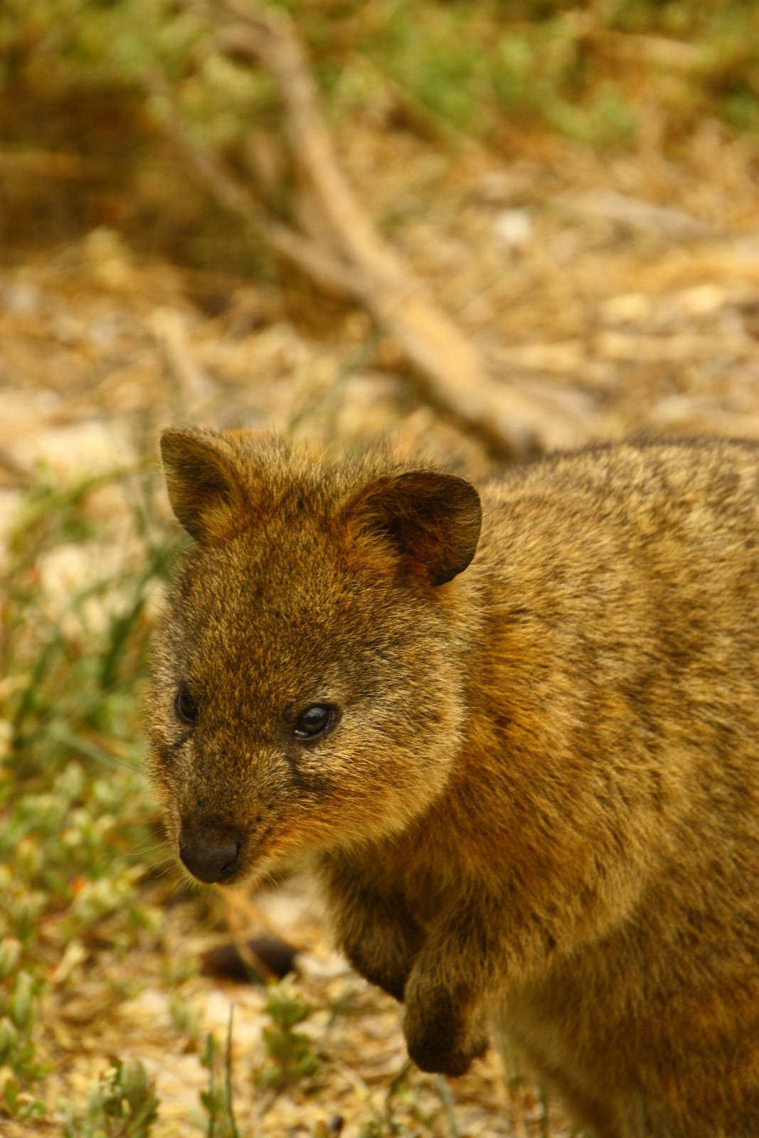 Das Quokka ist ein kleines, mit den Kängurus verwandtes Beuteltier, welches Ähnlichkeit mit einer (recht großen) Ratte hat. Es gibt hier reichlich davon, daher hat die Insel auch ihren Namen „Rattennest“ bekommen. Ursprünglich nachtaktiv haben diese Tiere ihren Rhythmus auf die bei den Touristen beliebteren Zeiten umgestellt, da es da viel mehr zu holen gibt, als in der echten Natur.