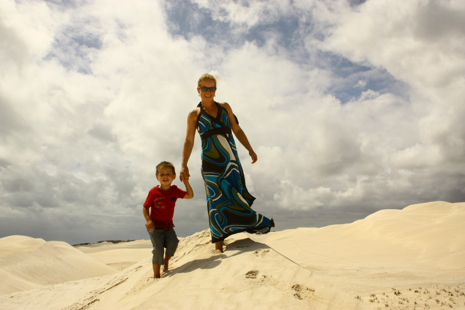 Nach dem Mittagessen kommt die Sonne heraus, so dass wir durch die Sanddünen wandern können. Einige Einheimische sind mit Offroad-Fahrzeugen, Quads und Motorrädern in den Dünen unterwegs. Wir erklettern die höchsten Dünen und laufen auf den Kämmen entlang.
