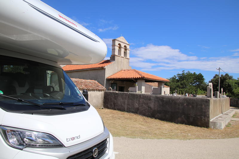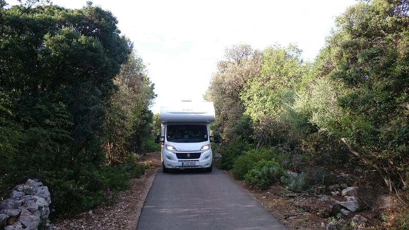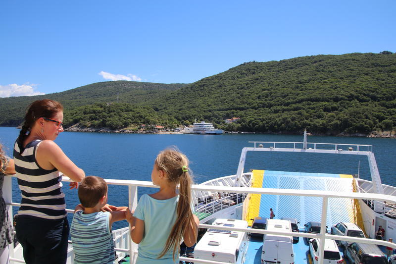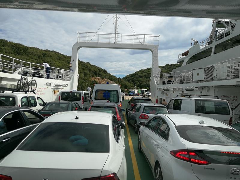 Nach dem Frühstück verabschieden wir uns von den neuen Nachbarn und fahren dann quer durch das grüne Istrien. Die 62 Kilometer lange Strecke, für die das Navi 1:15h veranschlagt, ist äußerst kurvenreich. Kurz vor Brestova geht es steile Serpentinen von den 400 Meter hohen Bergen bis hinab zum Fährhafen. Schon von weitem sehen wir die lange Schlange der Urlauber, die auf die nächste Fähre warten. Kurz vom dem Ende der Schlange gibt es noch ein kleines Wettrennen um einen Platz in der Schlange. Bergab kann auch ein 3,5-Tonnen-Wohnmobil recht schnell fahren.
