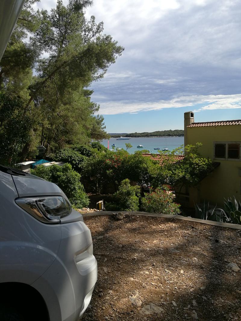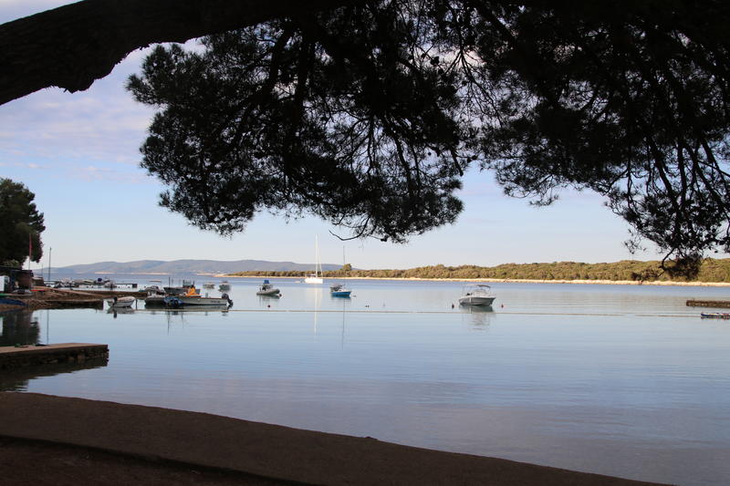 Wir sind bereits um 11:30 am Restaurant. Die Küche hat leider noch geschlossen, so dass wir nur etwas Schinken und Käse essen. Beim Bäcker decken wir uns noch mit einem reichhaltigen Kaffeetrinken ein, dann geht es zum Zeltplatz nach Njivice (hier sind also die Vokale hingekommen). Die Temperaturen sind auf knapp 30 Grad gestiegen, so dass wir den Nachmittag am Strand verbringen.