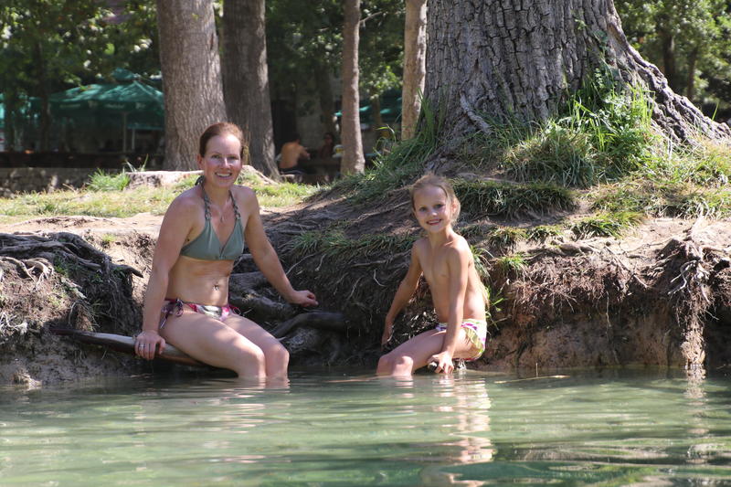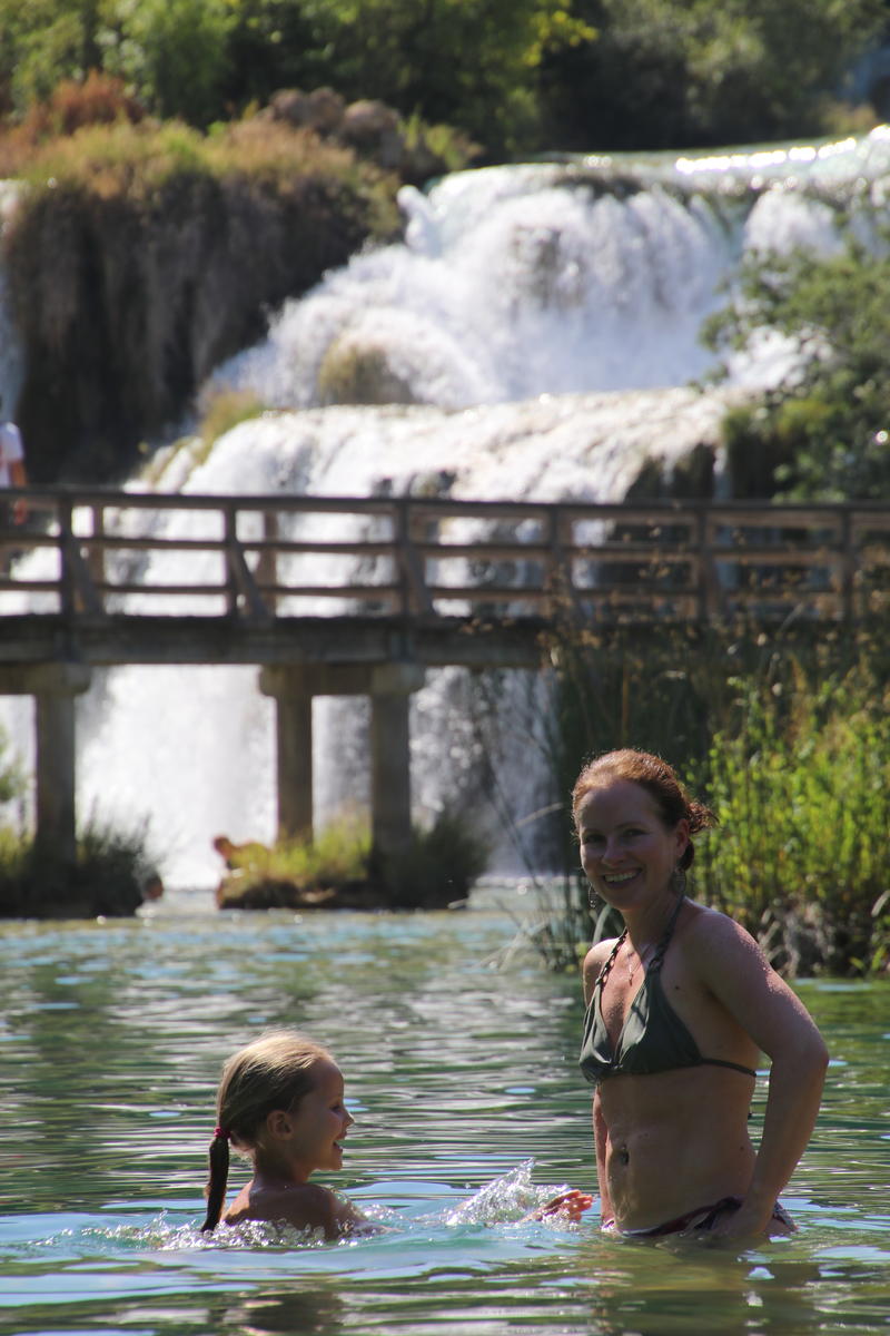 Als wir uns umziehen, ist die Wiese am Fluss noch leer. Ein paar Leute sind im Wasser. Wir schwimmen bis zur Absperrung vor den Wasserfällen.