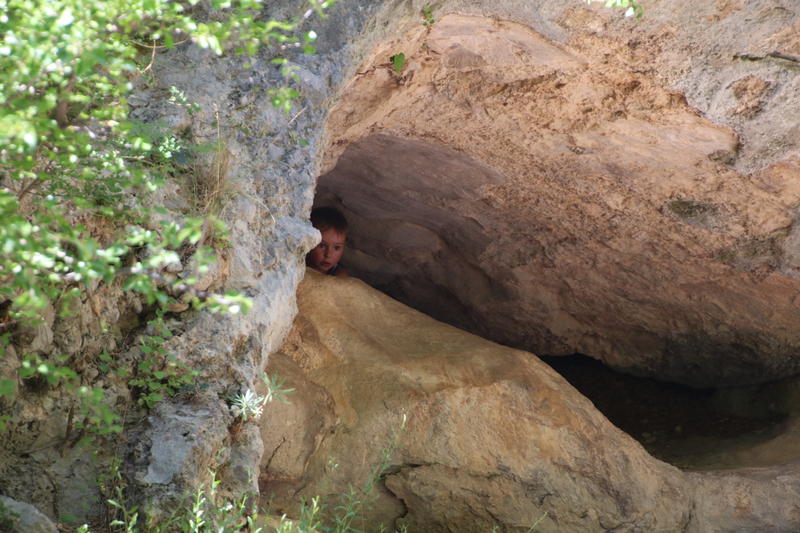 Wir steigen den Wanderweg in die Schlucht hinauf. Der Fluss führt im Sommer kein Wasser, aber überall sind kleine Tümpel und Höhlen. Die Kinder erkunden alles begeistert. Alles ist von der Abendsonne rötlich angestrahlt.