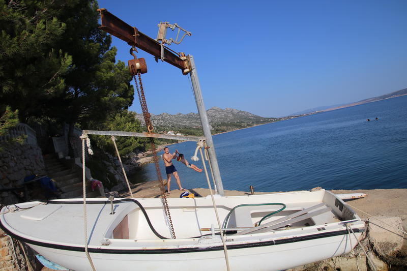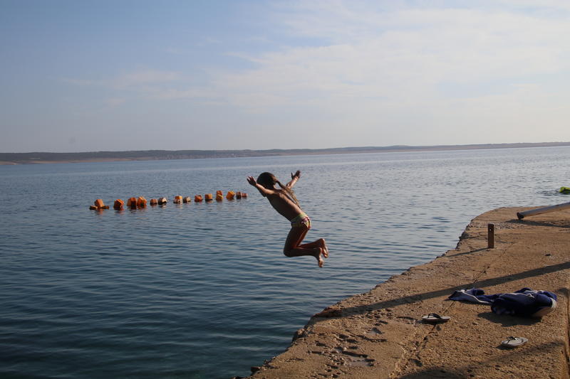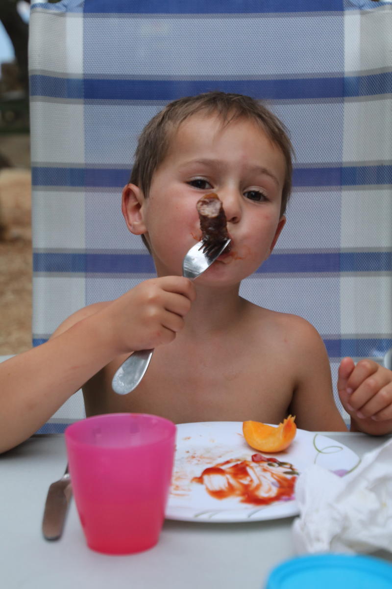 Wir fahren noch etwas weiter zu einem kleinen Campingplatz. Das “Camp Stine” liegt an einem Hang am Meer und hat weniger als 20 Plätze. Nur zwei oder drei sind für größere Wohnmobile geeignet, einer ist zum Glück frei. Wir gehen in der Abendsonne baden, anschließend wird gegrillt.
