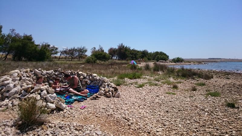 Wir fahren weiter über eine lange Brücke zum südlichen Ende der Insel Pag. Diese ist schmal und langgezogen, unser Tagesziel liegt ganz im Norden der Insel. Auf halber Strecke machen wir Mittagsstopp an einem kleinen Kiesstrand, an dem auch einige Einheimische Baden sind. Anke hat heute früh schon Milchreis vorgekocht, so dass wir schon bald wieder weiter fahren.