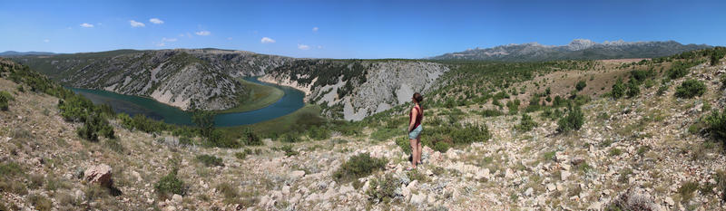 Wir schlafen aus und starten nach einem späten Frühstück erst gegen 11. Heute wollen wir das Festland verlassen und auf die Insel Pag fahren. Doch zuvor machen wir einen Abstecher zum Fluss Zrmanja, der nicht allzuweit entfernt durch die Berglandschaft mäandert. Als wir von der Hauptstraße auf eine kleine Nebenstraße abzweigen, bietet sich und ein beeindruckender Blick auf den Fluss.