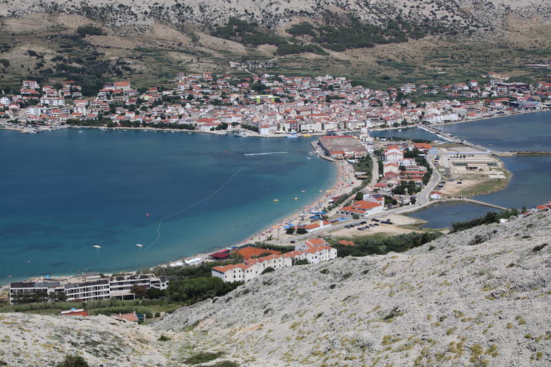 Die kleine Hauptstadt Pag, deren zwei Teile durch Brücken verbunden sind, durchqueren wir nur - und sehen sie wenig später von einem Aussichtspunkt der Serpentinenstraße von oben wieder.
