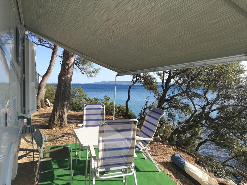 Der Platz ist direkt am Meer. Gleich neben dem Wohnmobil geht eine kleine Treppe auf einen Steg. Ein paar Meter enfernt ist auch eine kleine Badebucht.