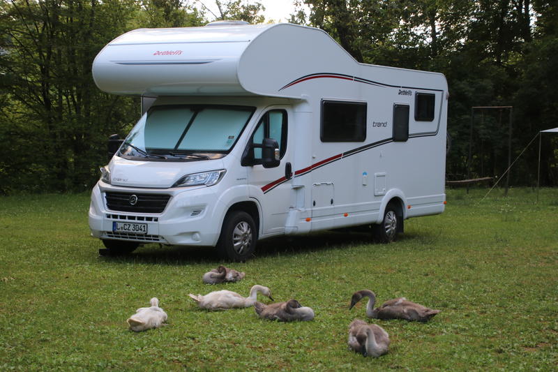 Wir fahren knapp 2 Stunden vorbei an Ljubljana, der Hauptstadt Sloweniens. Dort finden wir einen kleinen Campingplatz im Grünen, direkt am Fluss Sava gelegen. Auf einer Wiese direkt am Fluss ist ein großer freier Stellplatz.