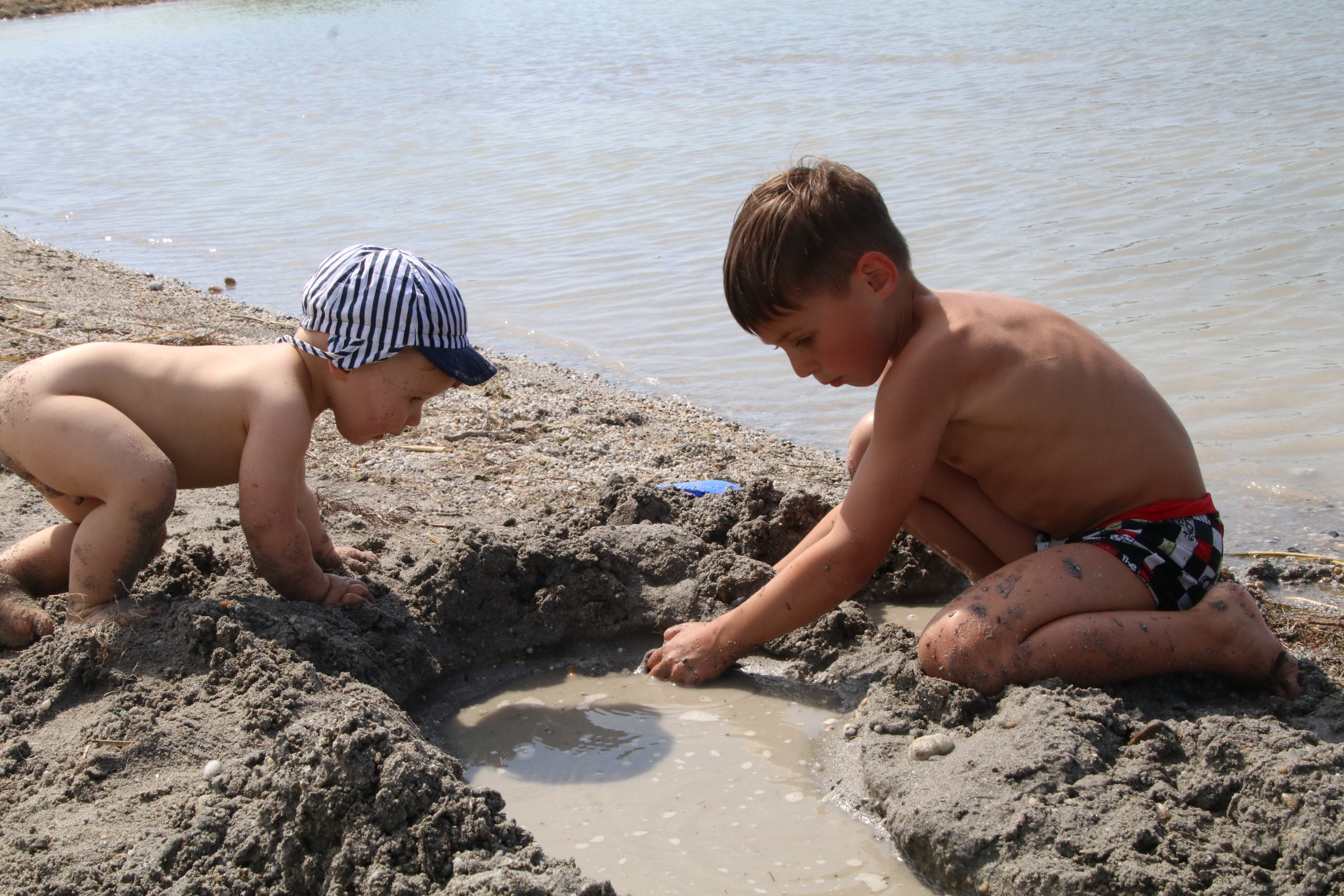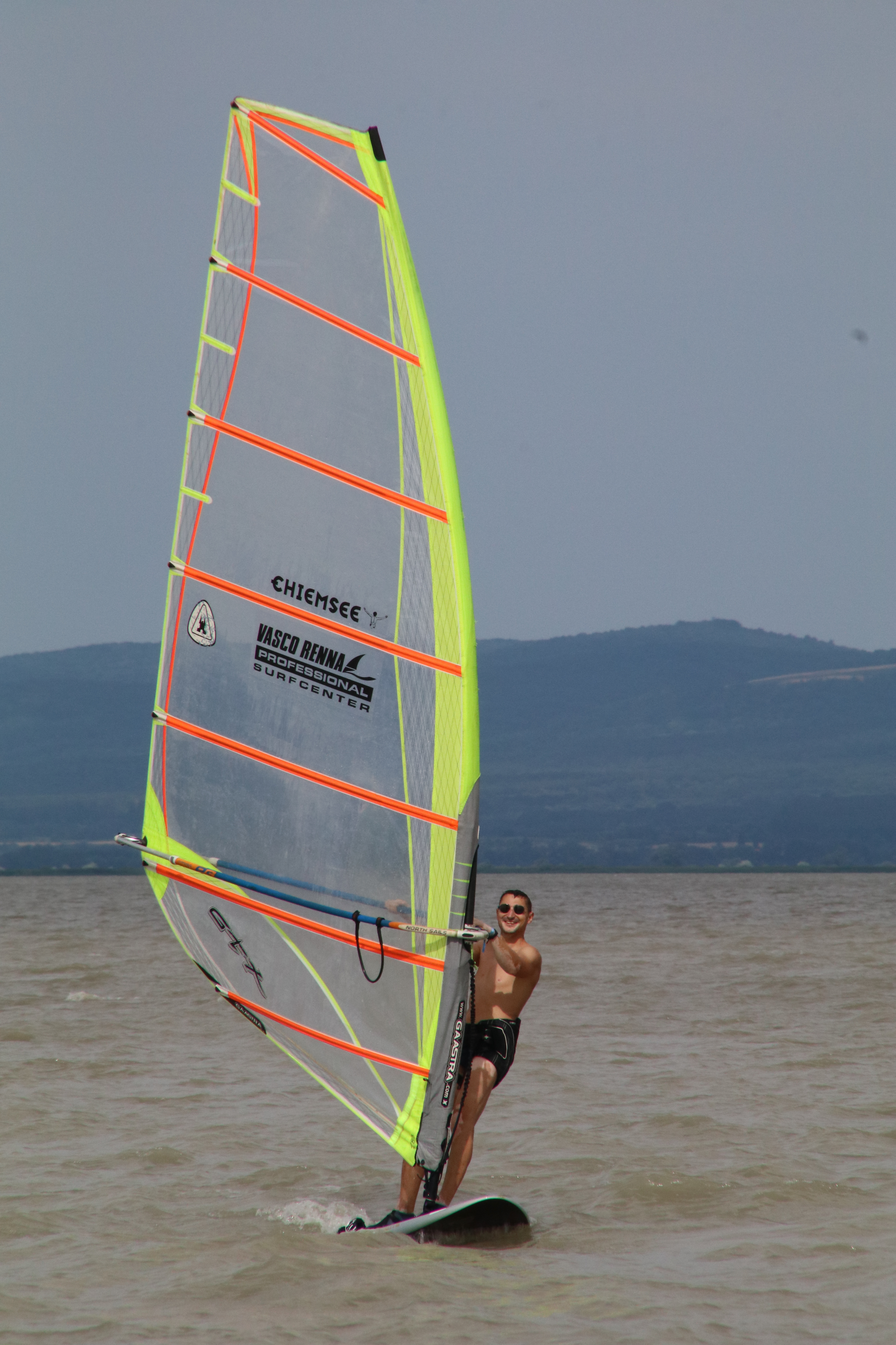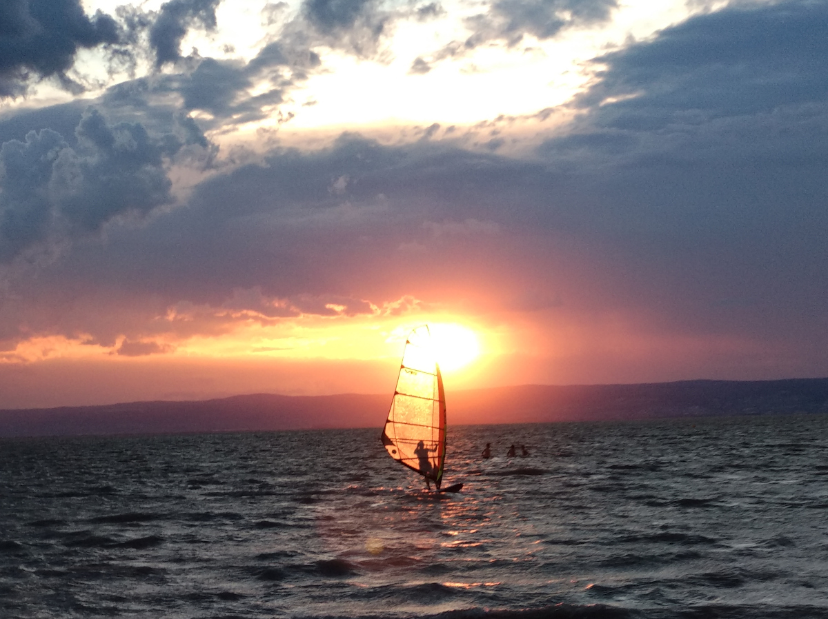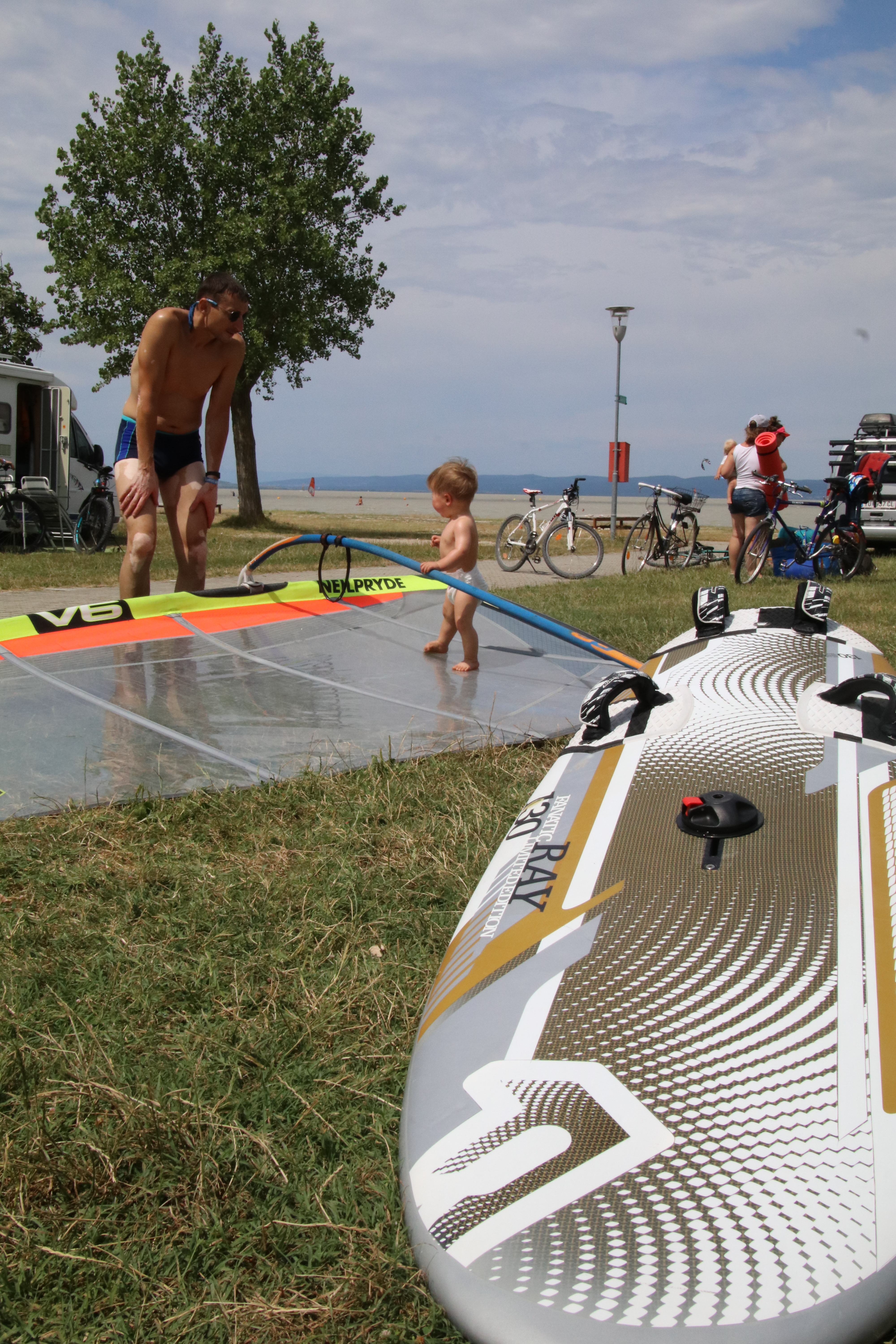 Die Kinder verbringen den Tag im Wasser. Leider ist kein Surfwind. Am Nachmittag fahre ich trotzdem eine kleine Runde mit dem Brett.