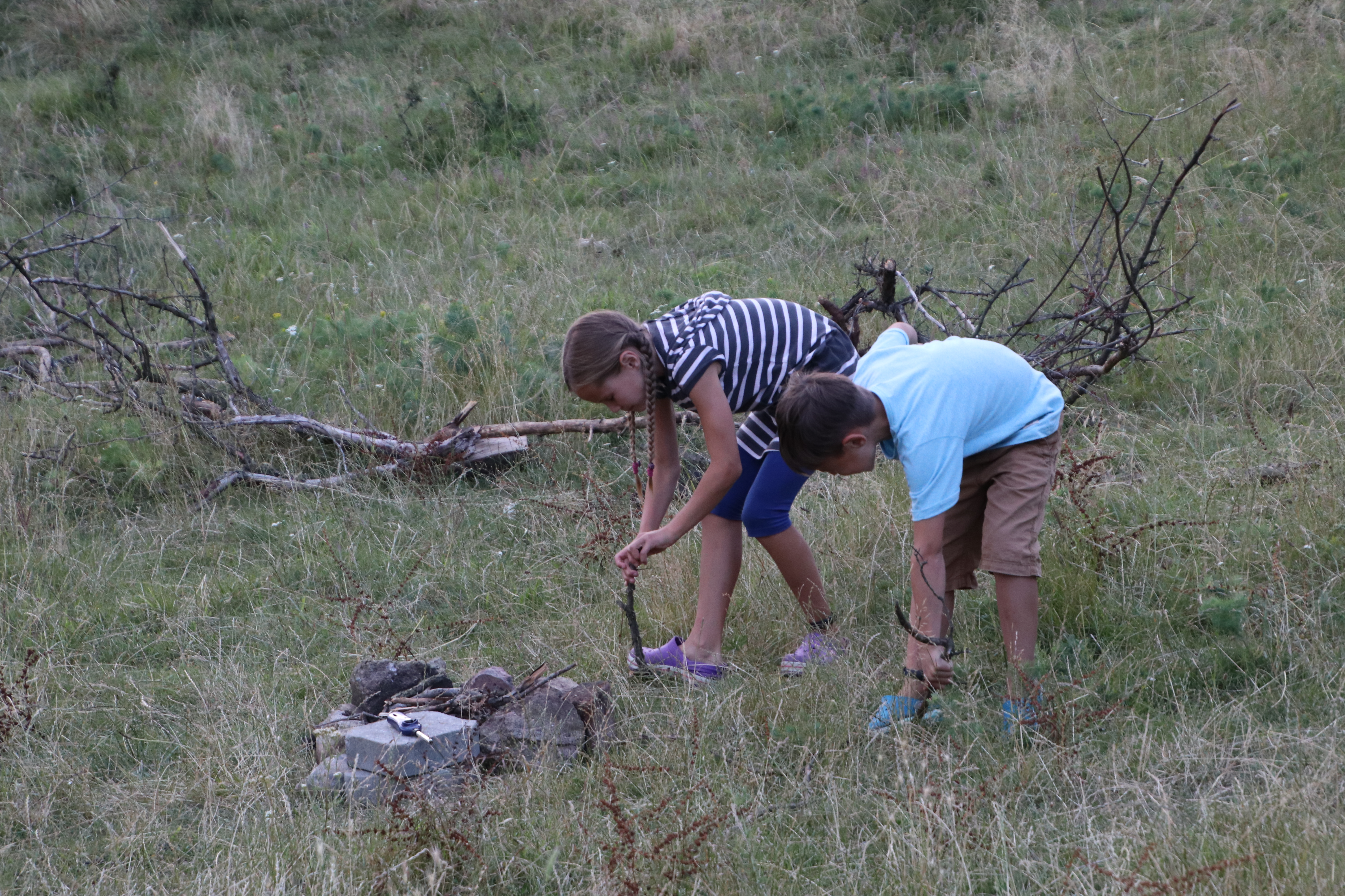 Wir essen draußen Abendbrot, dabei kommt die Sonne heraus. Danach sammeln die Kinder Feuerholz und Steine für einen Feuerkreis. Kurz darauf prasselt ein fröhliches kleines Lagerfeuer.