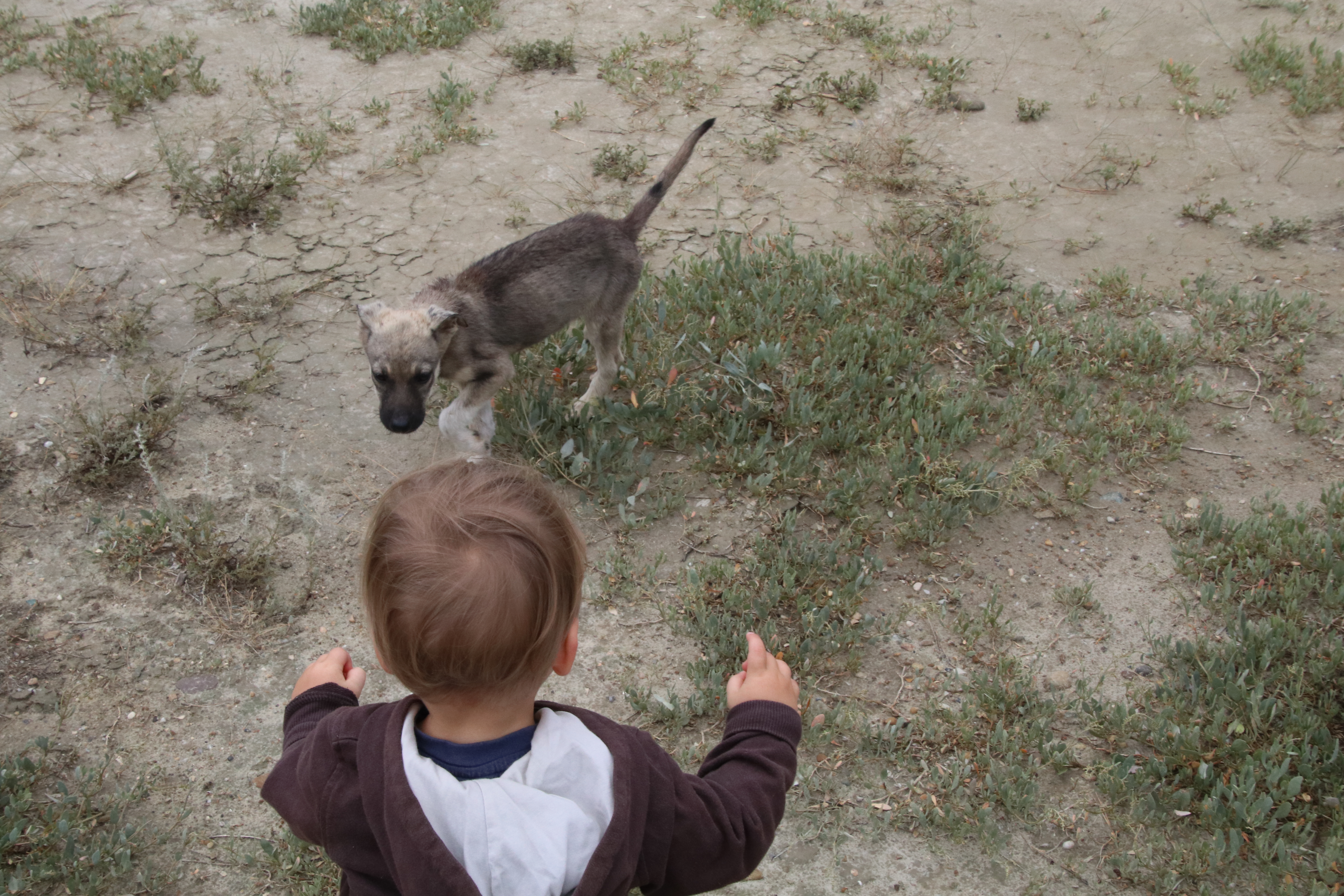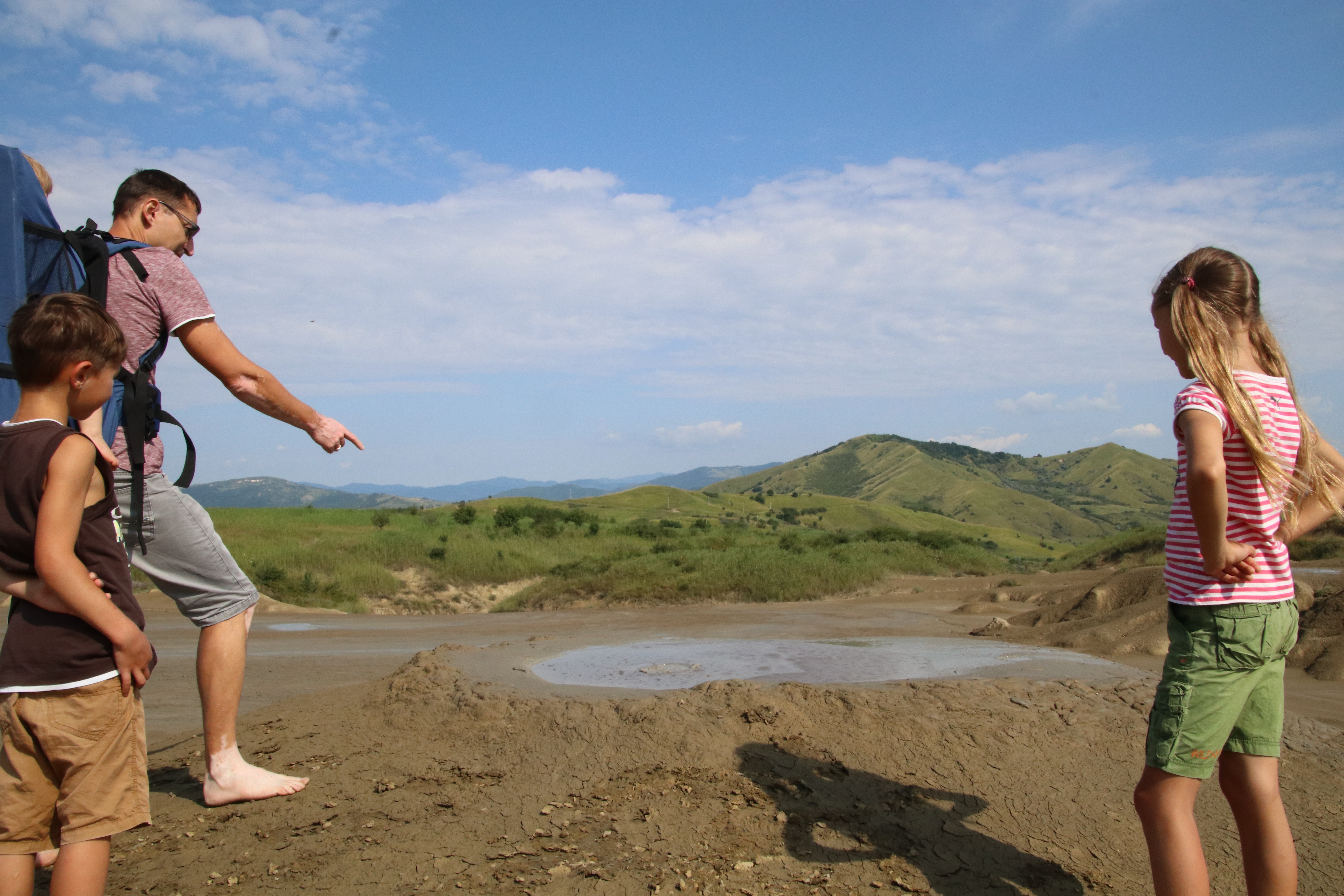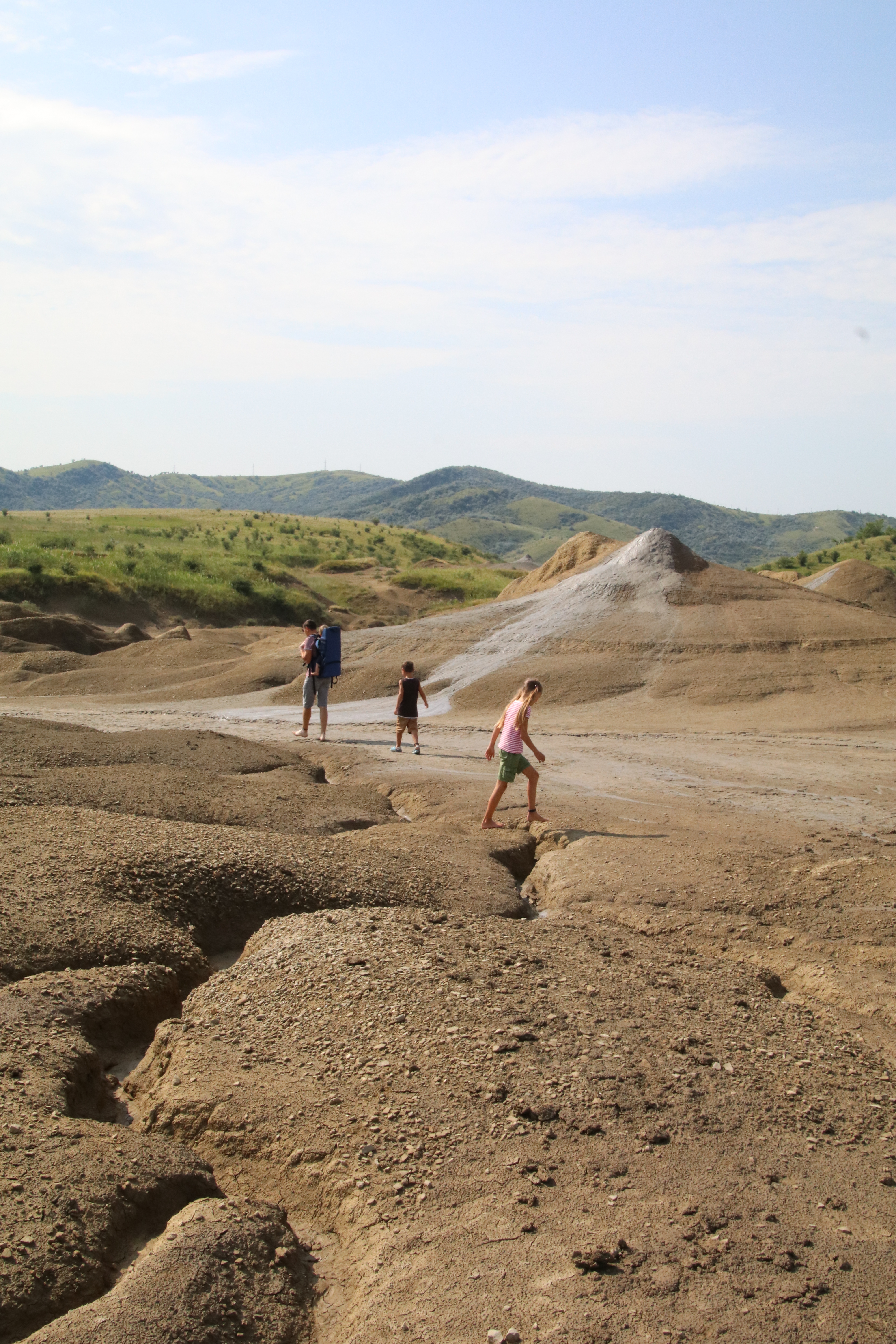 Heute früh scheint die Sonne und wir versuchen uns erneut an den Schlammvulkanen. Da Mattis schon müde ist, darf er in die Kraxe. Nachdem die Schuhe gestern eine dicke Schlammkruste hatten, gehen Annabell und ich gleich barfuß.