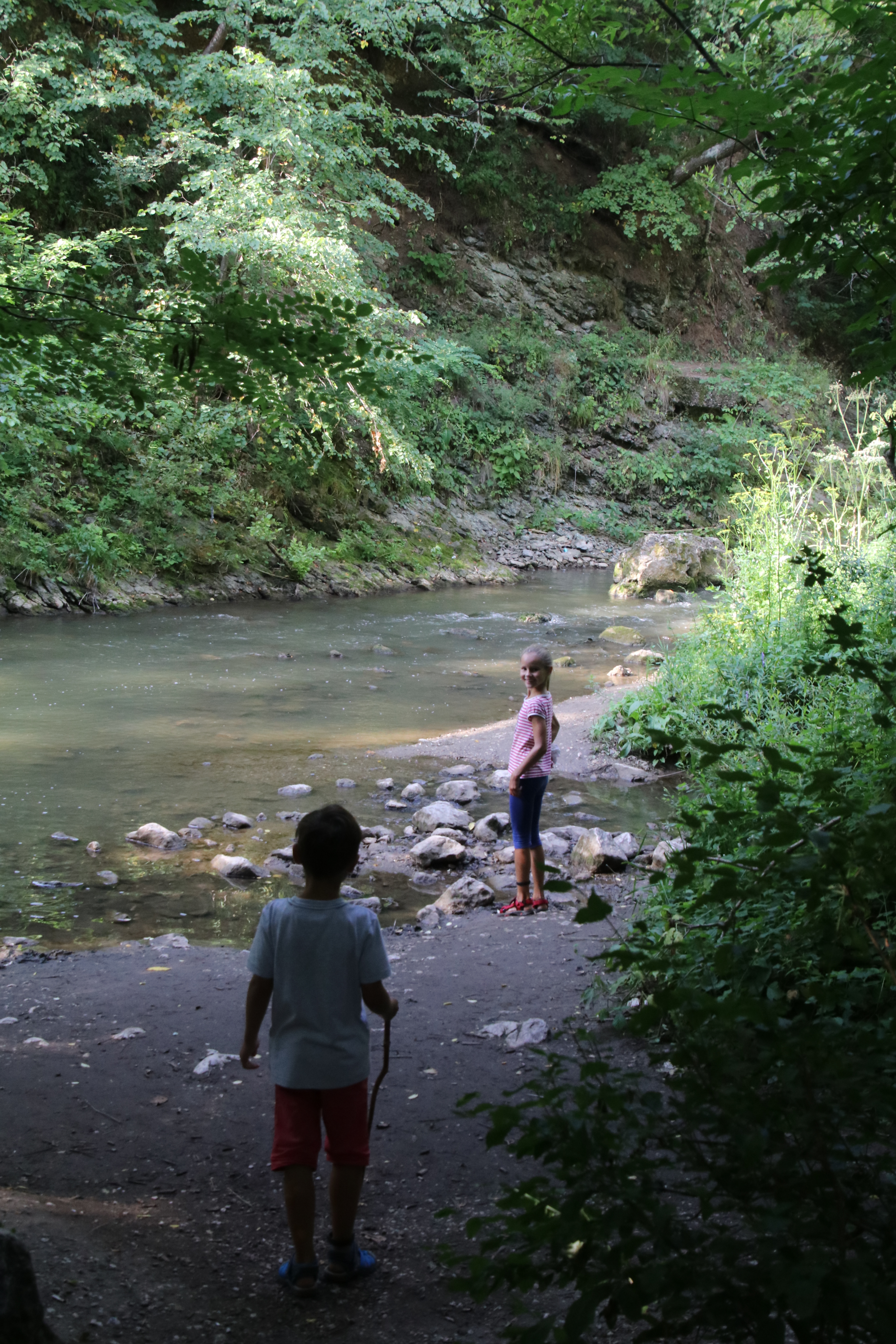 Nachdem wir gefrühstückt haben, starten wir unsere heutige Wanderung. Es ist sonnig mit ein paar kleinen Wölkchen hier und da. Zuerst geht es am Ufer eines Flüsschens am Grunde der Schlucht entlang.