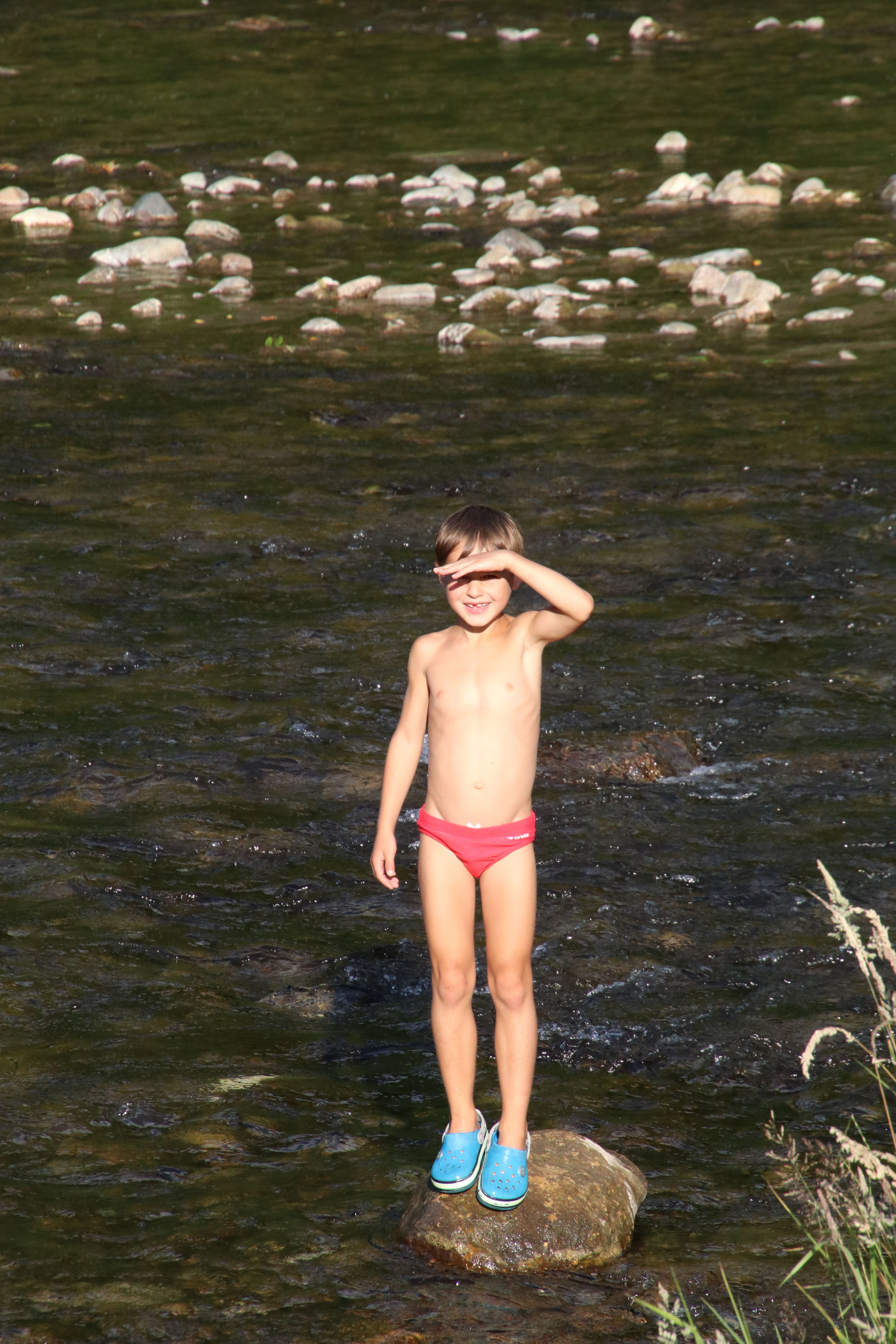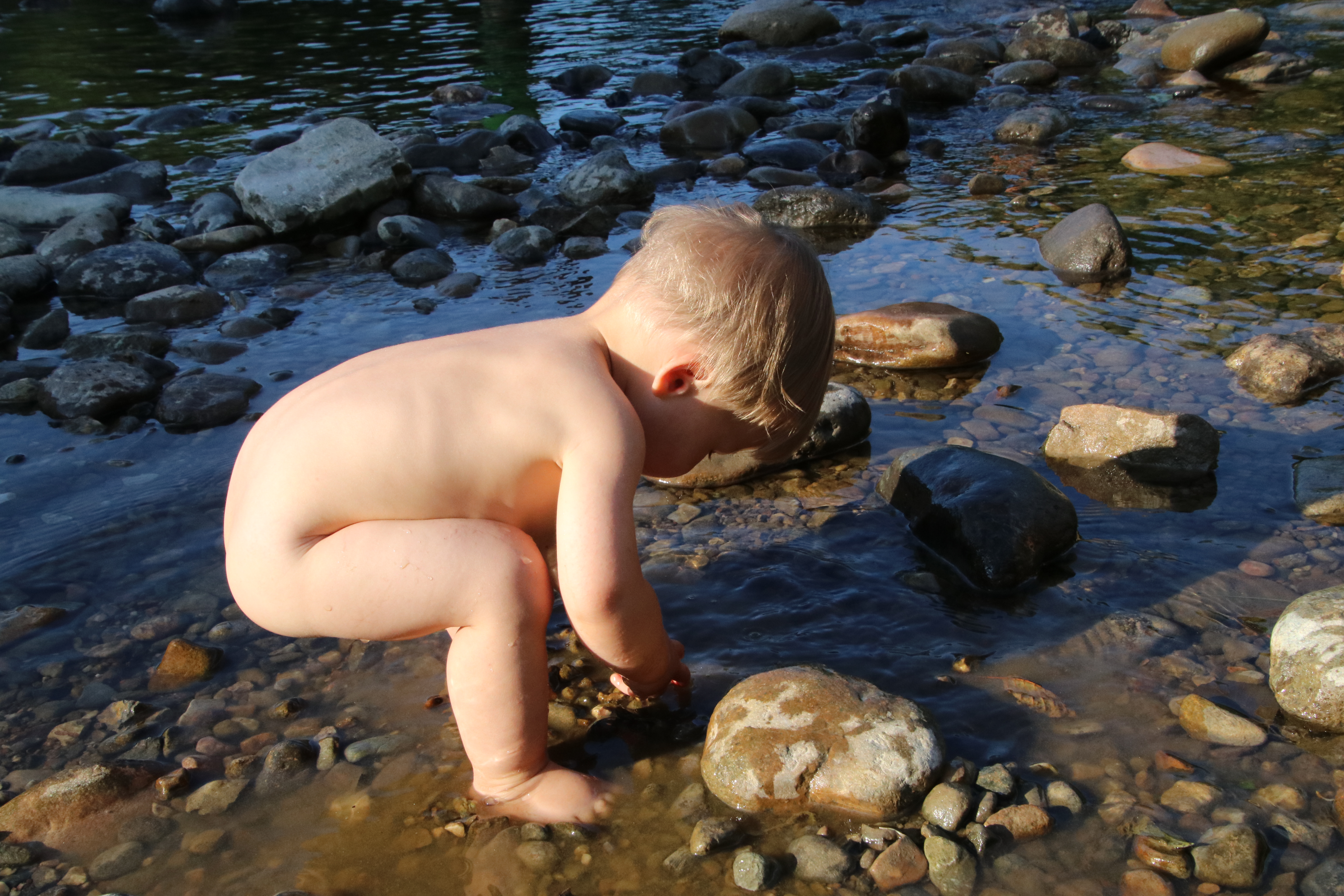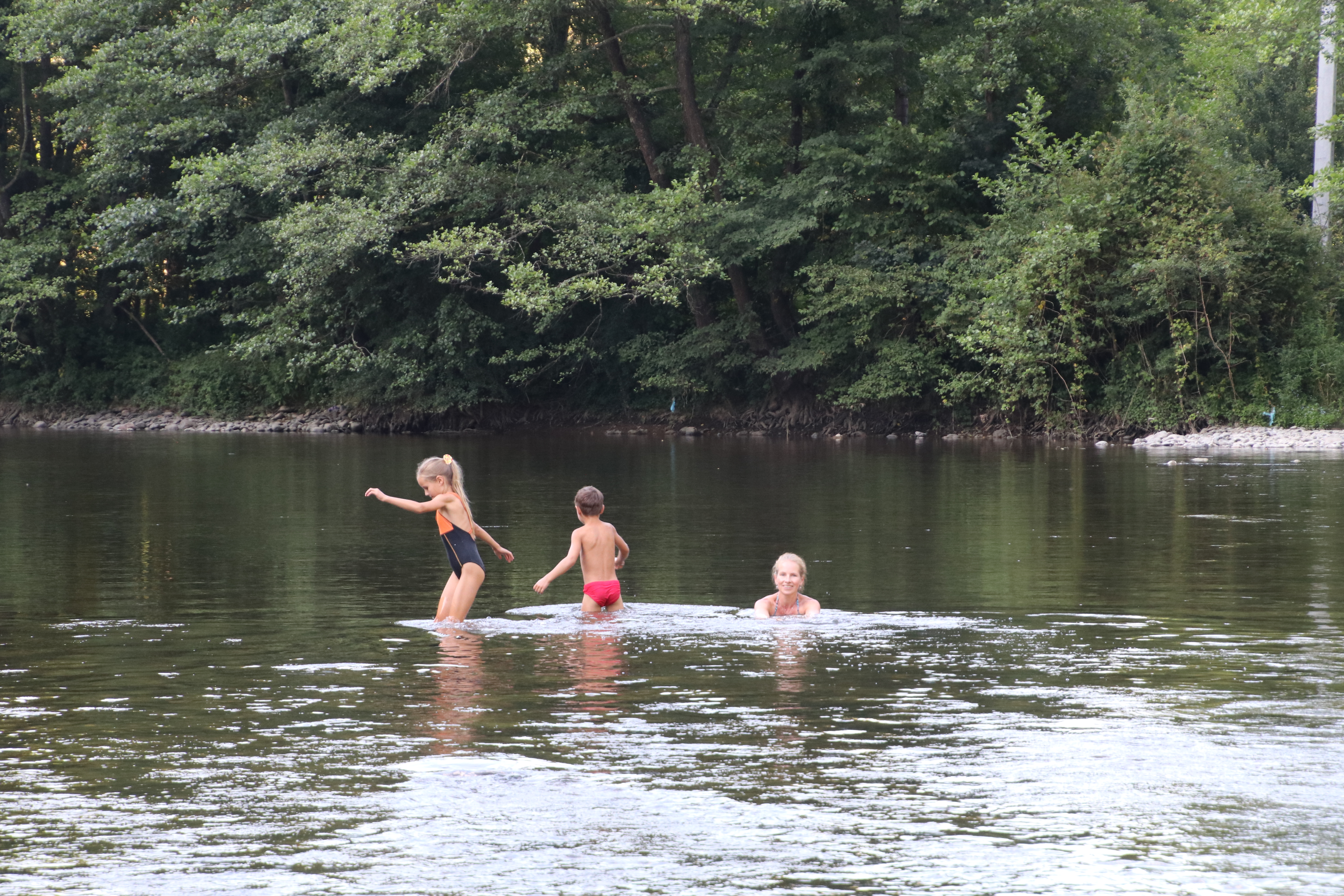 Nach dem Abendbrot gehen Anke und die Kinder noch im Fluss baden.