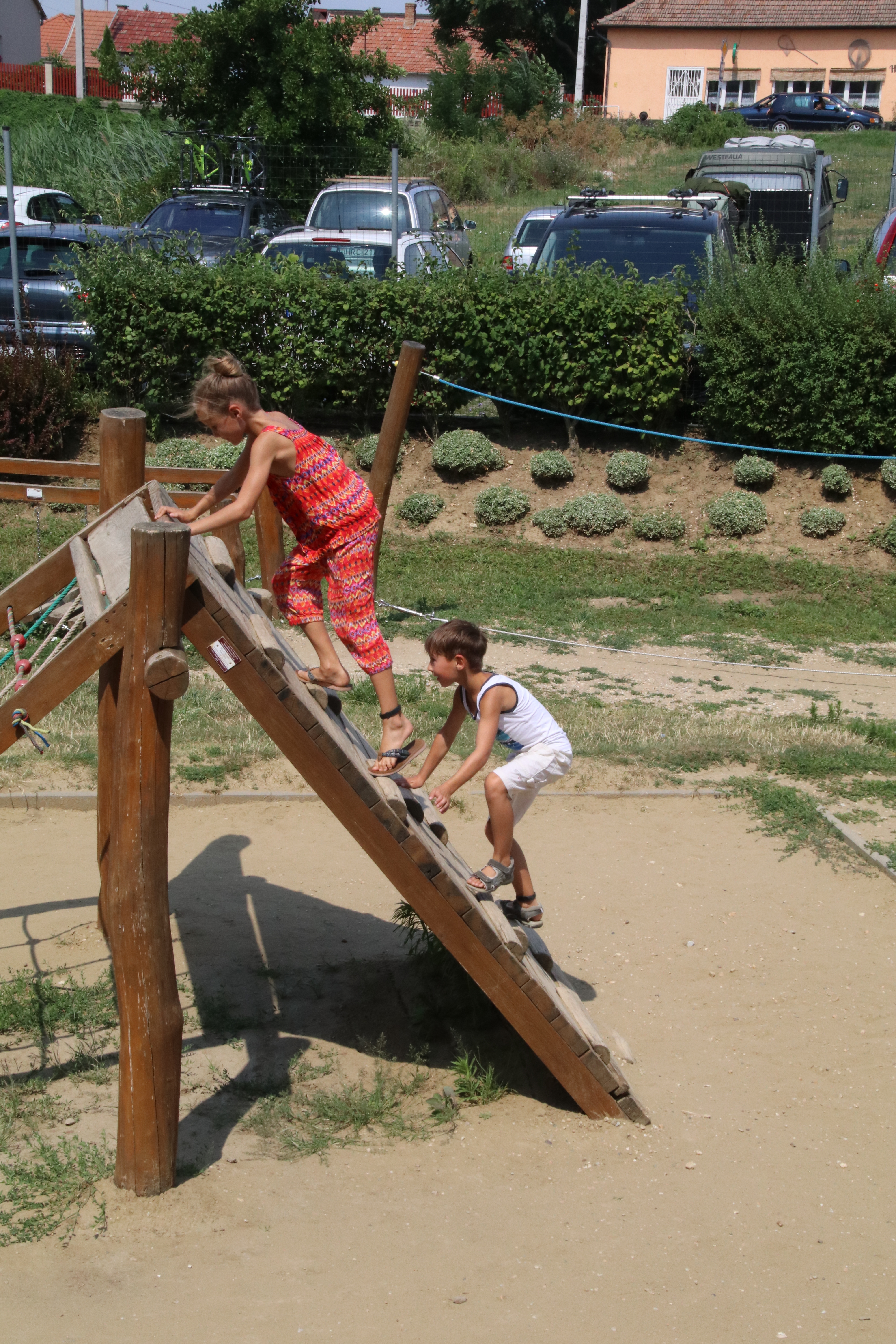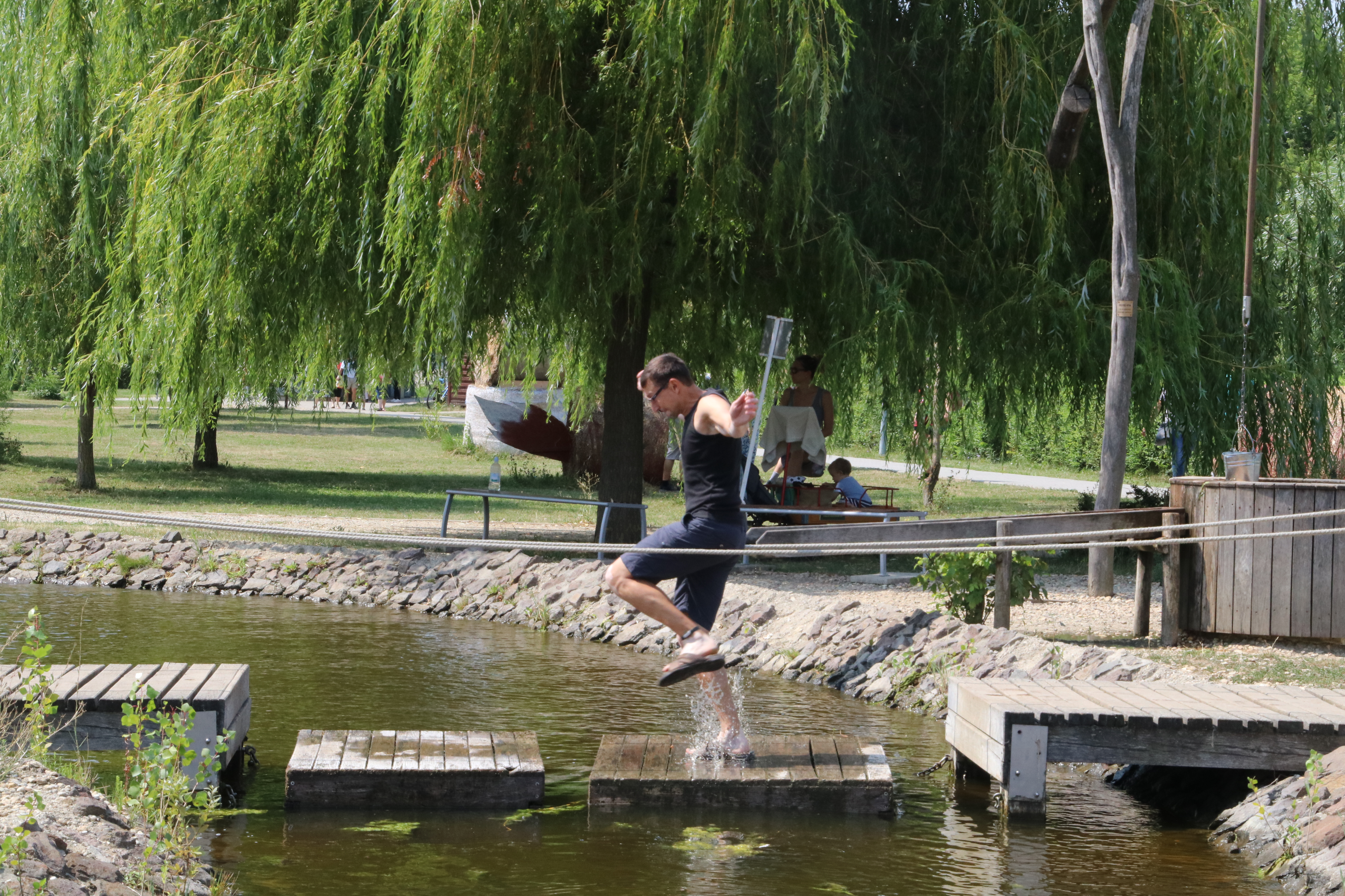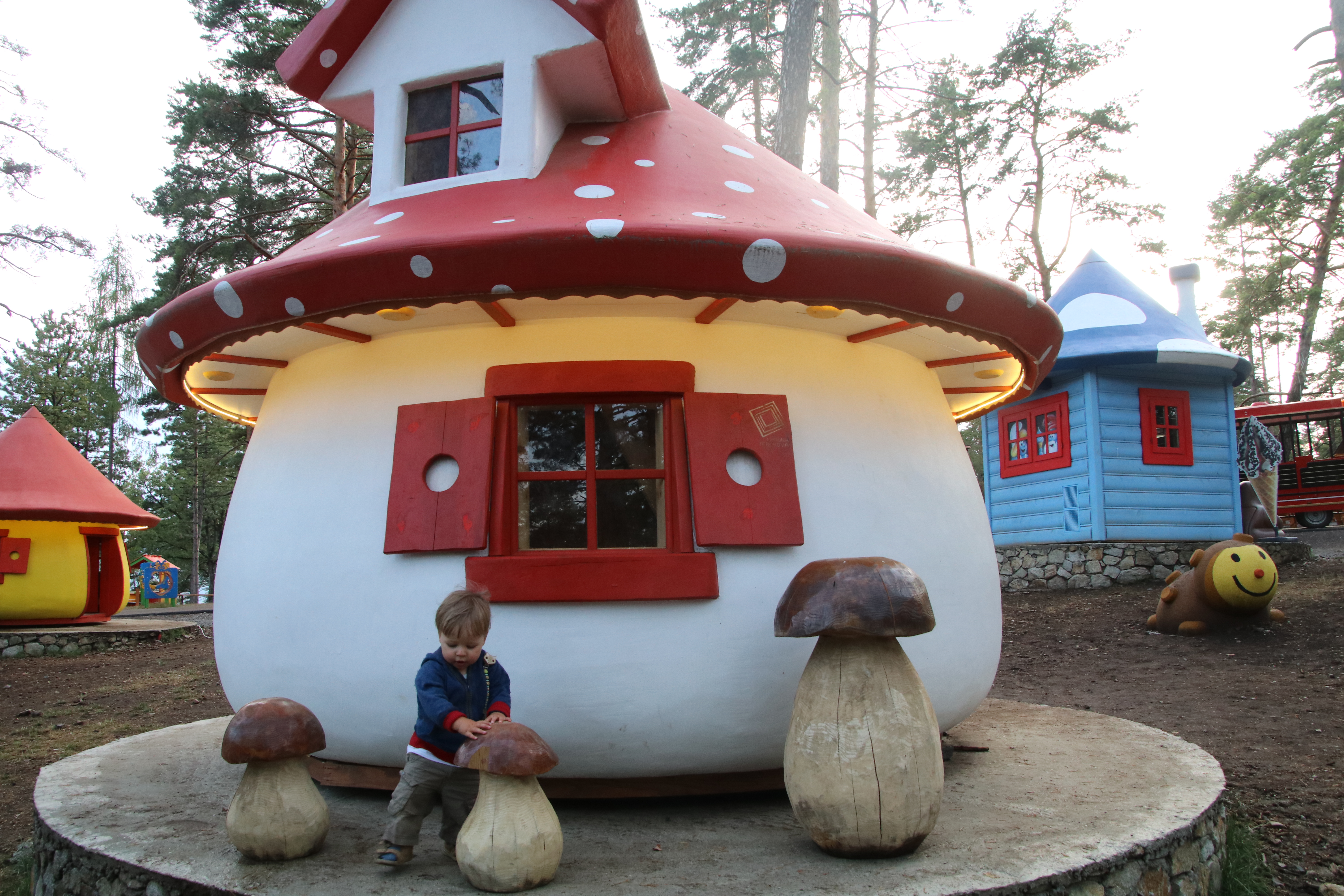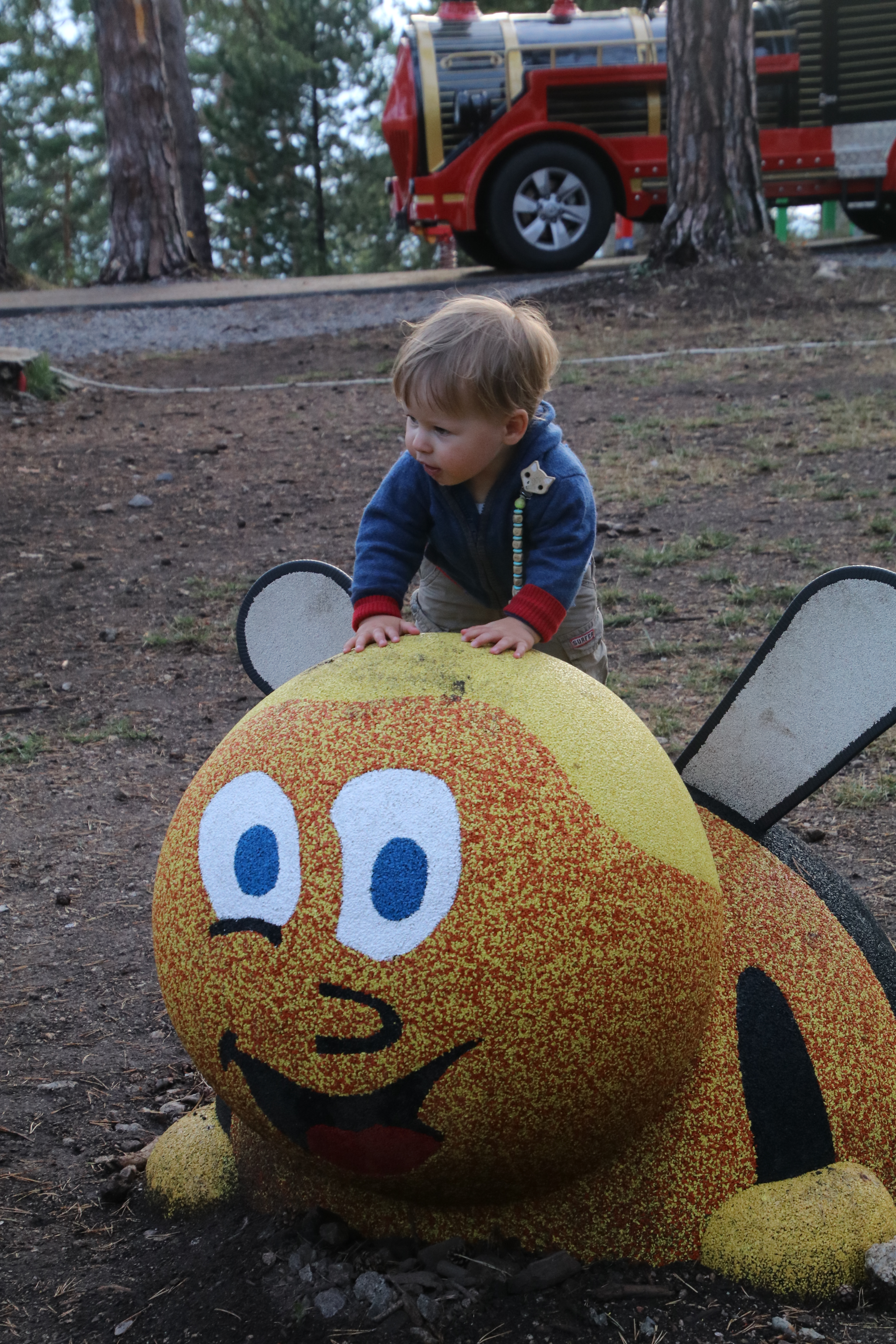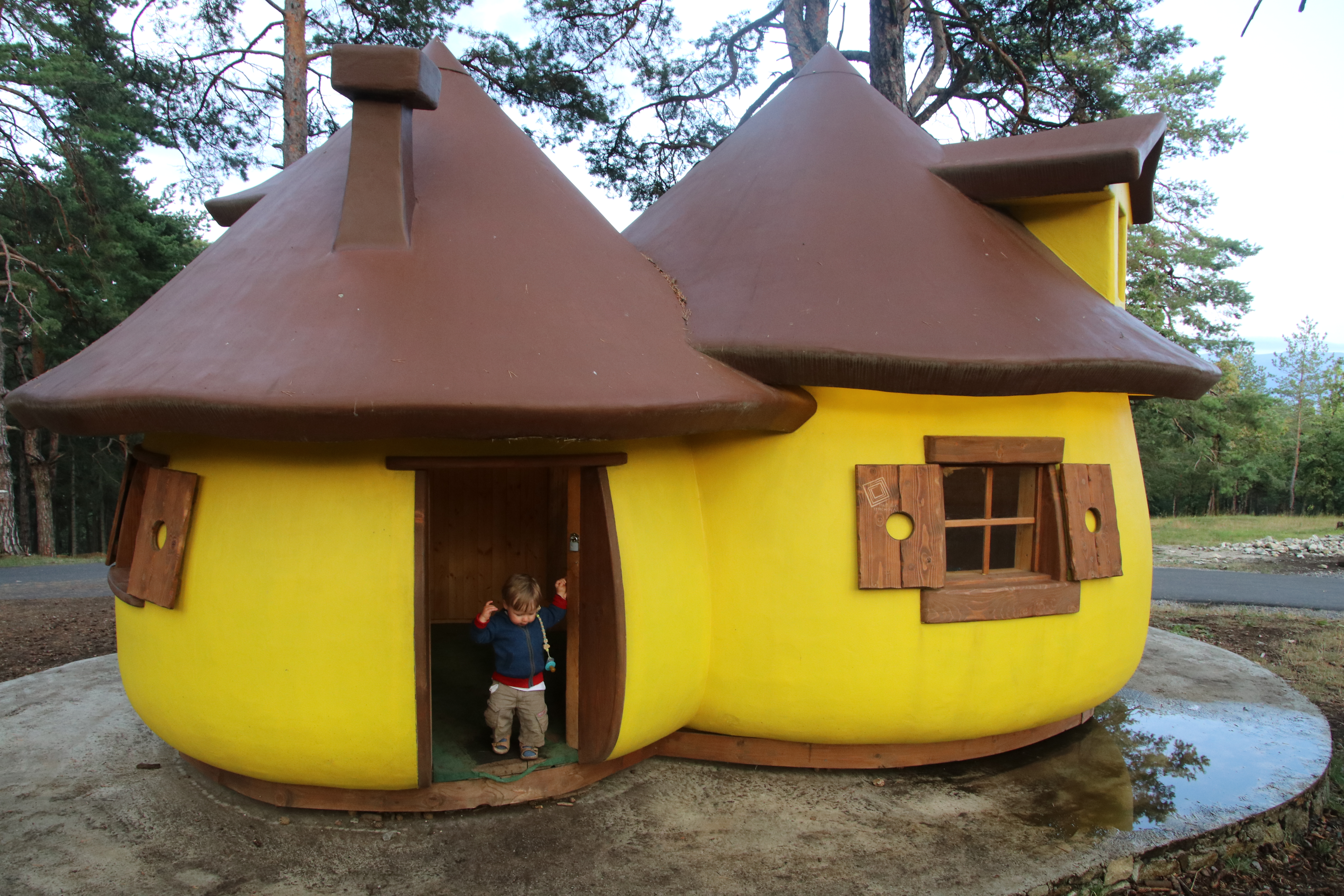 Wir fahren hinein, die Anlage ist in einen großen Kiefernwald integriert. Wir finden einen schönen ruhigen Stellplatz im Wald und schauen uns noch ein wenig um. Die Hauptatraktionen des Parks (ein großer Baumwipfelpfad und ein Kletterwald) sowie das Restaurant sind noch im Bau aber es gibt schon einen tollen großen und gut genutzten Spielplatz. Der Imbiss hat leider gerade zugemacht.