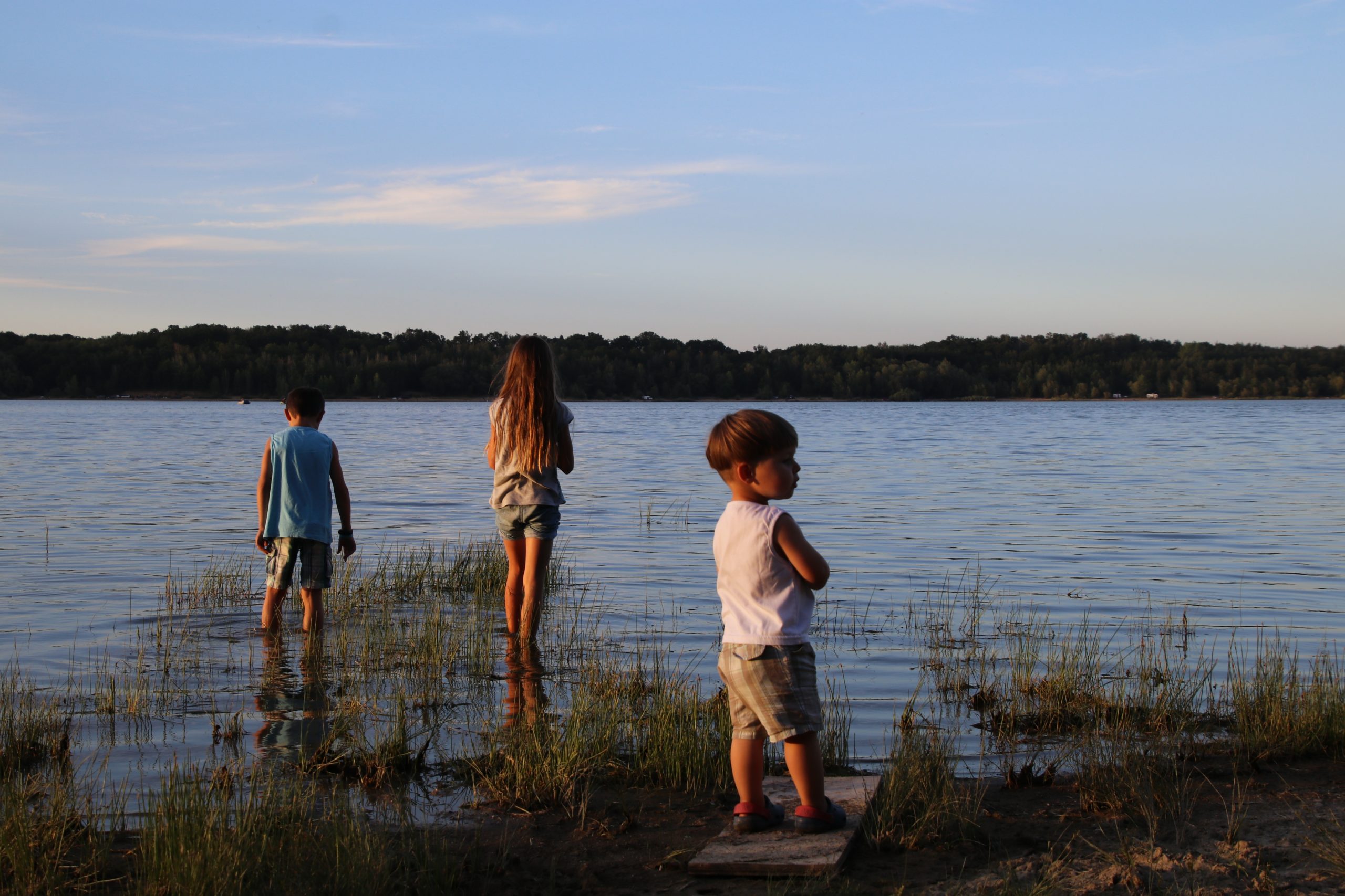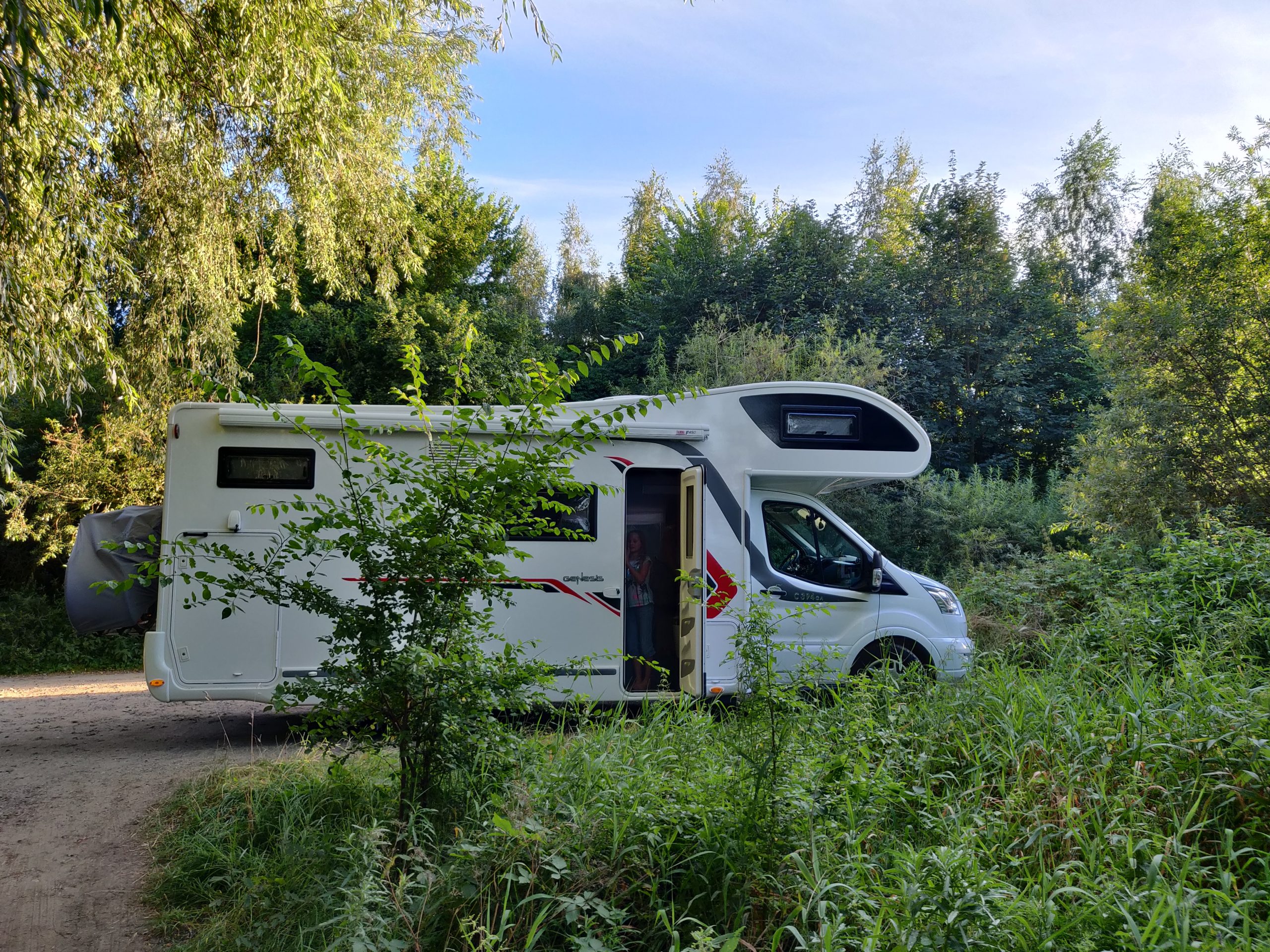 Am frühen Nachmittag fahren wir noch ein kleines Stück zu einer Autobahnraststätte, wo wir Annabell einsammeln. Sie war bis heute im Ferienlager und der Bus macht auf der Heimfahrt dort einen Zwischenstopp. Um 15 Uhr sind wir dann vollzählig und es geht weiter in Richtung Polen. Zum Abendessen haben wir uns den größten See herausgesucht, den wir an der Route finden konnten – den Slup-Stausee. Dort angekommen stellt sich heraus, dass es keine größeren Straßen bis ans Wasser gibt, nur kleine Feldwege. Wir probieren mehrere und bei einem kommen wir nach intensivem Einsatz der Astschere (gehört mittlerweile zum Standard-Reisegepäck) endlich bis zum See. Die Kinder planschen ein wenig und bestaunen die Schwäne am Ufer. Wir essen das Abendbrot im Camper, da es vor Mücken wimmelt und beschließen, noch bis zum morgigen Etappenziel durchzufahren.