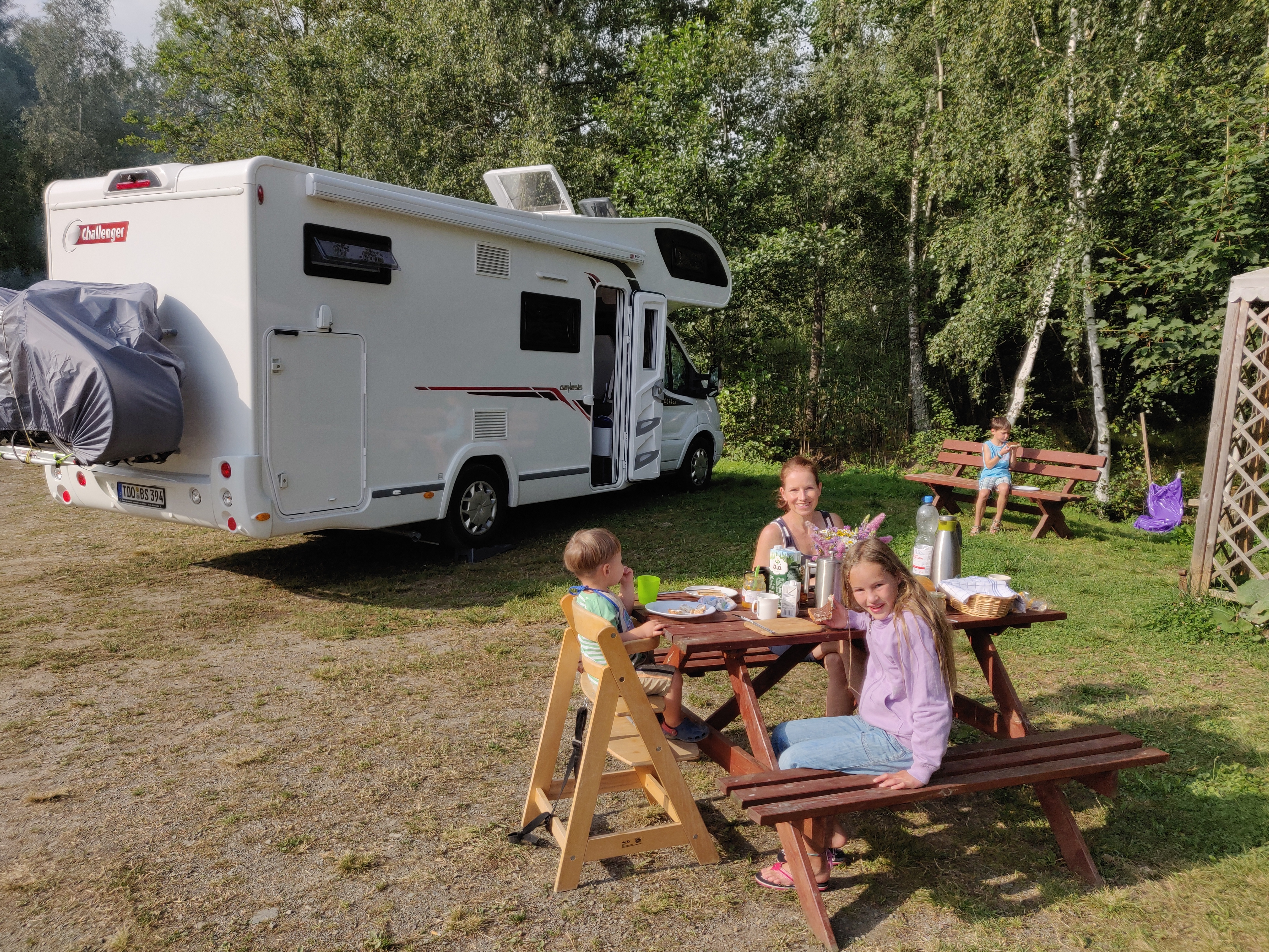 Wir hatten einen absolut ruhige Nacht. Die einzigen Geräusche waren das leise plätschern des Bächleins. Gut erholt stehen wir gegen 8 auf. Uns begrüßt ein strahlender Sonnenschein. Direkt neben dem Wohnmobil stehen Tische. Der Parkplatzwärter hat sogar Blumen drauf gestellt. Wir frühstücken, bezahlen sagenhafte 2 Euro Parkgebühr und brechen gegen 10 zu unserer heutigen Wanderung auf.