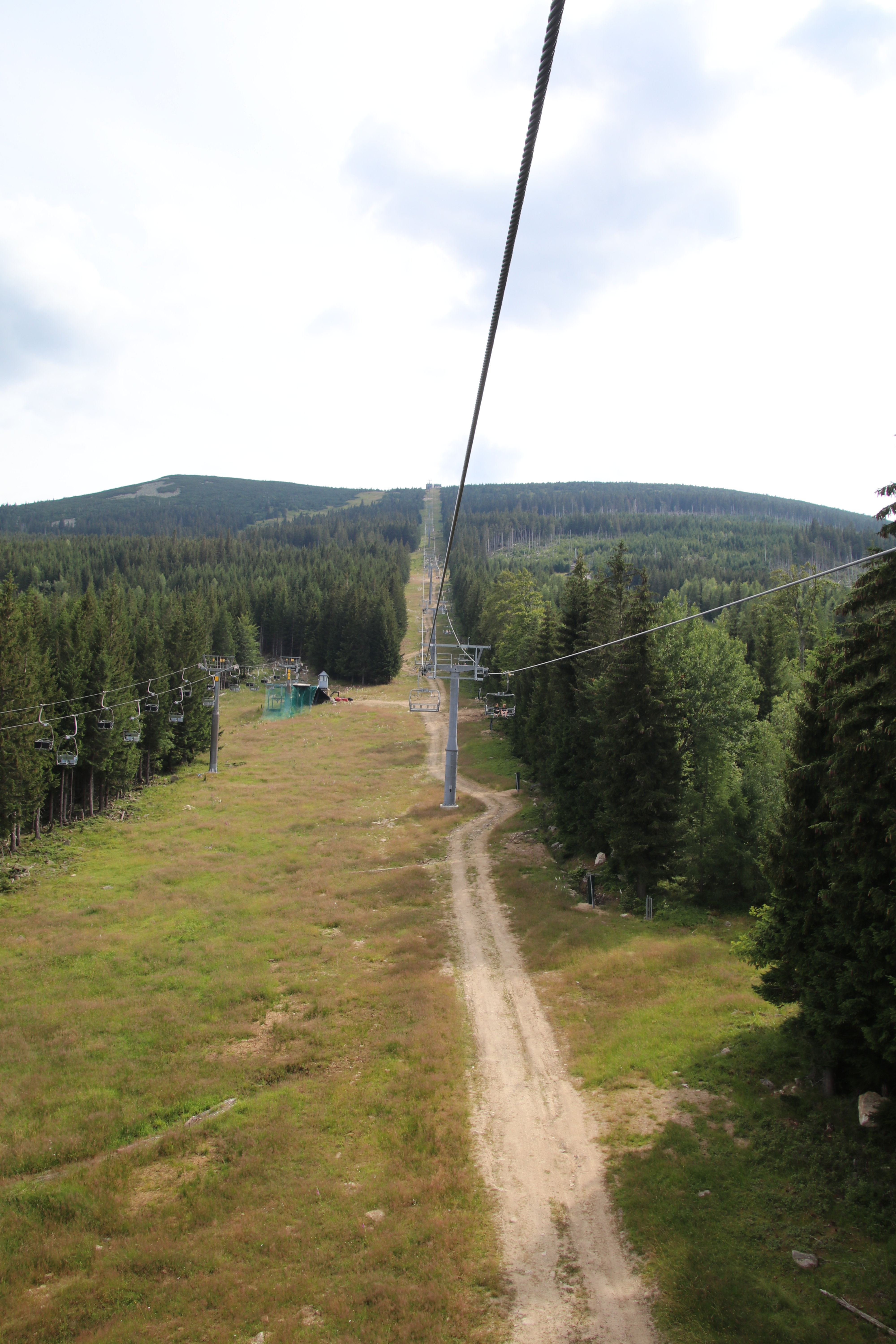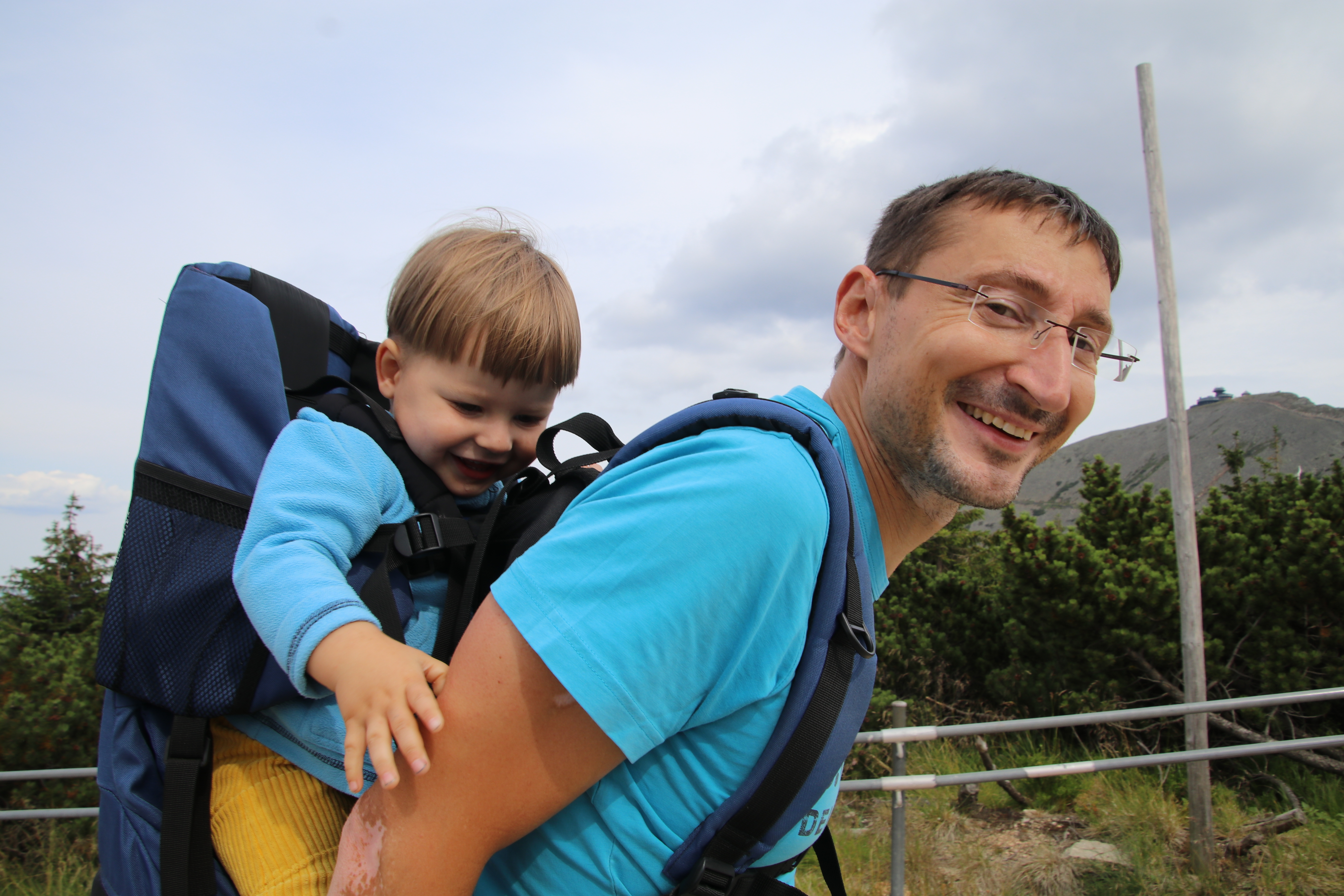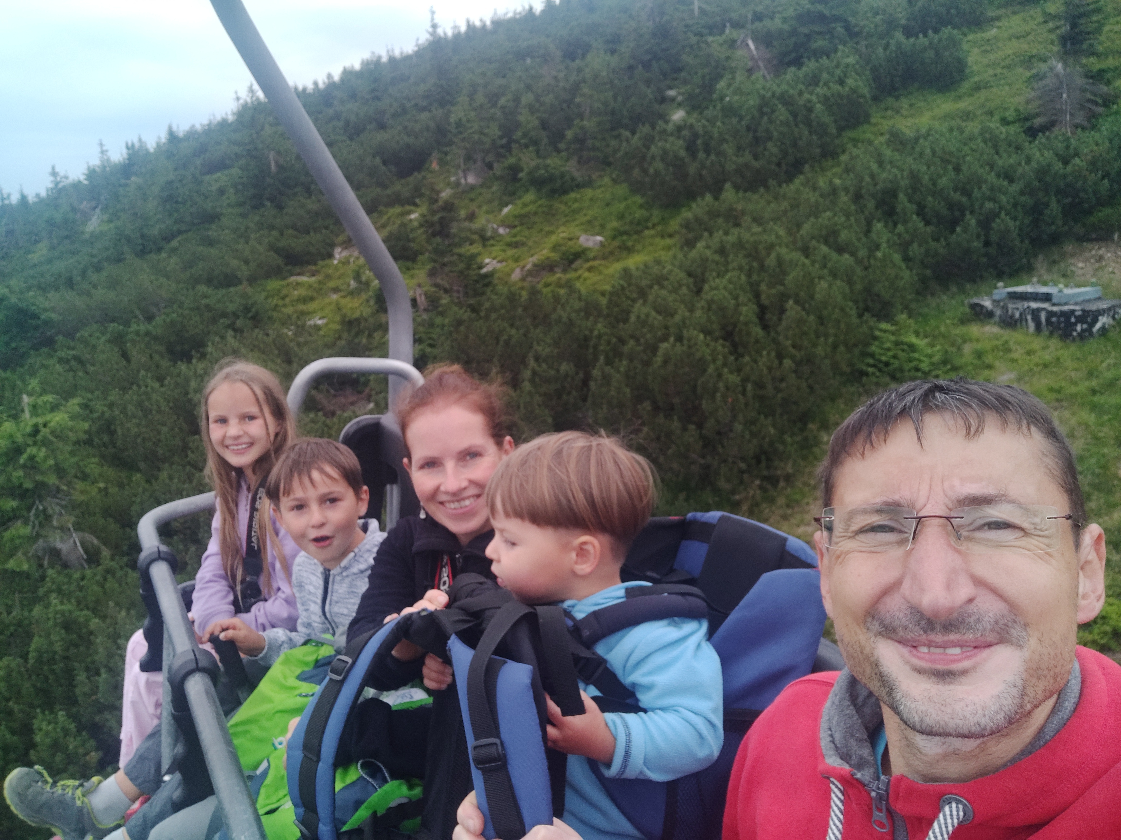 Nach der Wanderung essen wir noch am Imbiss, der inzwischen auf dem Parkplatz aufgebaut wurde und fahren bis zum Fuße der Schneekoppe. Mattis hält auf der Fahrt sein Mittagsschläfchen. Da an der Schneekoppe ab morgen schlechtes Wetter angesagt ist, wollen wir die eigentlich die für morgen geplante Bergtour schon heute angehen. Auf der Taxifahrt vom Parkplatz zum Lift erklärt uns der Taxifahrer, dass der Fußmarsch von der Liftstation bis zum Gipfel und zurück um die 3 Stunden dauert und heute nicht mehr zu schaffen ist. Da in unserem Reiseführer 43 Minuten pro Strecke stehen, wollen wir es trotzdem versuchen.