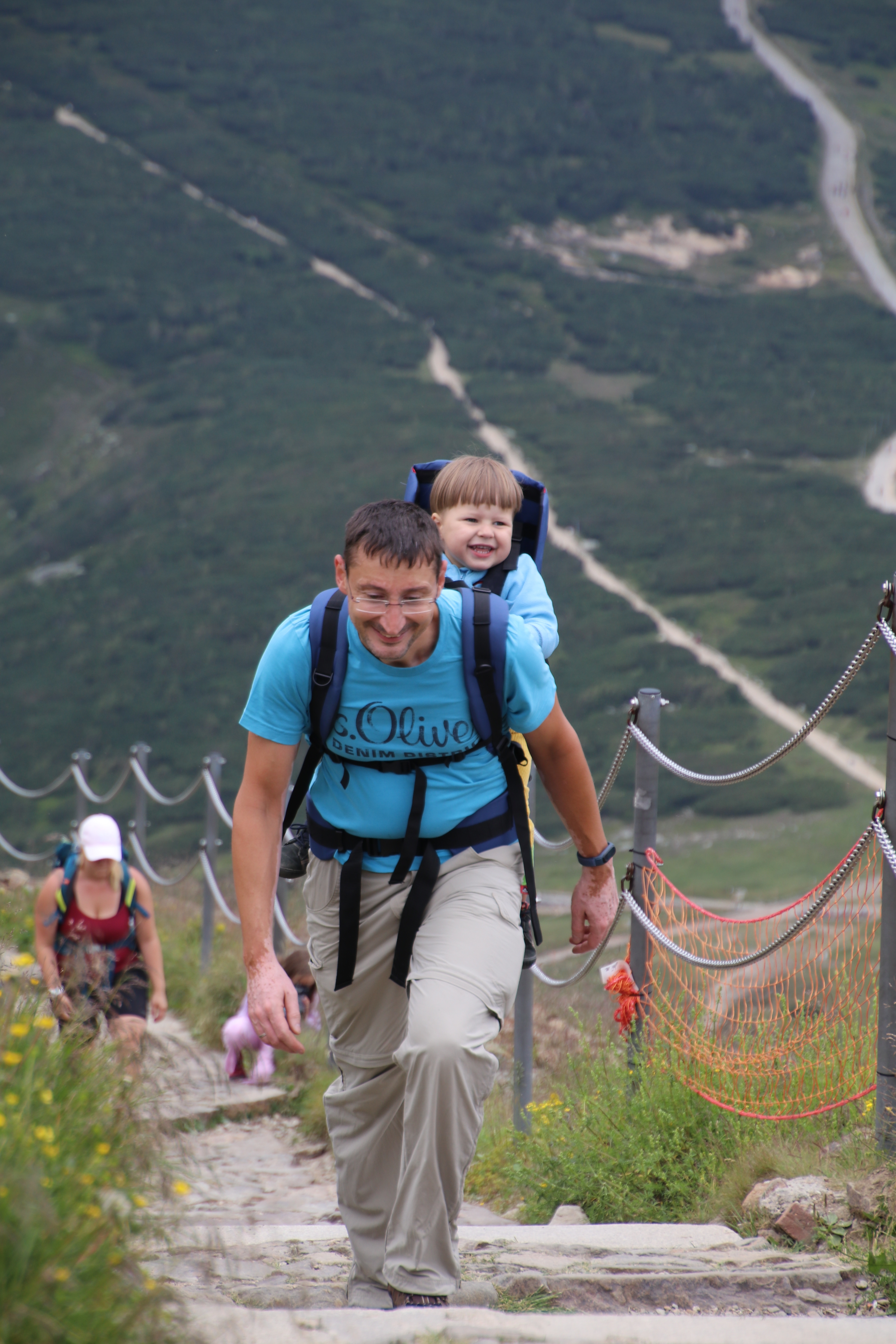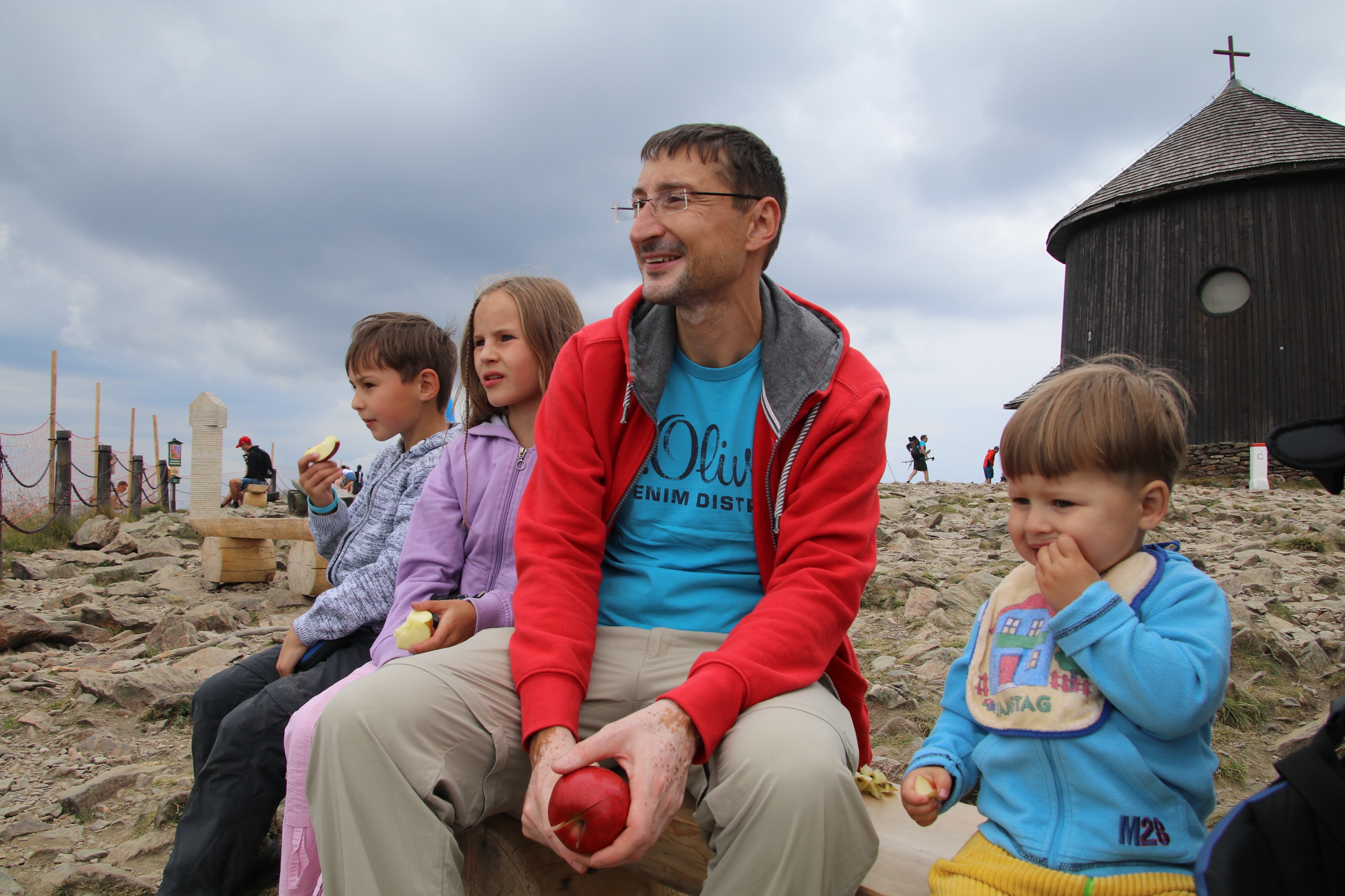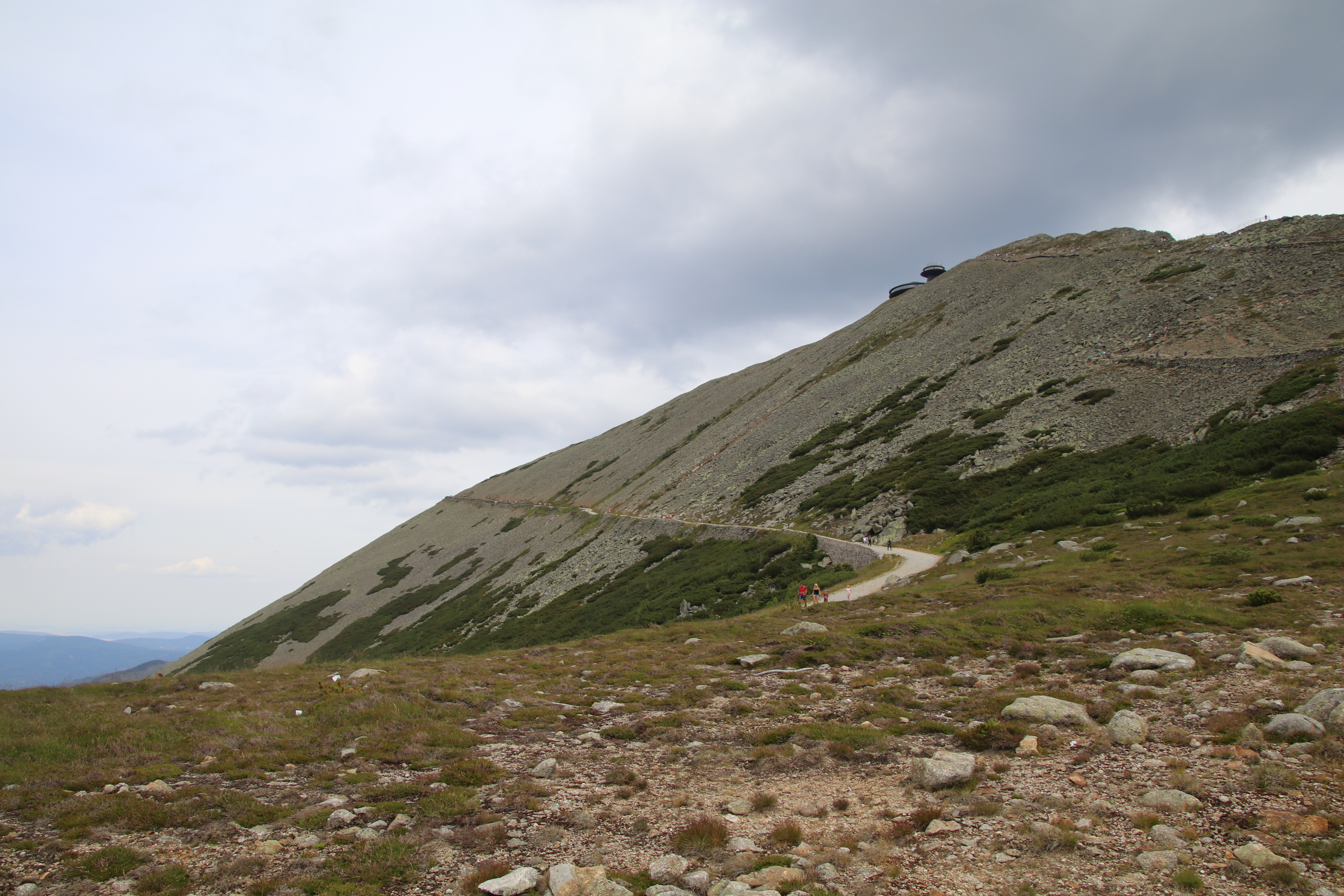 Nach der Wanderung essen wir noch am Imbiss, der inzwischen auf dem Parkplatz aufgebaut wurde und fahren bis zum Fuße der Schneekoppe. Mattis hält auf der Fahrt sein Mittagsschläfchen. Da an der Schneekoppe ab morgen schlechtes Wetter angesagt ist, wollen wir die eigentlich die für morgen geplante Bergtour schon heute angehen. Auf der Taxifahrt vom Parkplatz zum Lift erklärt uns der Taxifahrer, dass der Fußmarsch von der Liftstation bis zum Gipfel und zurück um die 3 Stunden dauert und heute nicht mehr zu schaffen ist. Da in unserem Reiseführer 43 Minuten pro Strecke stehen, wollen wir es trotzdem versuchen.