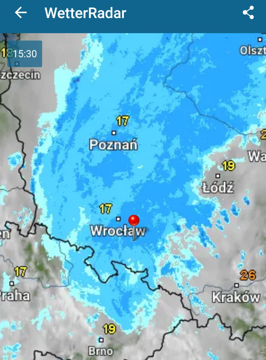 Zurück auf dem Parkplatz gibt es „Zapiekanka“, ein pizzaartig überbackenes, flaches Baguettebrot vom lokalen Imbiss, der trotz des Wetters geöffnet hat. Es regnet übrigens immer noch. Ein Blick auf die Wetterkarte ist ernüchternd. Ein gigantisches Regenband erstreckt sich komplett von Norden bis nach Süden über das gesamte westliche Polen. Es hängt in den Bergen des Riesengebirges fest und wird sich hier voraussichtlich die nächsten zwei Tage abregnen.