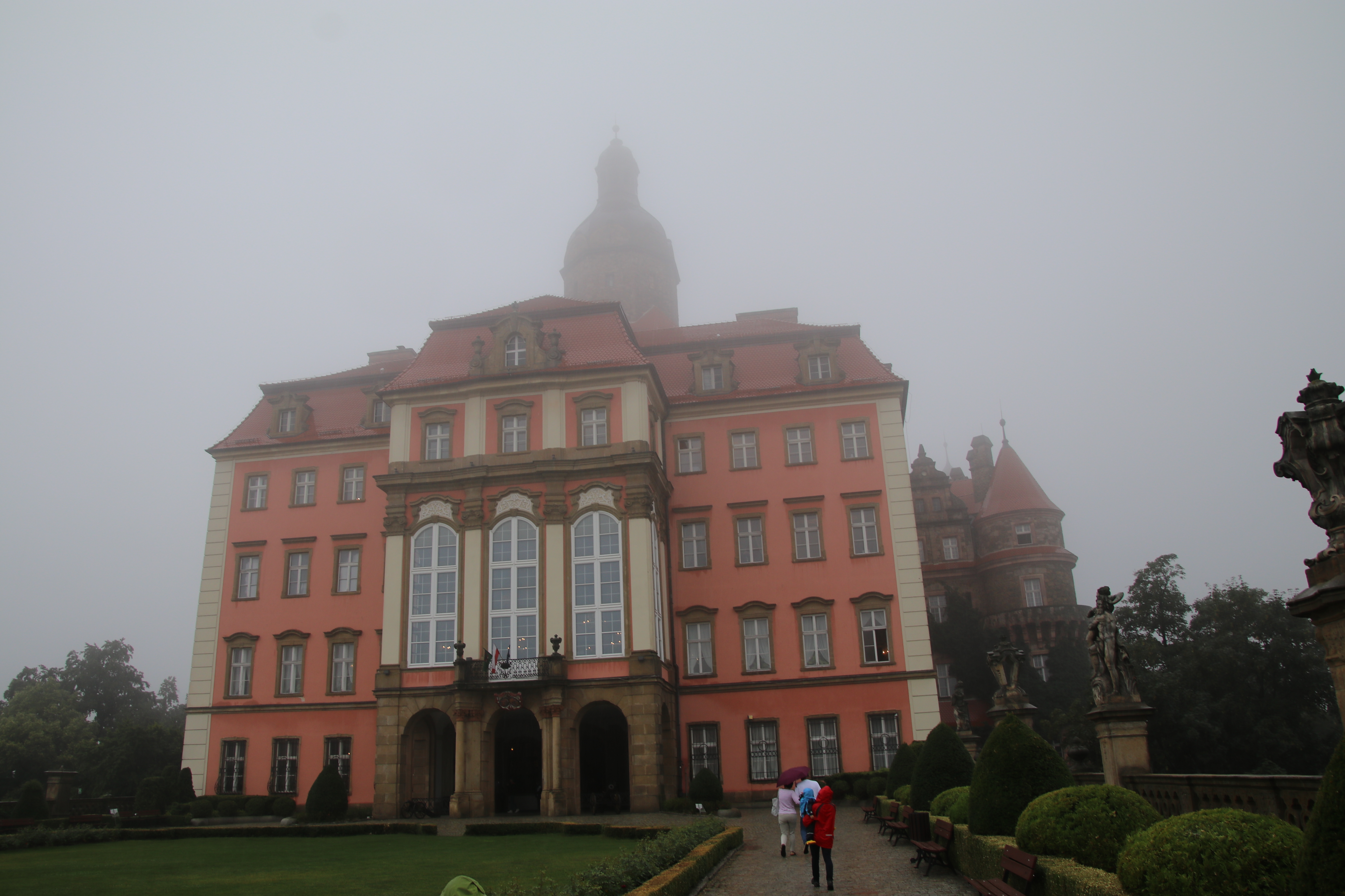 Wir werfen uns in die Regensachen und stapfen durch Pfützen bis zum Schloss. Es ist noch wenig los, die ersten Besucher treffen gerade erst ein. Wir fliehen hinein ins Trockene und verbringen den Vormittag mit der Besichtigung. Das Schloss ist phantastisch gelegen, aus allen Fenstern hat man einen atemberaubenden Ausblick auf die umliegende, heute im Nebel halb versteckte Berglandschaft. Die Räume sind hell und prunkvoll, wir sind beeindruckt.