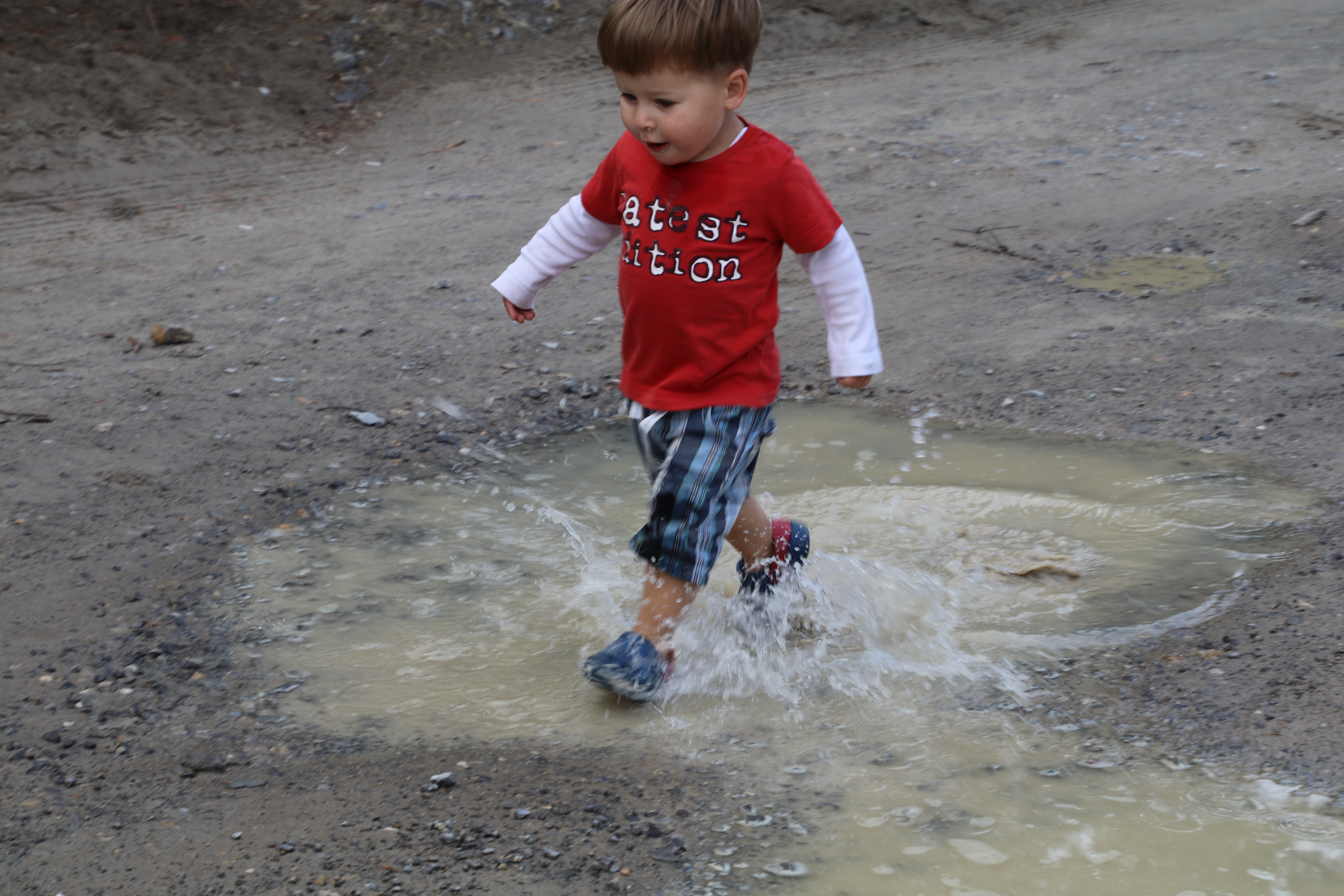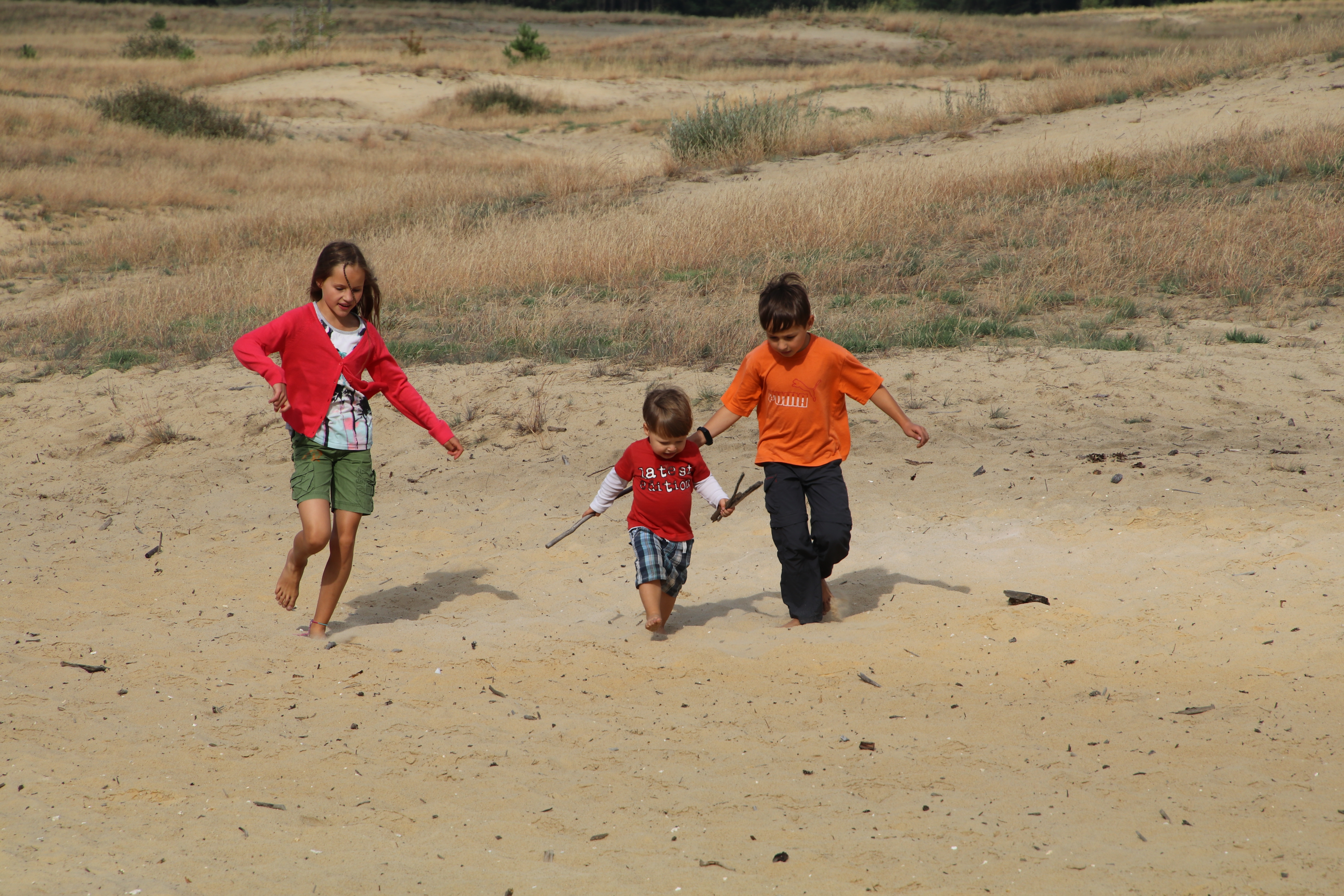 Mattis sieht den Sand und schaltet augenblicklich auf Sandkasten-Geländegang. Die verbleibenden Pfützen bieten ihm eine lustige Abwechslung. Wir verbringen eine Stunde barfuß im schon wieder warmen Sand, dann geht es eine kurze Strecke weiter zu unserem heutigen Stellplatz.