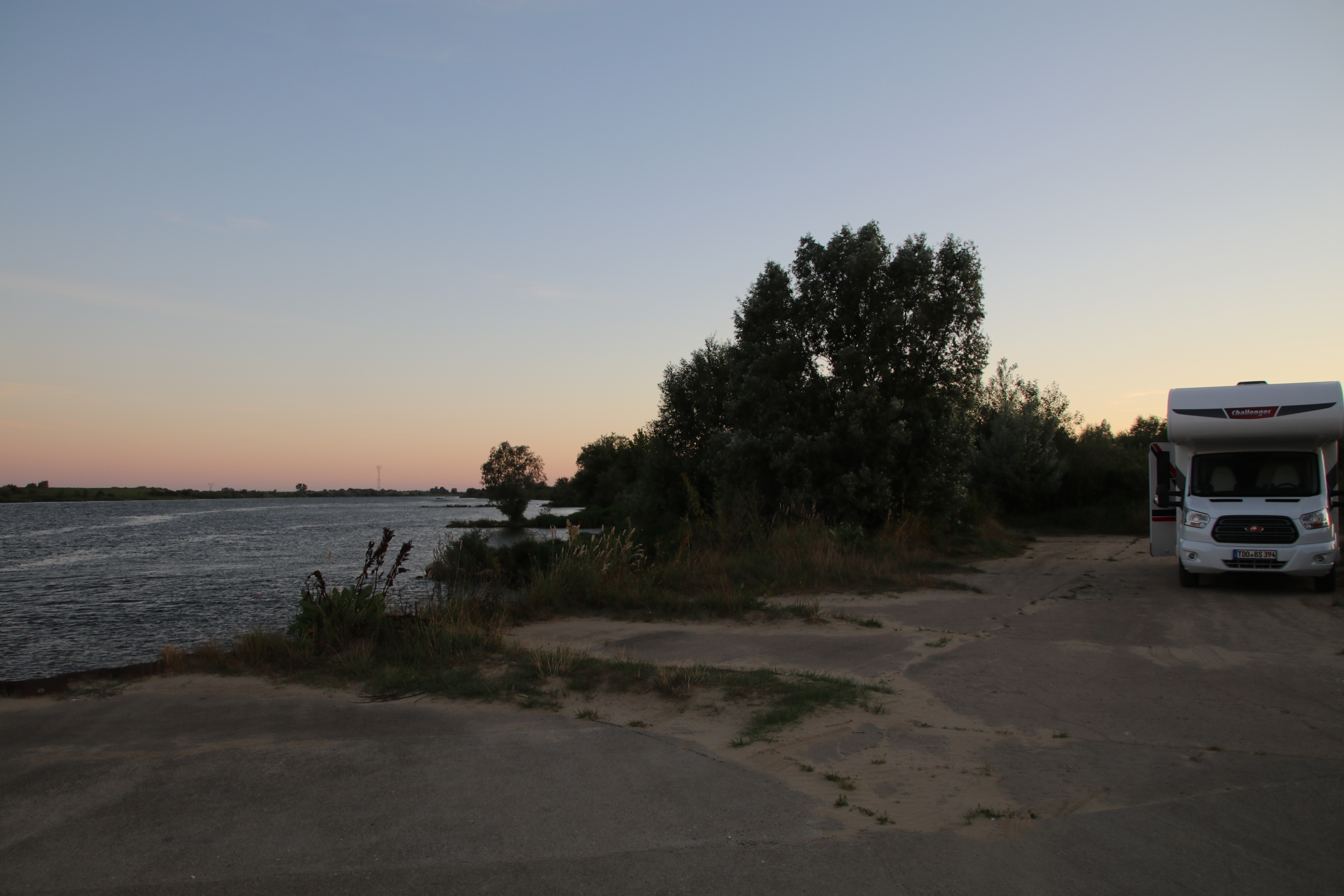 Nach gut drei Stunden sind wir wieder am Camper. Wir fahren noch eine Stunde in Richtung Danzig. Zwischendurch machen wir einen Stopp zum Abendessen – heute nur kurz an einer Autobahnraststätte. Etwa eine halbe Stunde vor Danzig fahren wir von der Autobahn ab, begegenen wieder der Weichsel und folgen ihr ein paar Kilometer zu einem nicht mehr genutzten Pier, welches jetzt eine ruhige und abgelegene Stellfläche für wild campende Wohnmobile darstellt.