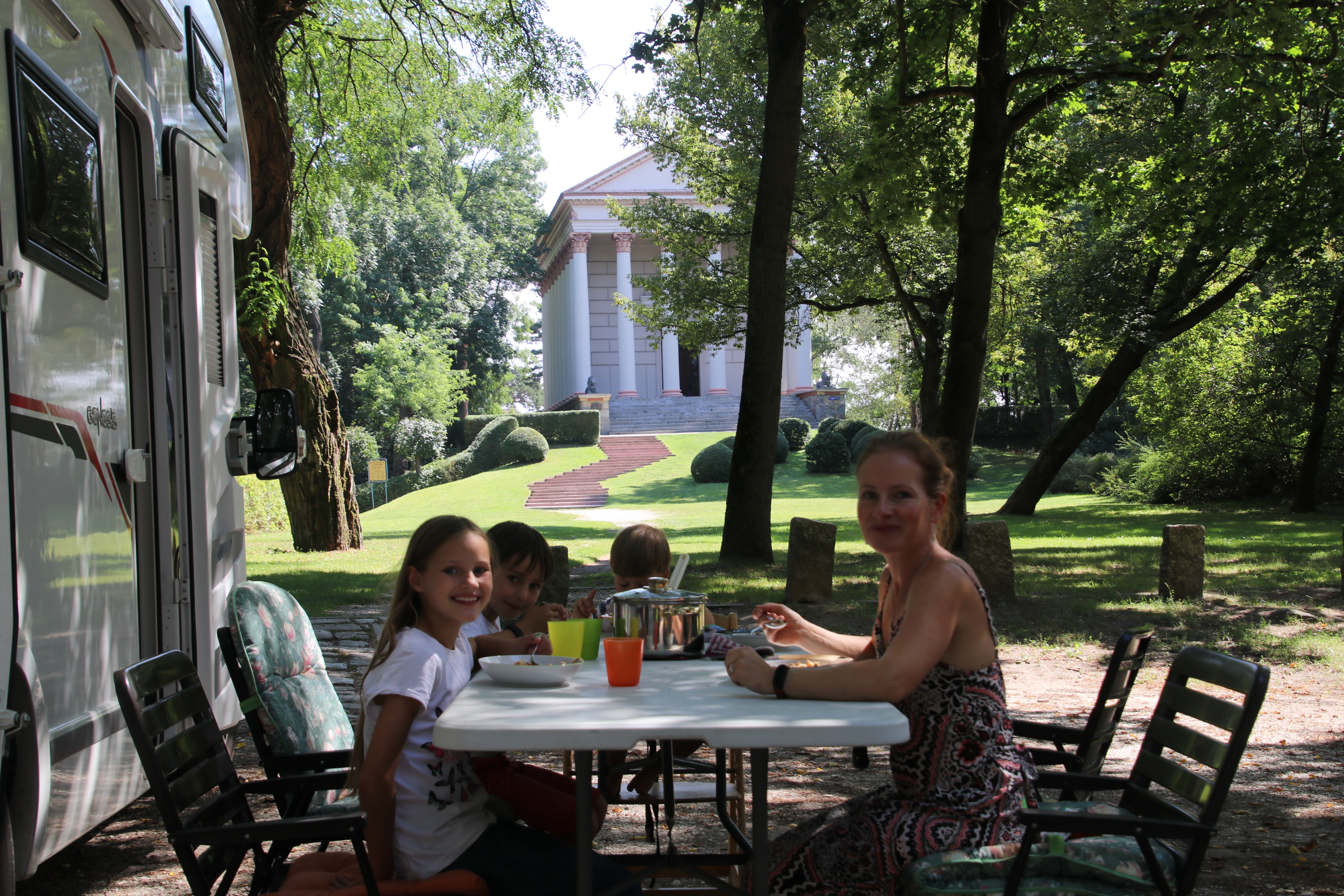 Das Mausoleum der ehemaligen Schlossherren hat leider geschlossen. Wir laufen einmal drum herum, während Anke eine schnelle Nudelsuppe zaubert.