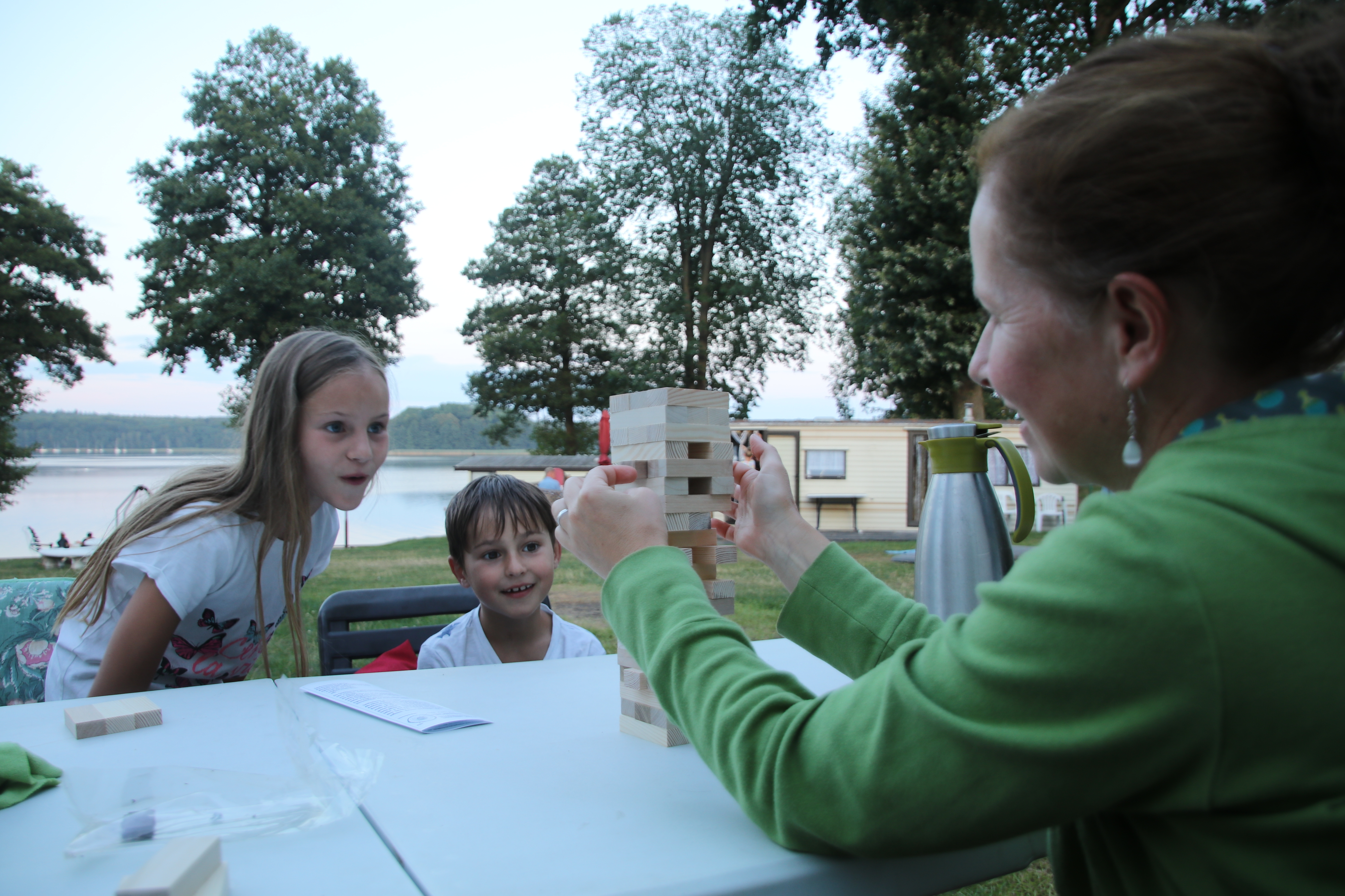 Die Lage am See ist toll, wir haben noch bis spät Abendsonne. Wir schließen den Tag mit einer Runde Jenga ab, das Spiel hat Felix zum Geburtstag bekommen.