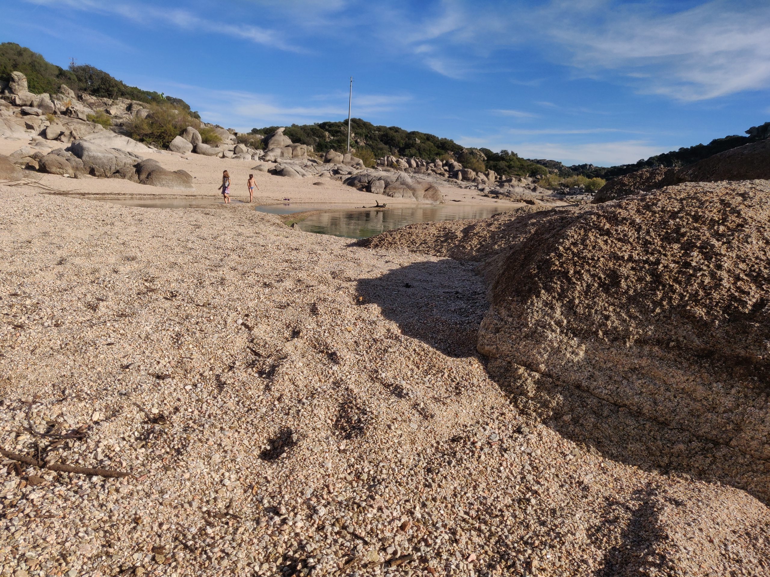 Nach der Erkundungstour ist Mattis endlich müde. Wir fahren eine sehr kurvige Strecke in gemütlicher Geschwindigkeit bis zum Lago del Goghinas – einem großen Stausee des gleichnamigen Flusses. Dort finden wir einen Parkplatz, mit nahezu direktem Strandzugang (nur ein kleiner Zaun ist zu überklettern) und legen eine Badepause ein.