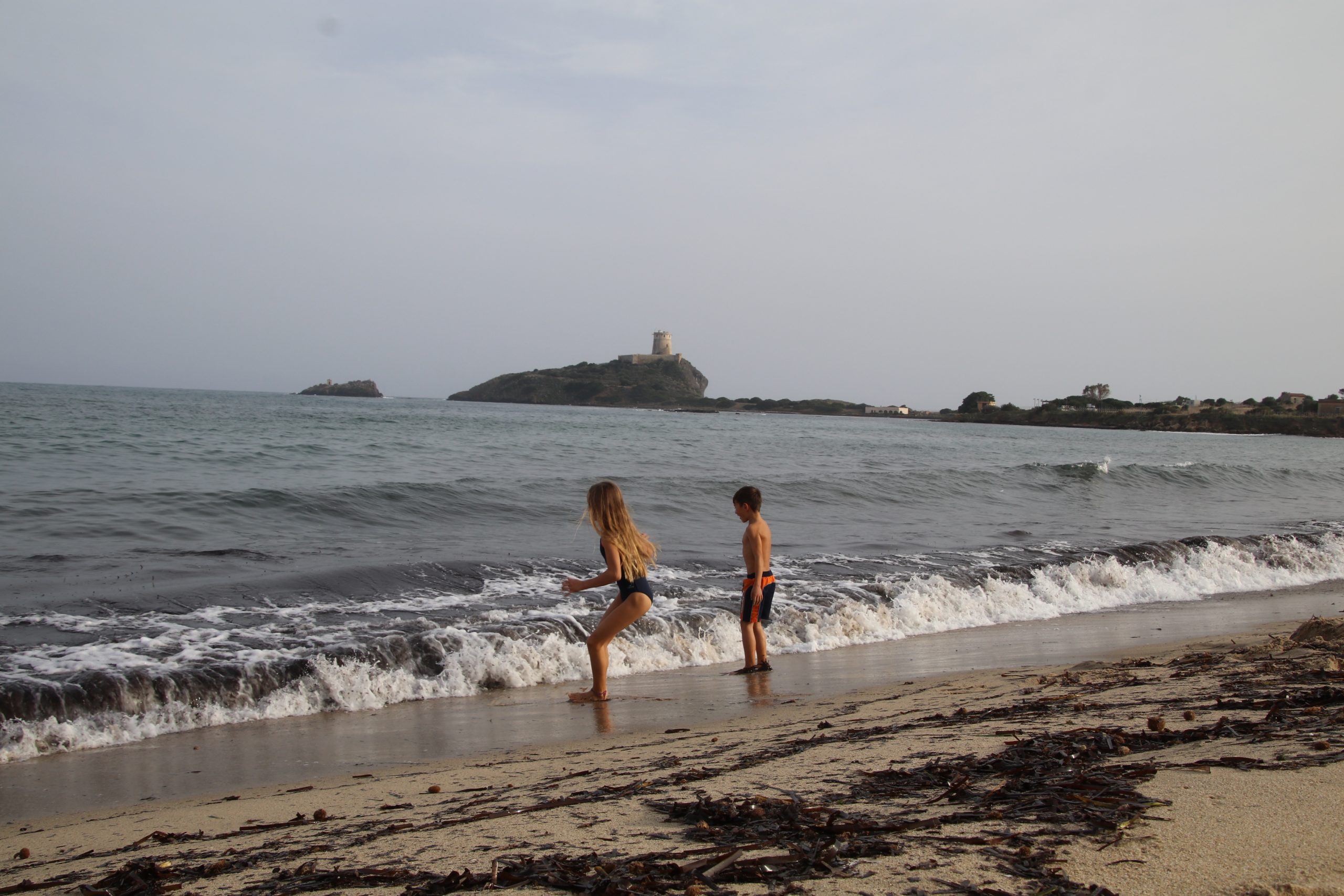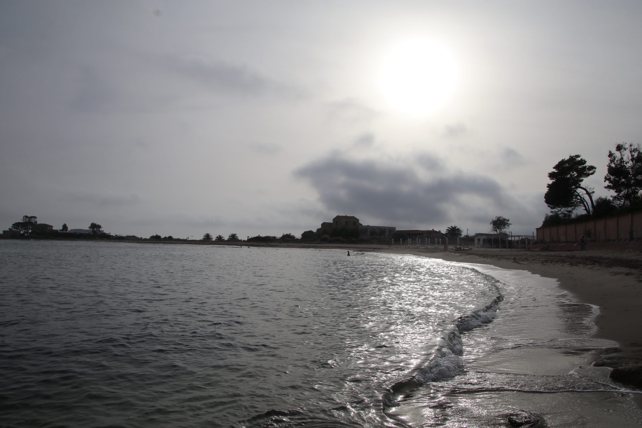 In Nora finden wir einen Parkplatz direkt neben der Ausgrabungsstätte. Hier ist auch ein langer Sandstrand, an dem sich Surfer tummeln. Obwohl es sehr diesig ist, drückt die Sonne durch die Wolken und es sind 25 Grad. Wir entscheiden uns spontan, einen Strandtag einzulegen und die Besichtigung der Anlage hier auf morgen zu verschieben. Den Strand haben wir fast komplett für uns alleine.
