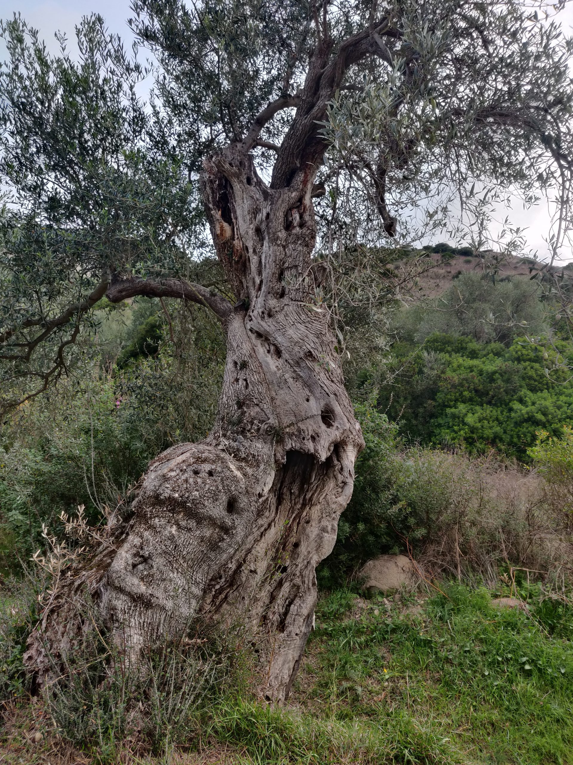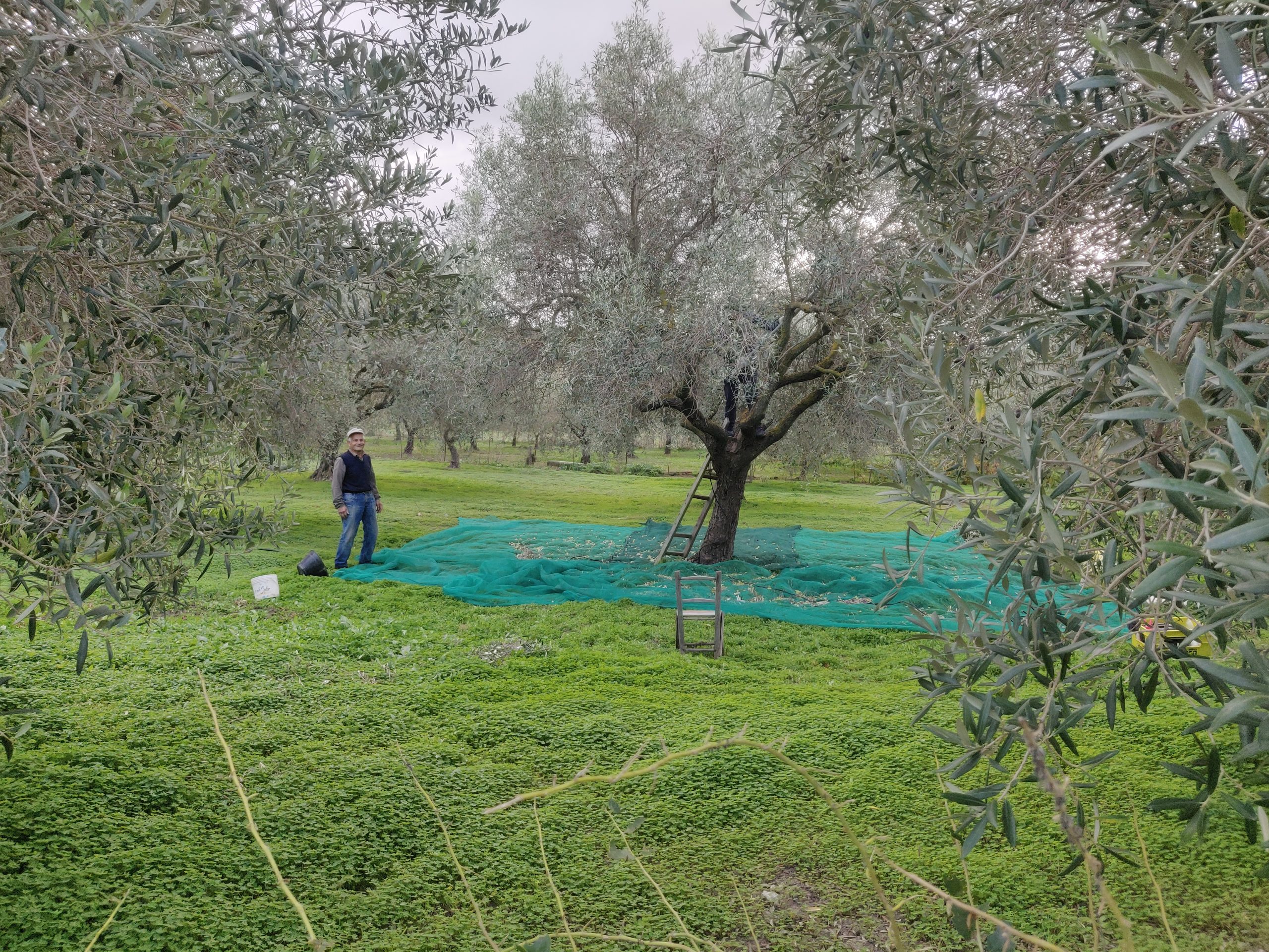 ![Weiter unten findet in den Olivenhainen die Olivenernte statt – überall sind Matten ausgebreitet und die Anwohner schütteln Äste oder sammeln Früchte ein.