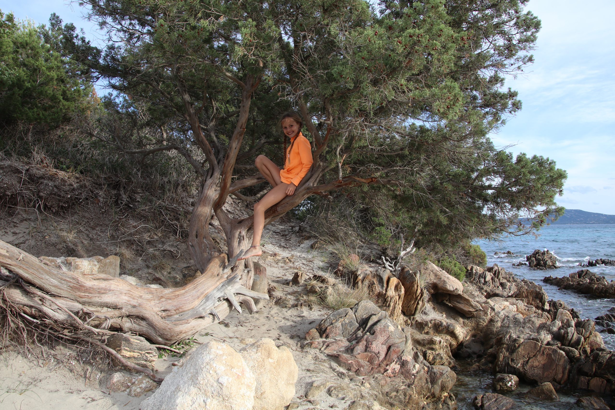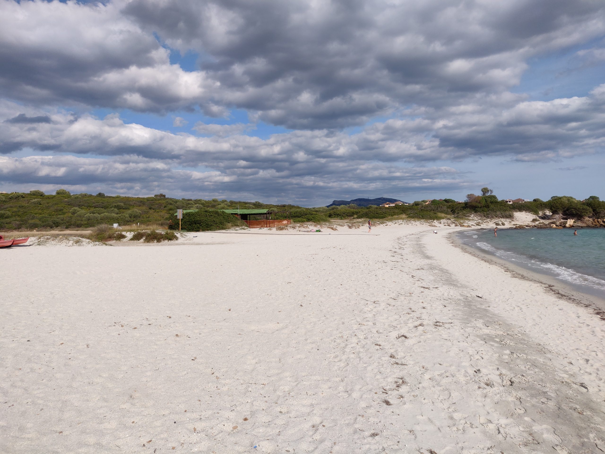 Nach dem Essen fahren wir zum nächstgelegenen Strand. Da überall die Zufahrt für Wohnmobile verboten ist, suchen wir noch ein Stück außerhalb und finden einen kleinen idyllischen Sandstrand an einer Lagune etwas nördlich von Olbia. Die Bucht heißt Cala Banana. Es stehen hier zwar noch ein paar weitere Autos, am Strand sind wir aber alleine.