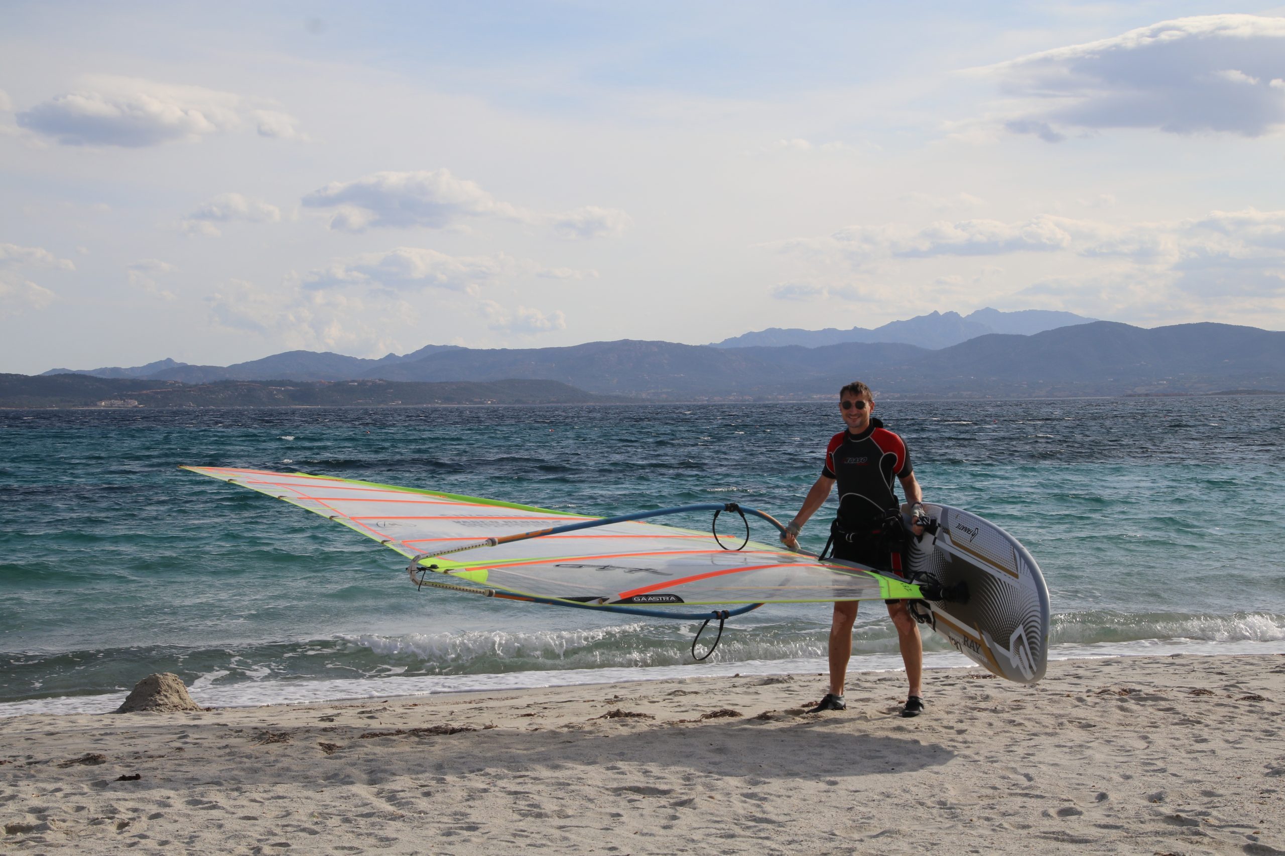 Da ein wenig Wind weht, baue ich das Surfbrett und mein größtes Segel auf, um eine Runde über die Lagune zu schippern.