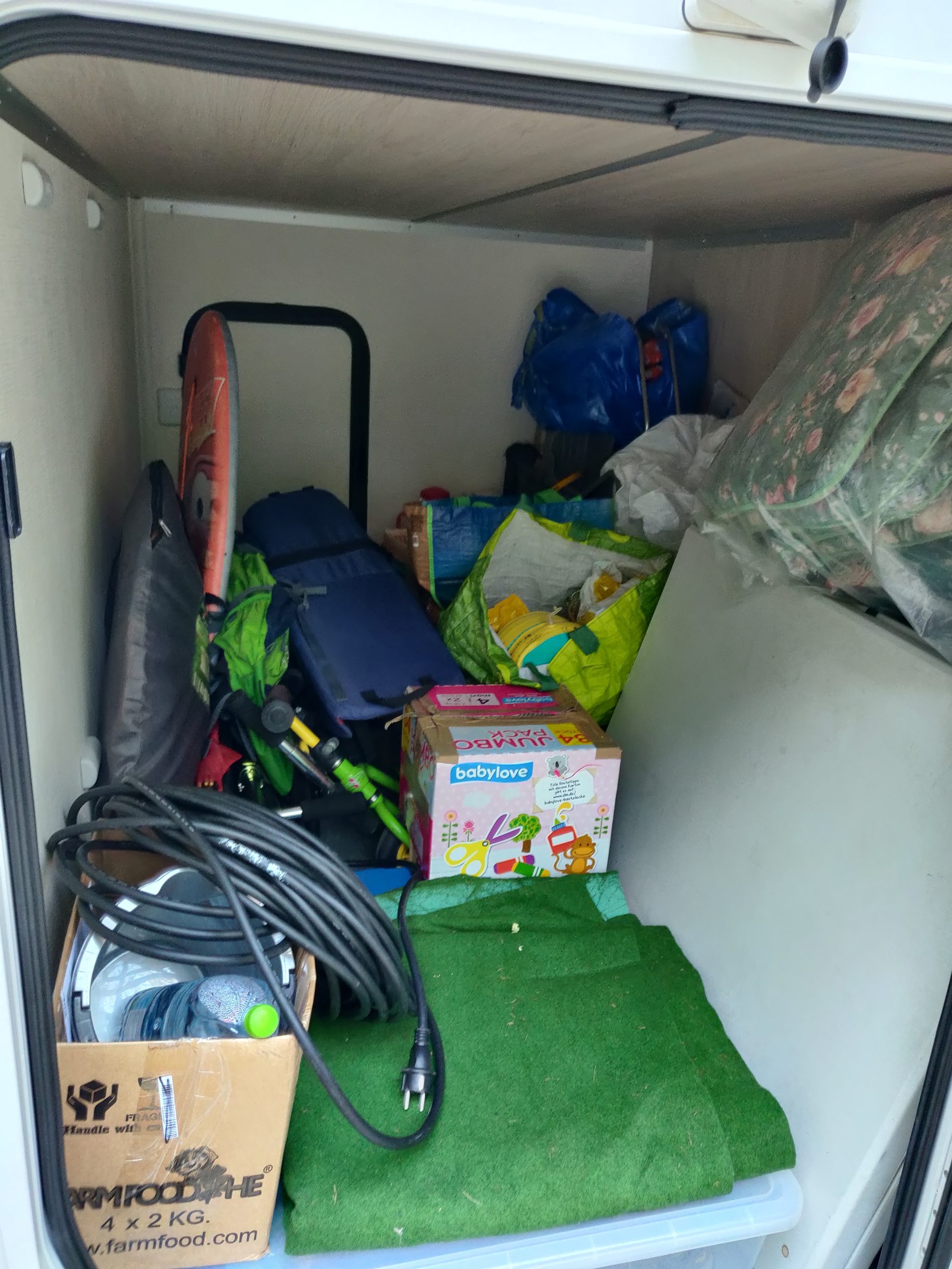 Am Nachmittag ist das Fahrzeug komplett beladen. Die Garage ist recht übersichtlich. Größere Surf-Spots liegen diesmal nicht auf der Route und das Surfbrett deshalb zu Hause.