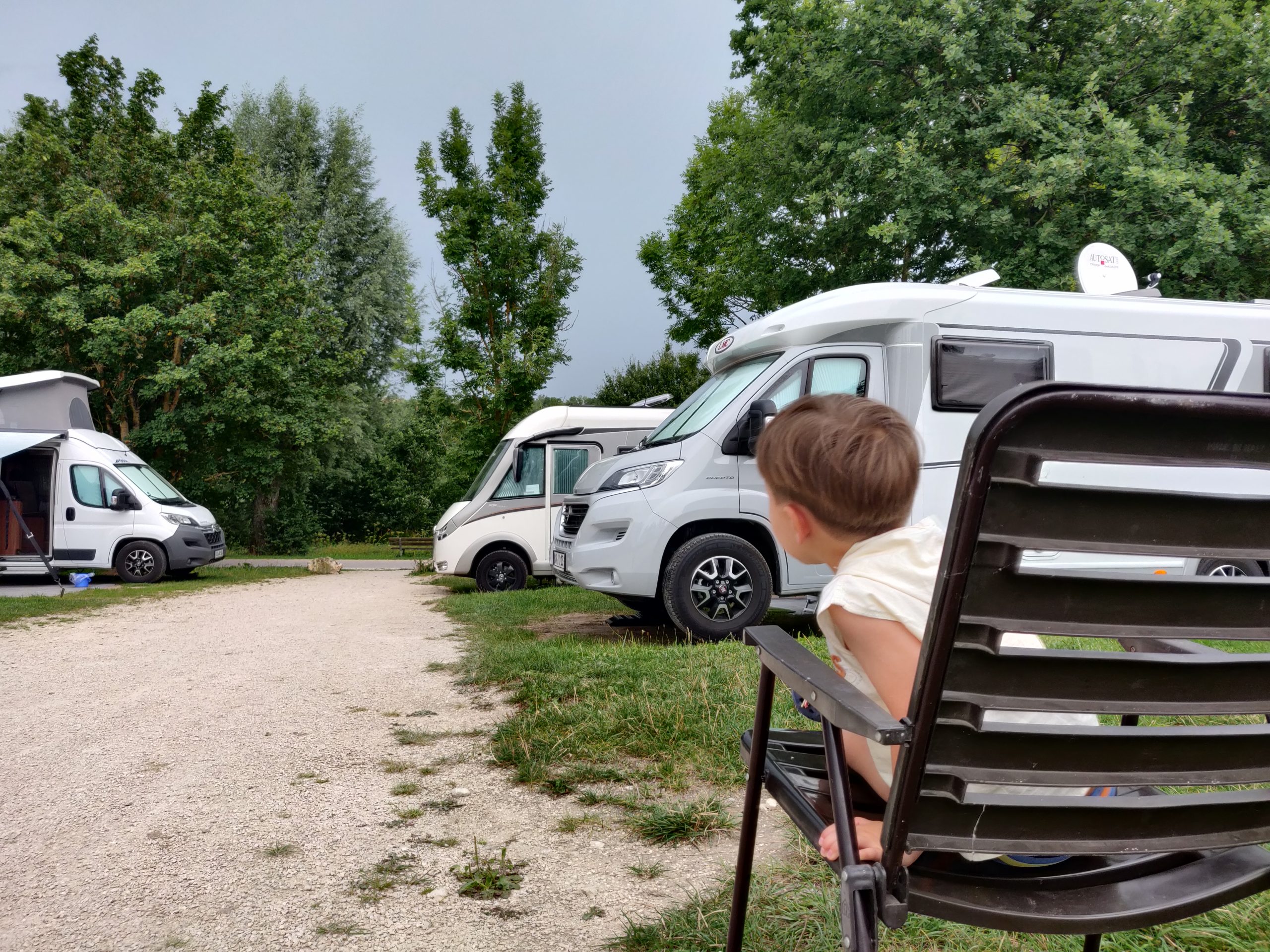Am Abend zieht der Himmel zu. Über dem Nachbarort regnet sich ein heftiges Gewitter ab, wir bekommen nur ein paar wenige Tropfen davon ab.