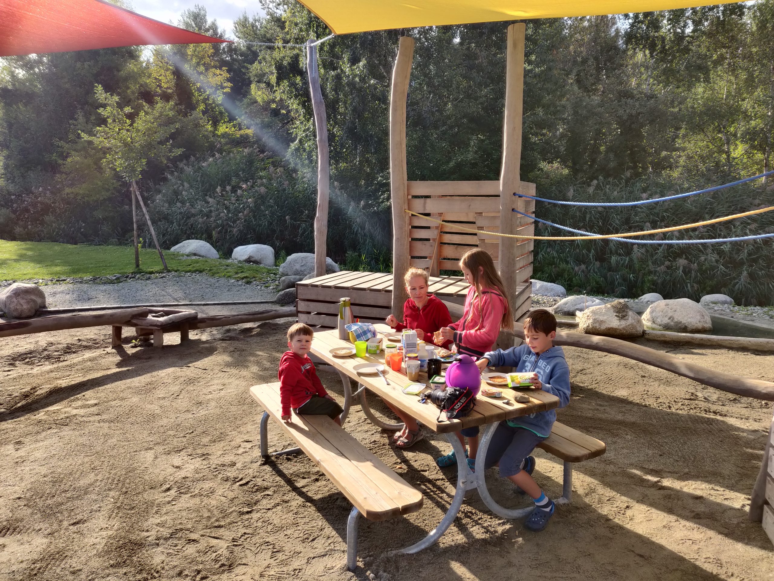 Als wir aufwachen, ist es schon recht warm. Wir frühstücken draußen auf dem Spielplatz. Die Kinder erkunden die Matschstrecke und die Spielgeräte und sind kaum noch vom Spielplatz weg zu bekommen.