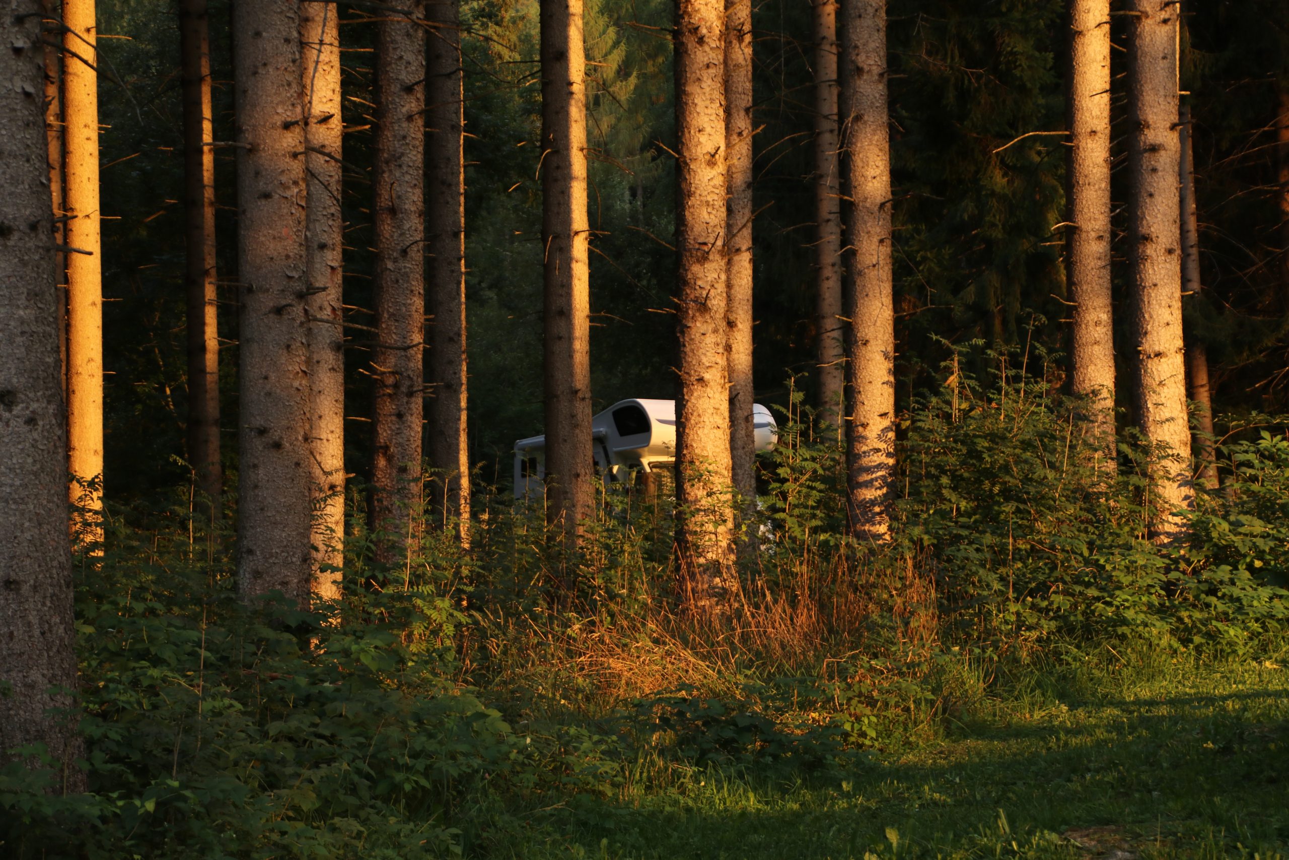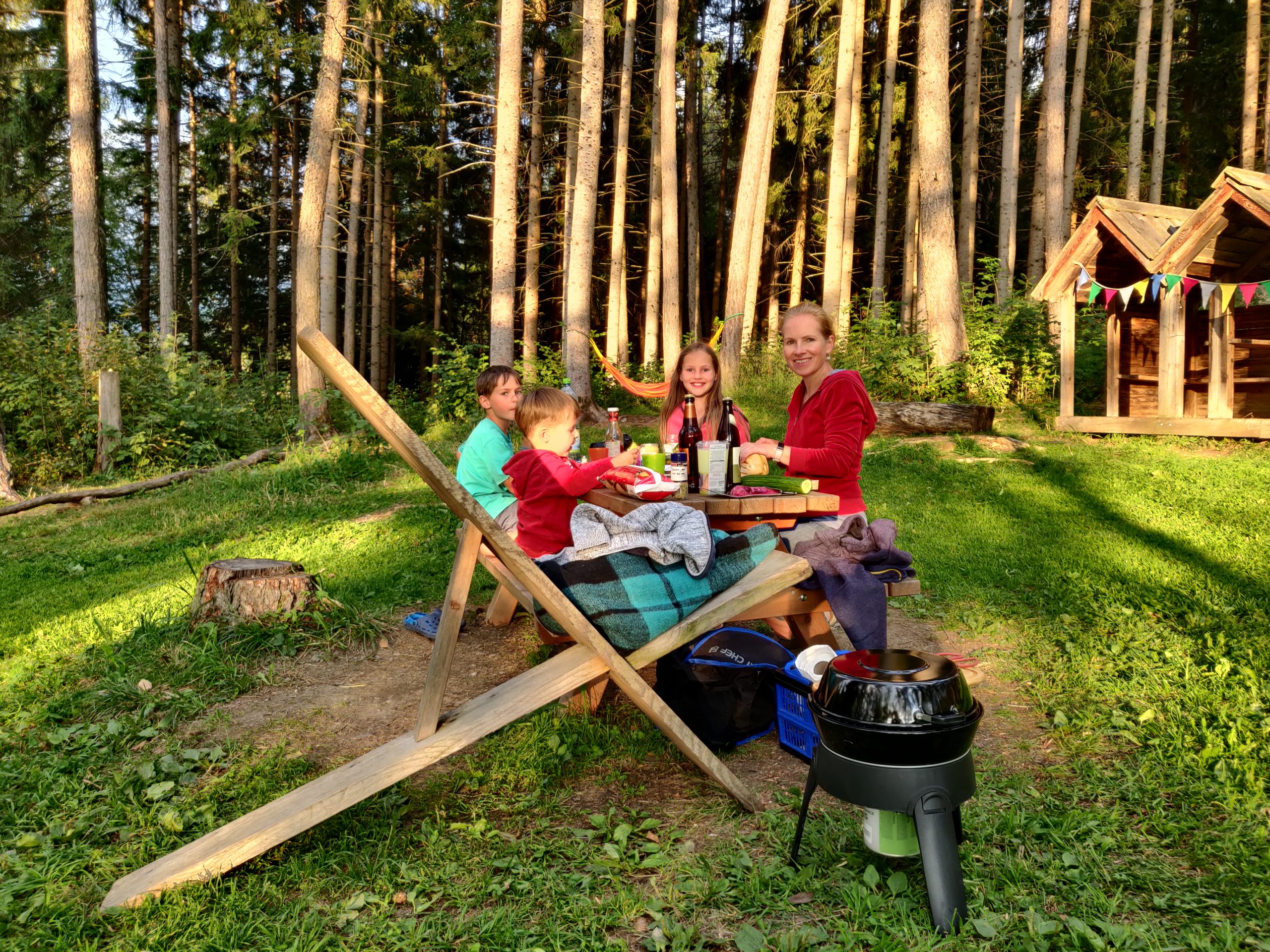 Wir fahren noch etwa 20 Kilometer zu einem etwas außerhalb von Bruneck gelegenen Waldstück. Hier sind Tische, Bänke, eine kleiner Erkundungsweg für die Kinder und Hängematten zwischen den Bäumen gespannt. Vom lokalen Bergbächlein aus wird ein Kneipp-Becken zum Wassertreten gespeist. Wir essen auf der Wiese zwischen den Bäumen zum Abendbrot, mein neues Lieblingsspielzeug, der Gasgrill, kommt wieder zum Einsatz.