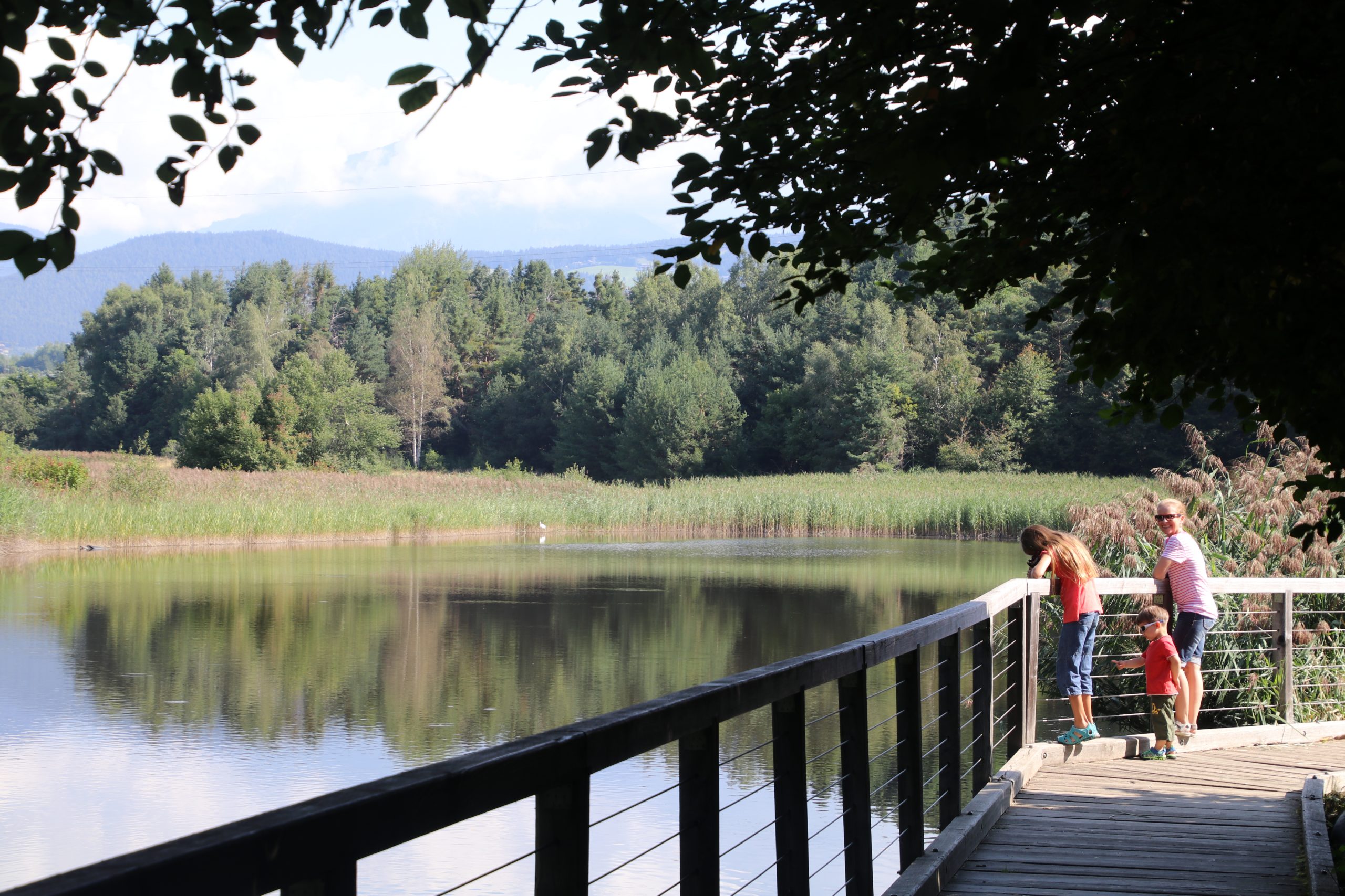 Als wir dann endlich zum angrenzenden Biotop „Rainer Moos“ aufbrechen, ist es schon sommerlich heiß. Um das Biotop, welches aus einer großen Feuchtwiese und einem schilfbewachsenen Teich besteht, führt ein Wander- und Lehrpfad mit vielen Stationen, an denen die hier liebenden Tier- und Pflanzenarten beschrieben sind.