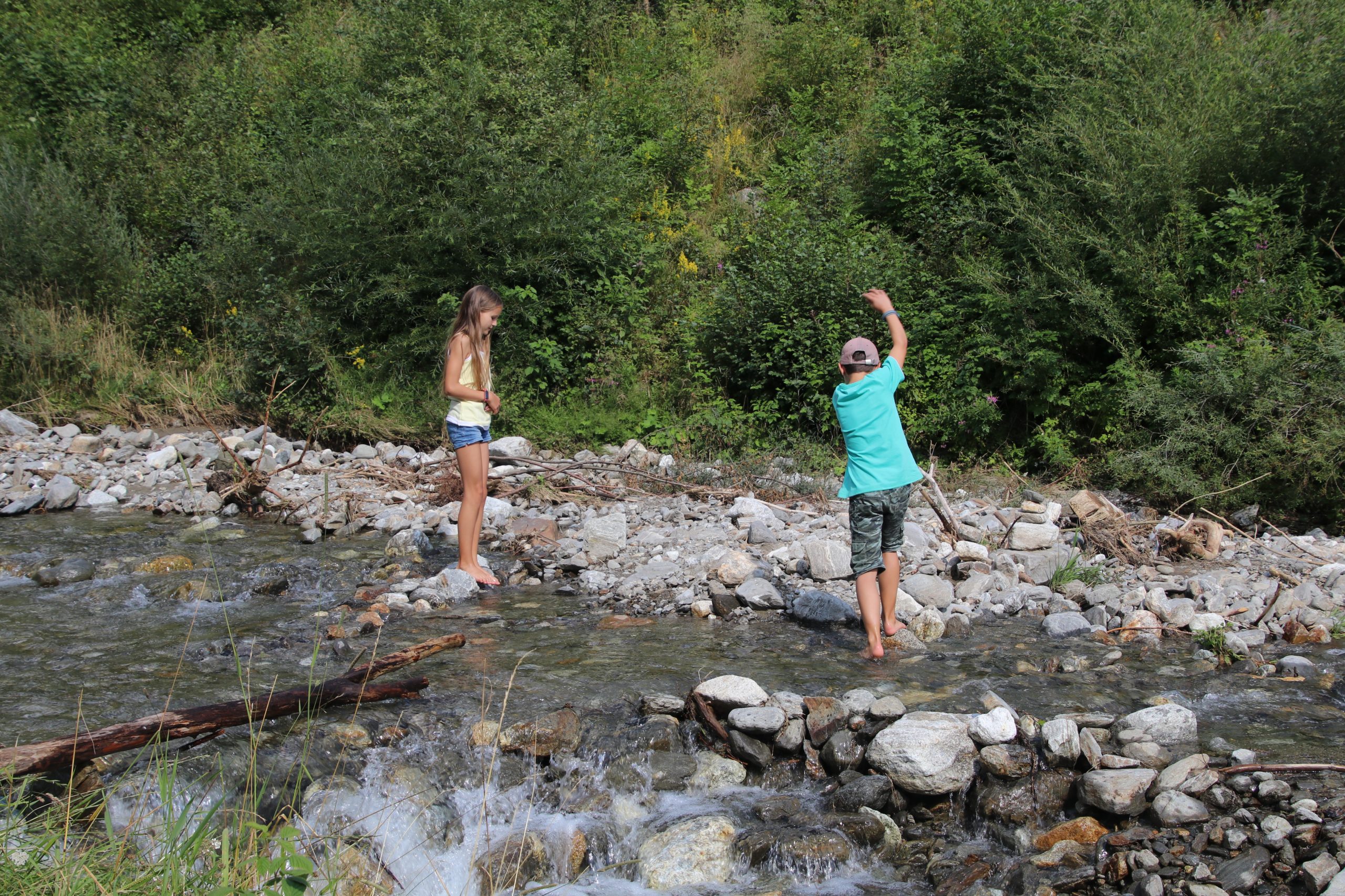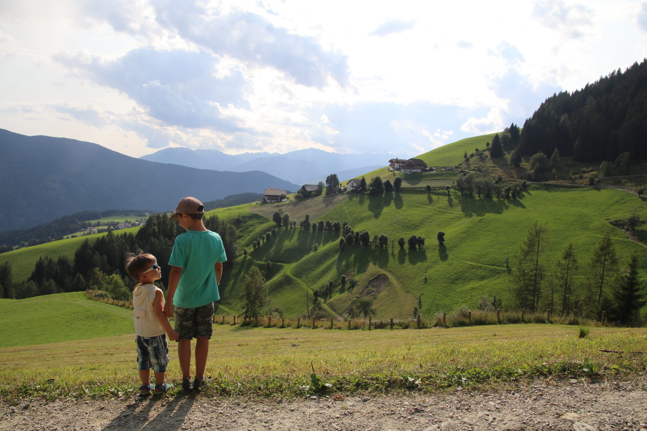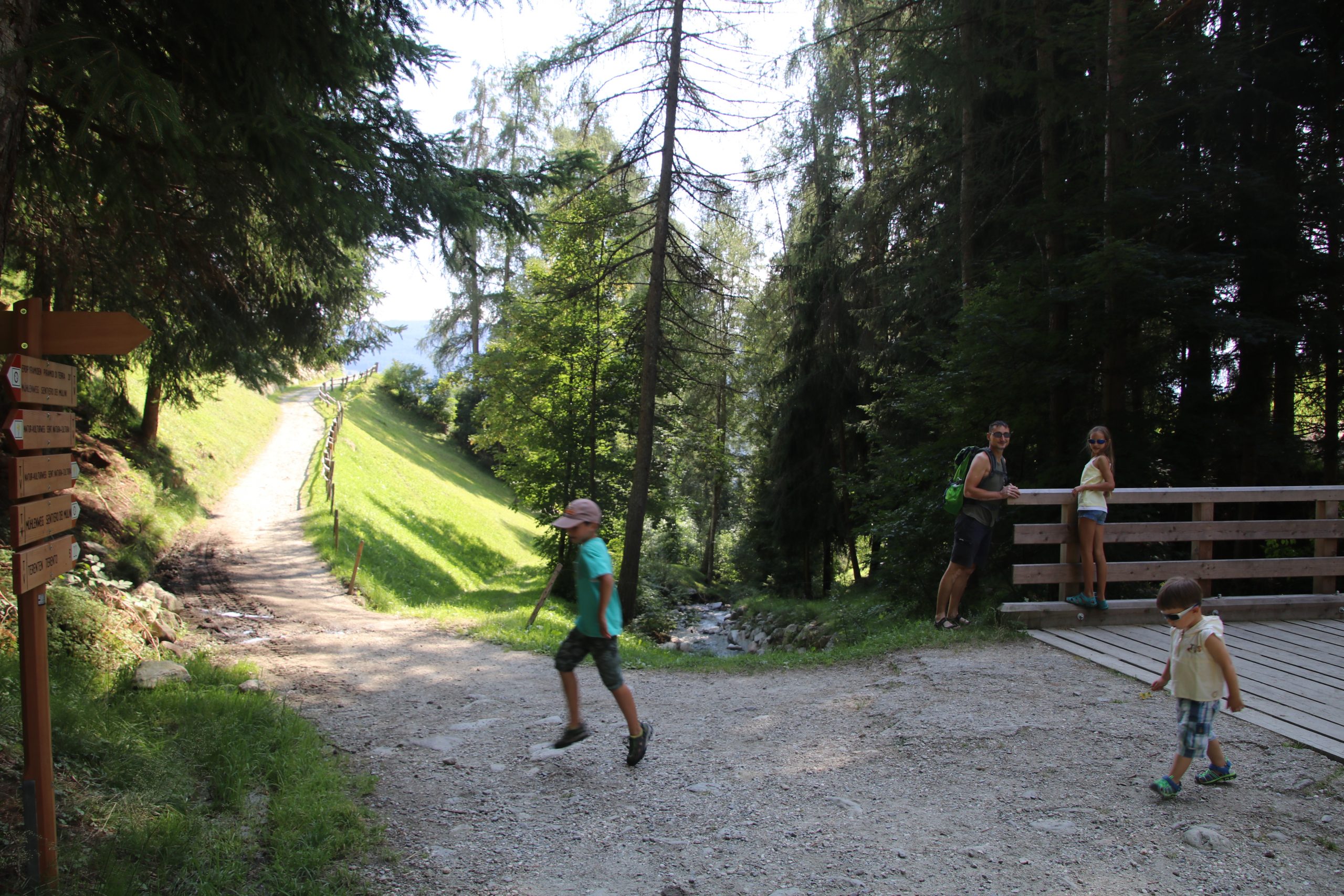 Nach dem Essen fahren wir etwa 20 Minuten bis nach Terento. Hier kühlen wir uns mit leckerer Eiscreme ein wenig runter. Danach starten wir eine kleine Wanderung. Es geht zunächst auf einem Waldweg parallel zu einem Bach steil bergauf.