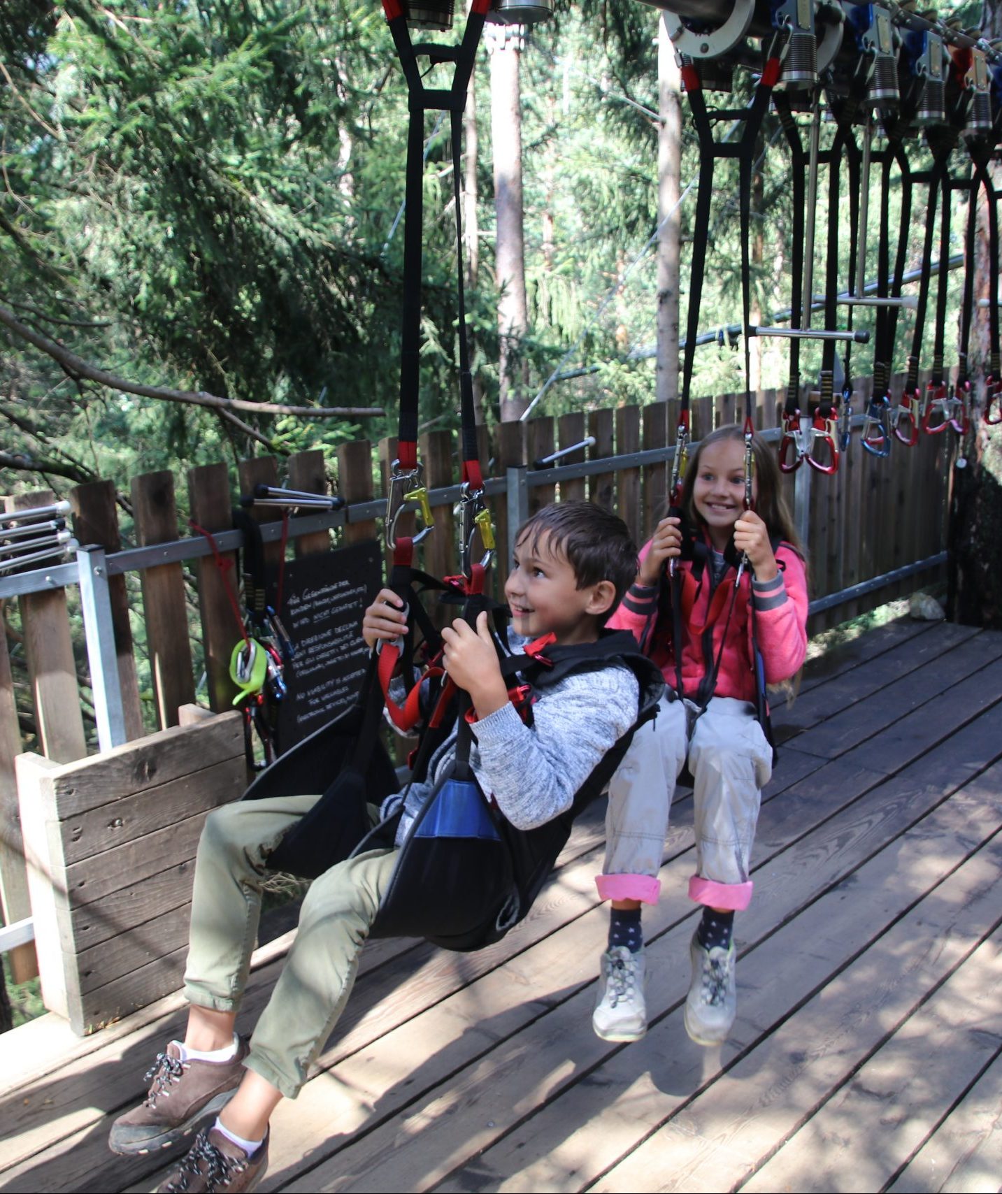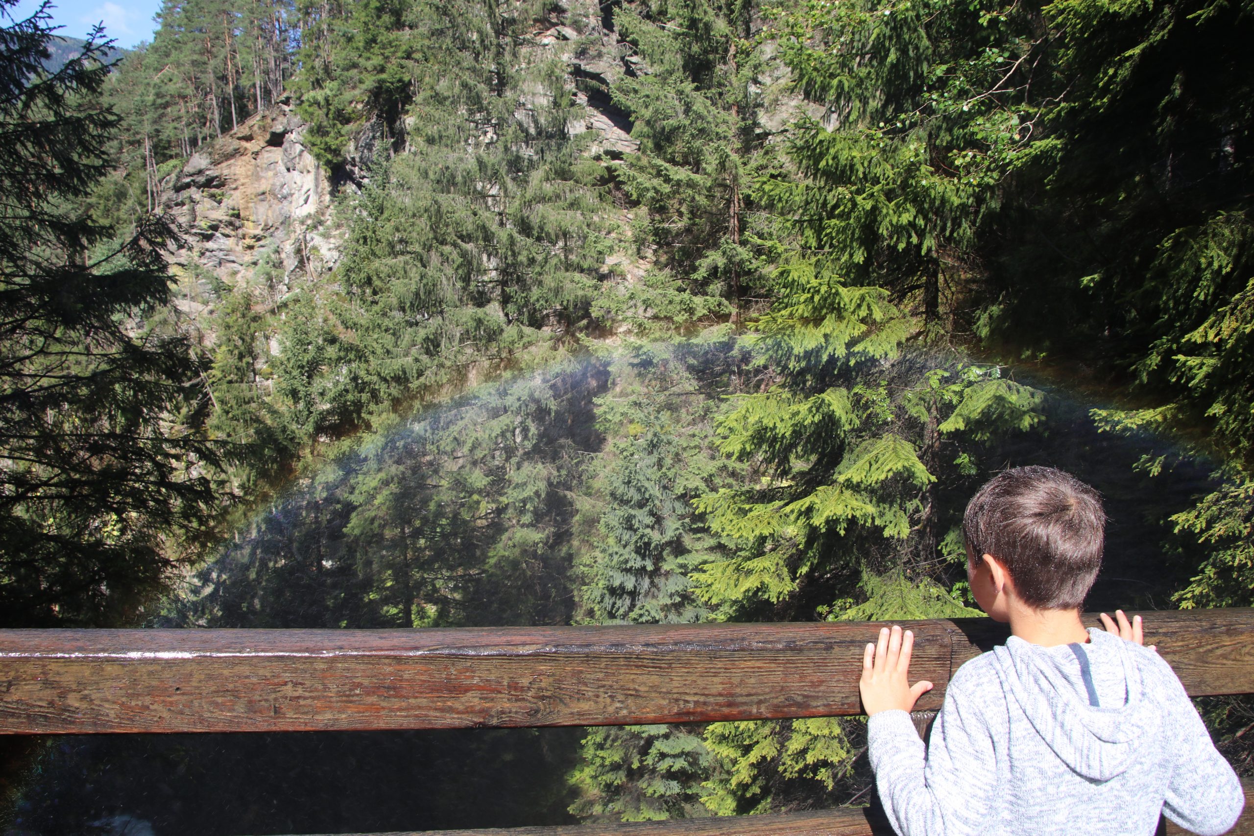 Nachdem alle genug vom Wasserfall abbekommen haben, machen wir ein Stück weiter eine kleine Pause und planen den Rückweg. Auf dem Wegweiser zeigt ein mit „Flyline“ beschrifteter Pfeil ins Tal. Das schauen wir uns natürlich an und entdecken einen spektakulären, bequemen (und leider auch recht teuren) Weg ins Tal zurück, den wir uns nicht entgehen lassen wollen.