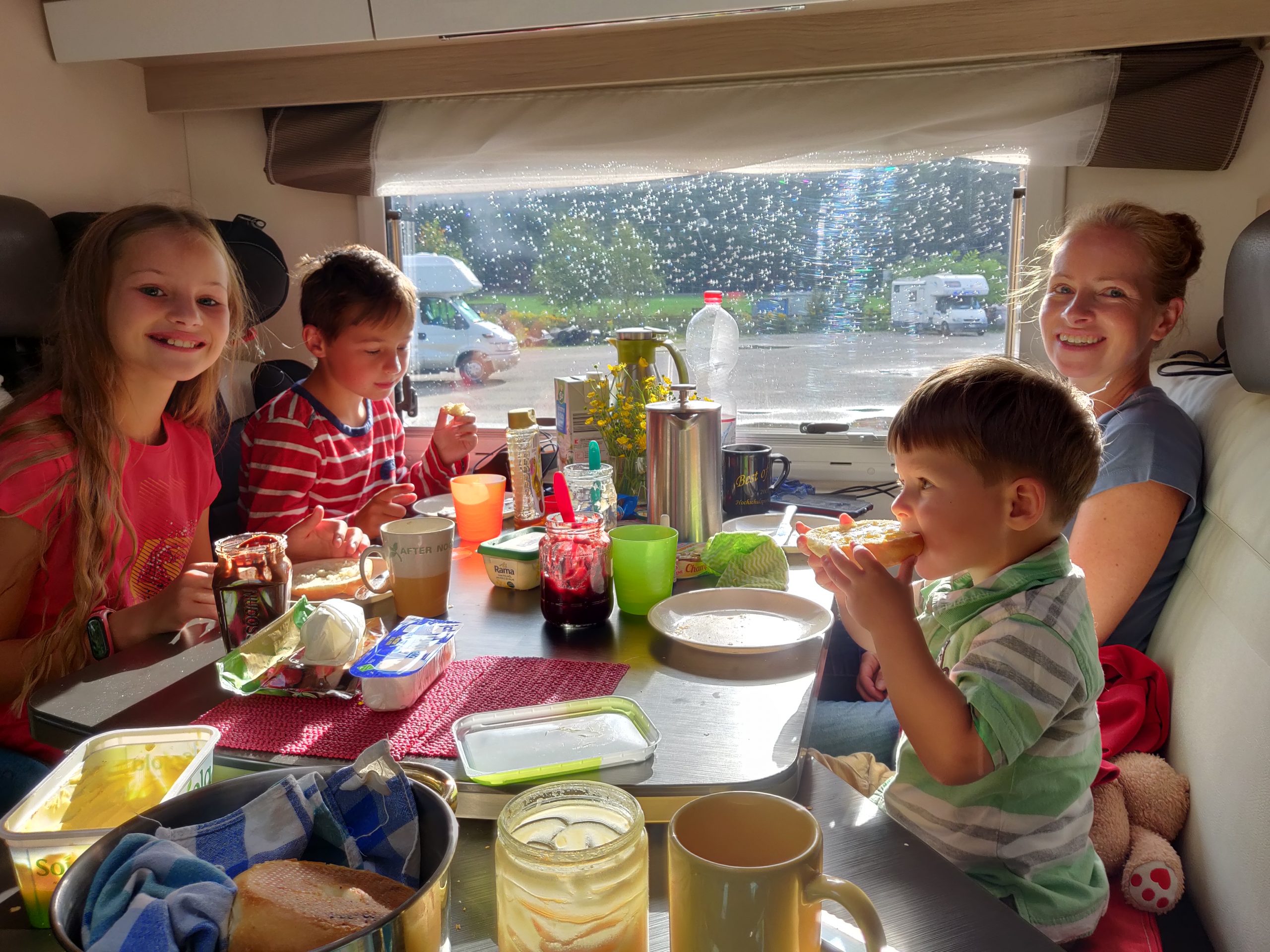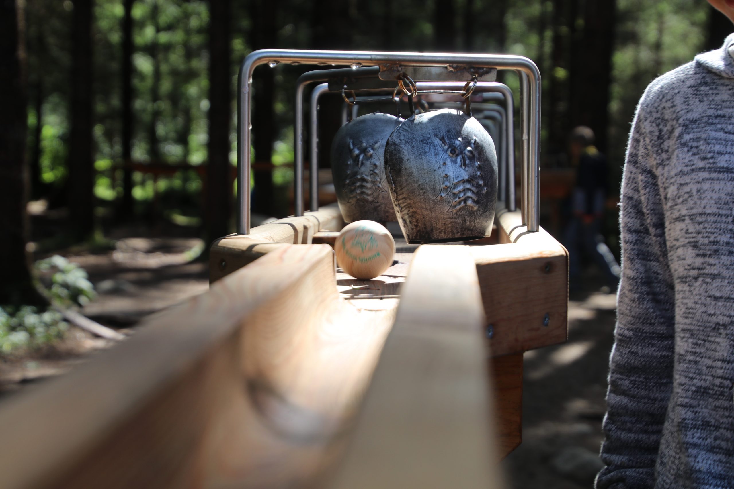 Nach einer rasanten Abfahrt quer durch den Wald stehen wir 5 Minuten später wieder unten beim Parkplatz. Ich lösche knapp 100 verwackelte Fotos von der Kamera. Anke geht schonmal zum Camper, das Mittagessen ansetzen, während ich mit den Kindern noch die tolle Outdoor-Kugelbahn im Wald ausprobiere.