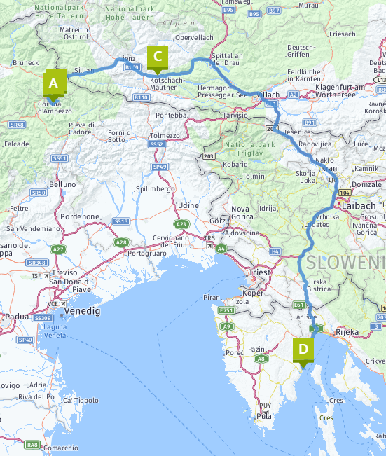 Wir parken vor dem ziemlich überteuerten Campingplatz am Waldbad, halten Familienrat und schauen etwas neidisch auf die sonnigen 30 Grad, nur wenige Autostunden südlich von uns. Schon bald steht die Entscheidung fest: wir wollen das schlechte Wetter im Süden aussitzen. Wir starten am Abend, machen eine Rast zum Abendbrot an der österreichischen Grenze nach Slovenien und stehen kurz nach 23 Uhr an der Adria. Hier ist es heute Nacht noch wärmer, als es morgen Mittag in Dellach überhaupt werden wird.