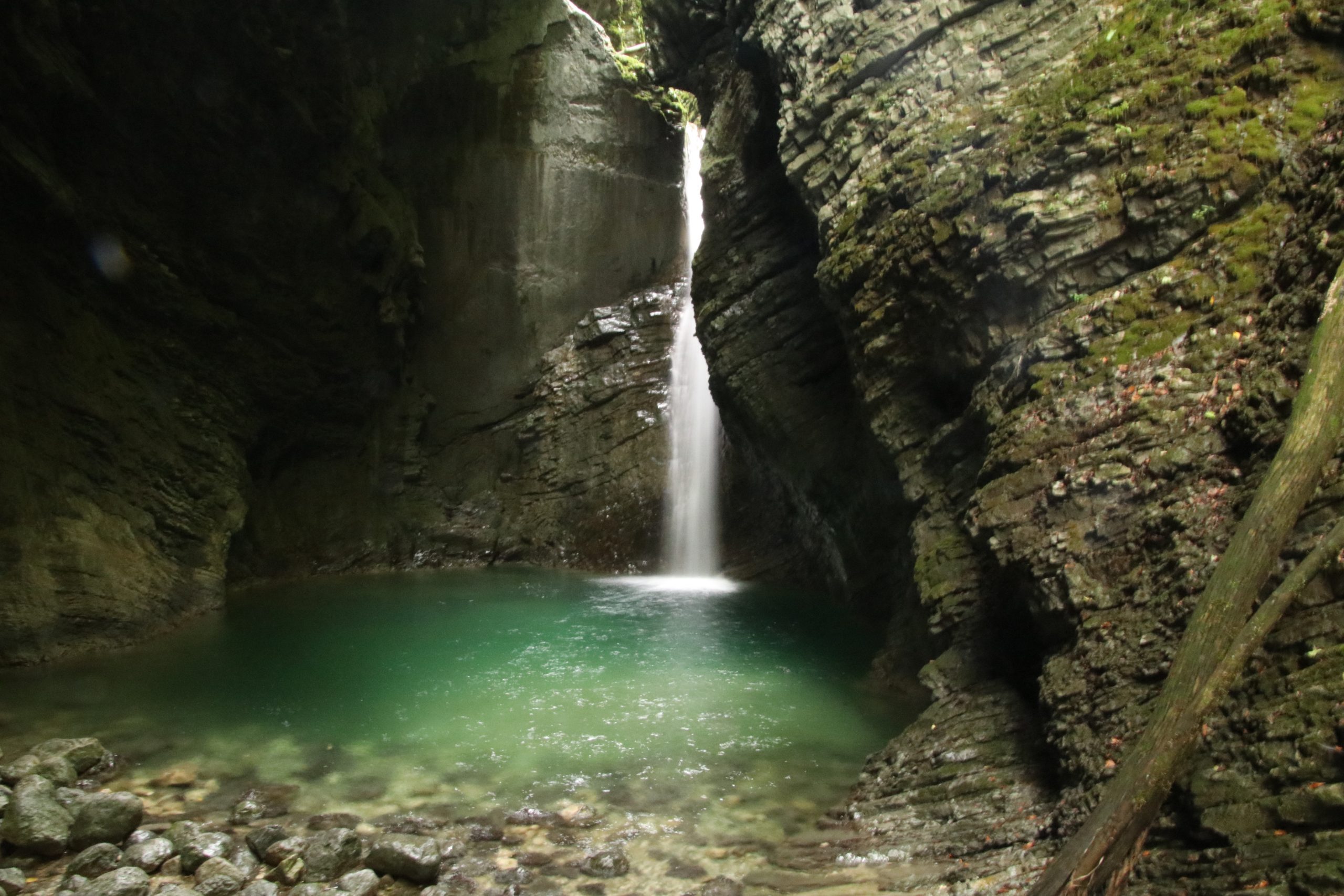 Der Weg zweigt entlang eines kleinen Nebenflusses in den Wald ab. Als wir den Wasserfall erreichen, ist es noch immer bewölkt. Da er aber tief versteckt zwischen hohen Felswänden liegt, ist es relativ egal, ob oben die Sonne scheint.