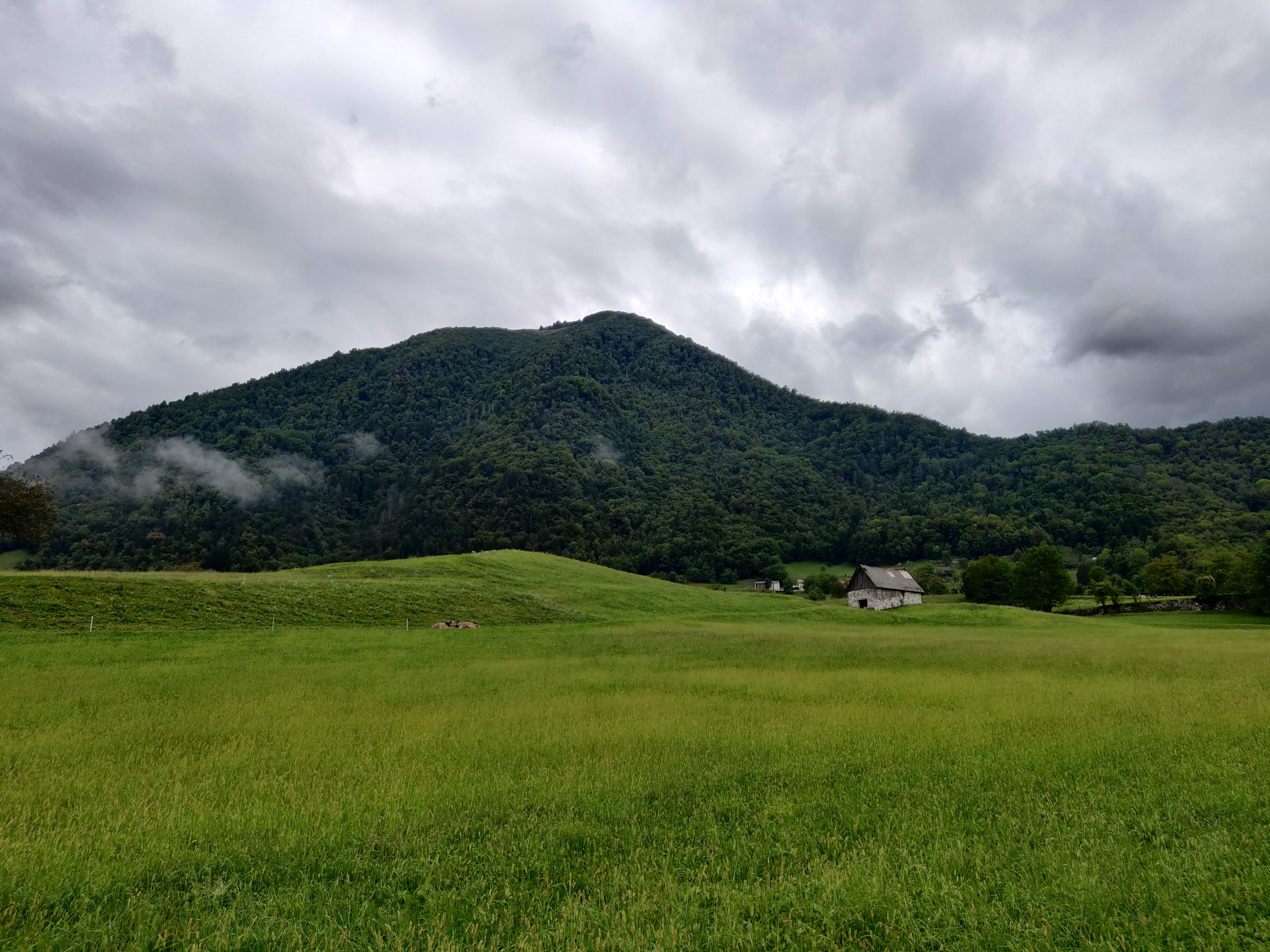 Der Weg führt uns über üppig grüne Wildblumenwiesen. Leider hängen die Wolken noch in den Bergen fest, aber für heute Vormittag ist zumindest kein Regen angesagt.