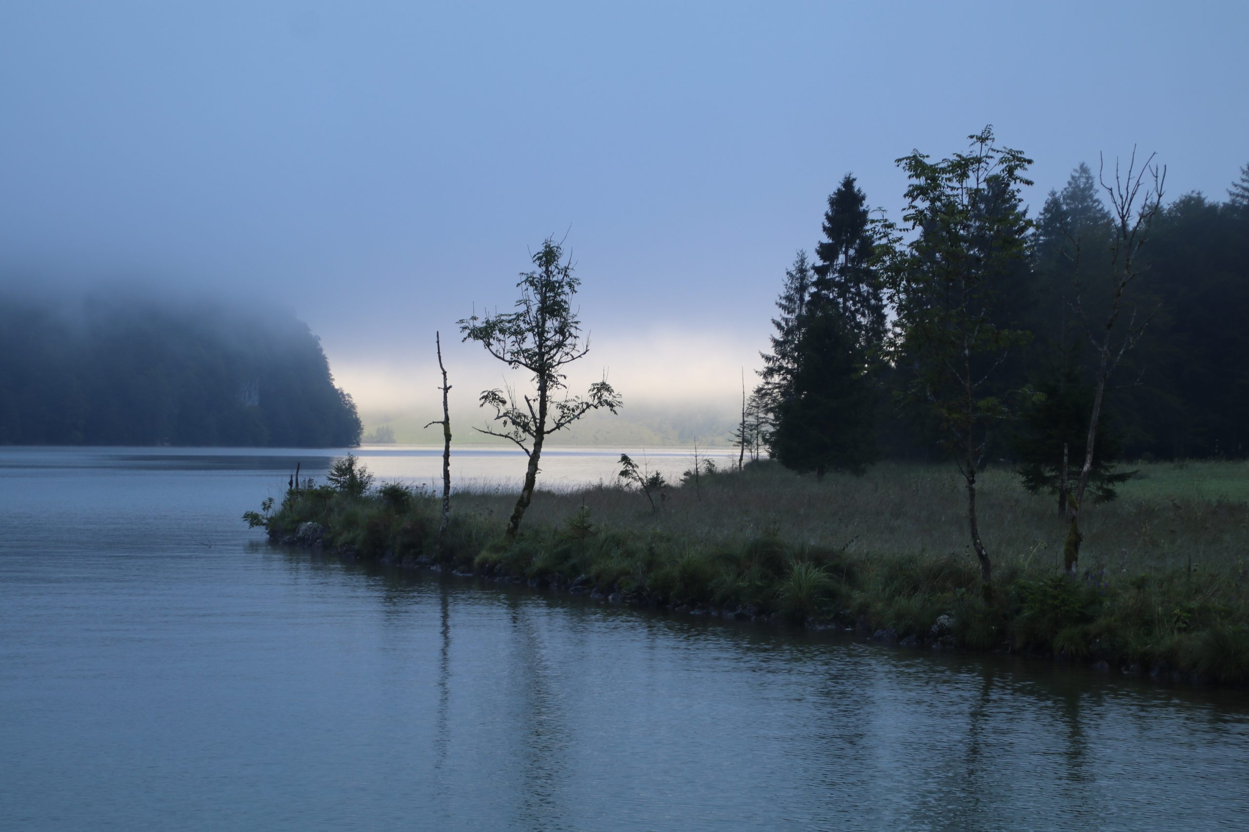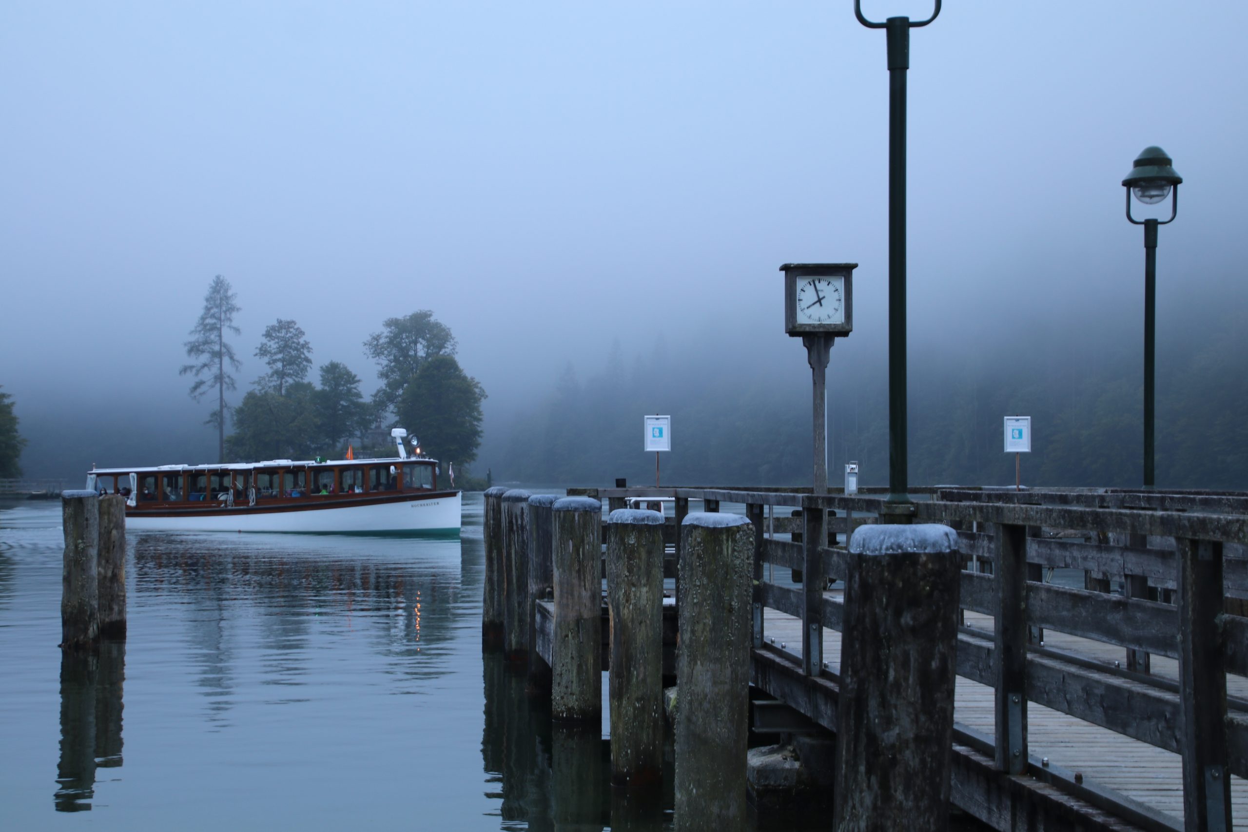 Wir haben gut geschlafen, obwohl hinter uns der Fluss ordentlich gerauscht hat. Recht zeitig machen wir uns startklar, um eines der ersten Boote über den Königssee zu bekommen. Auf dem Parkplatz ist dichter Nebel. Auch unten am Hafen hängt er noch tief über dem See. Alles schaut hier sehr mystisch aus.